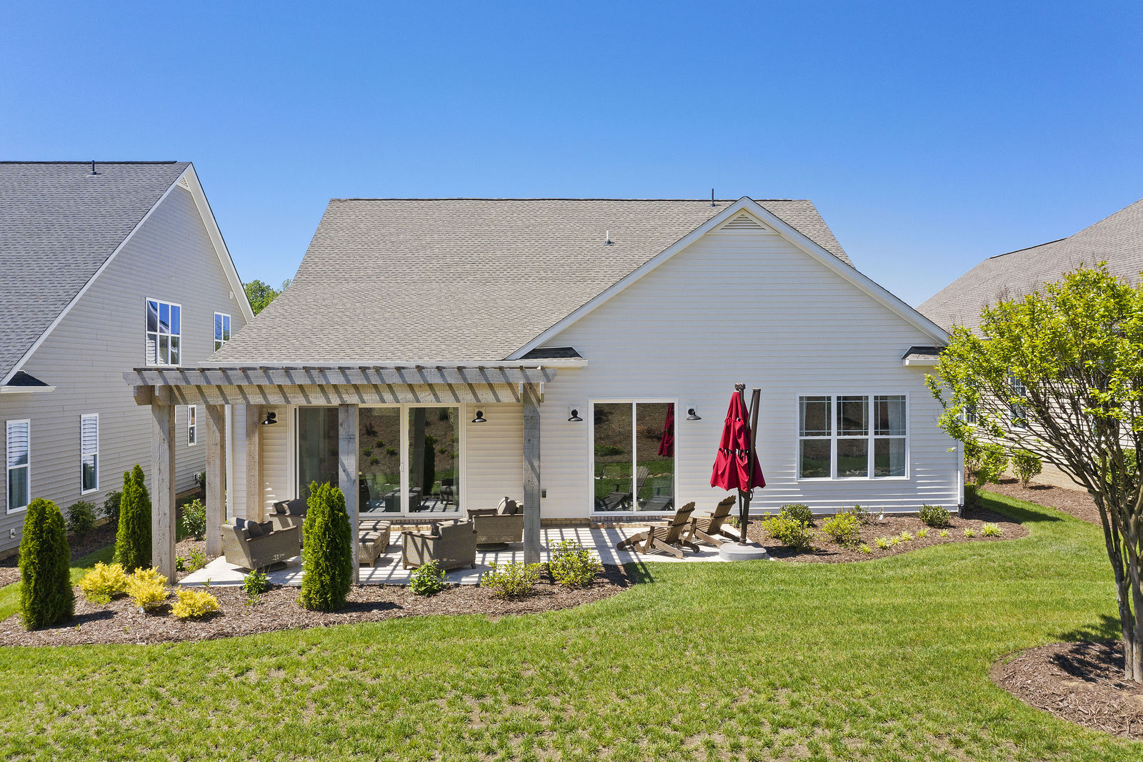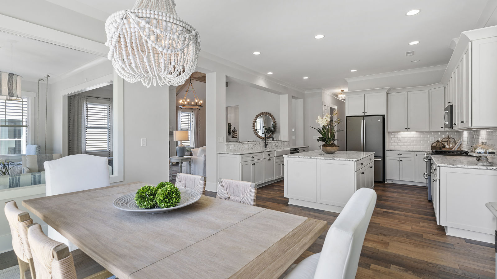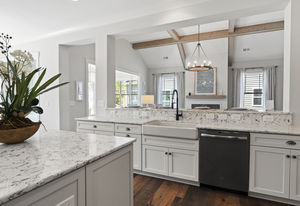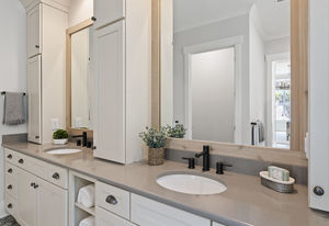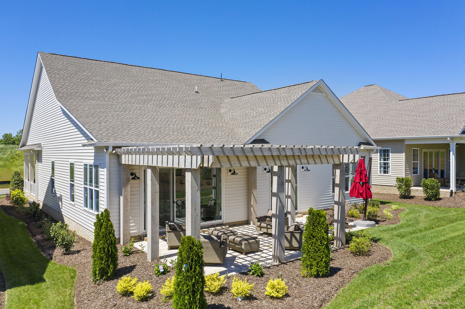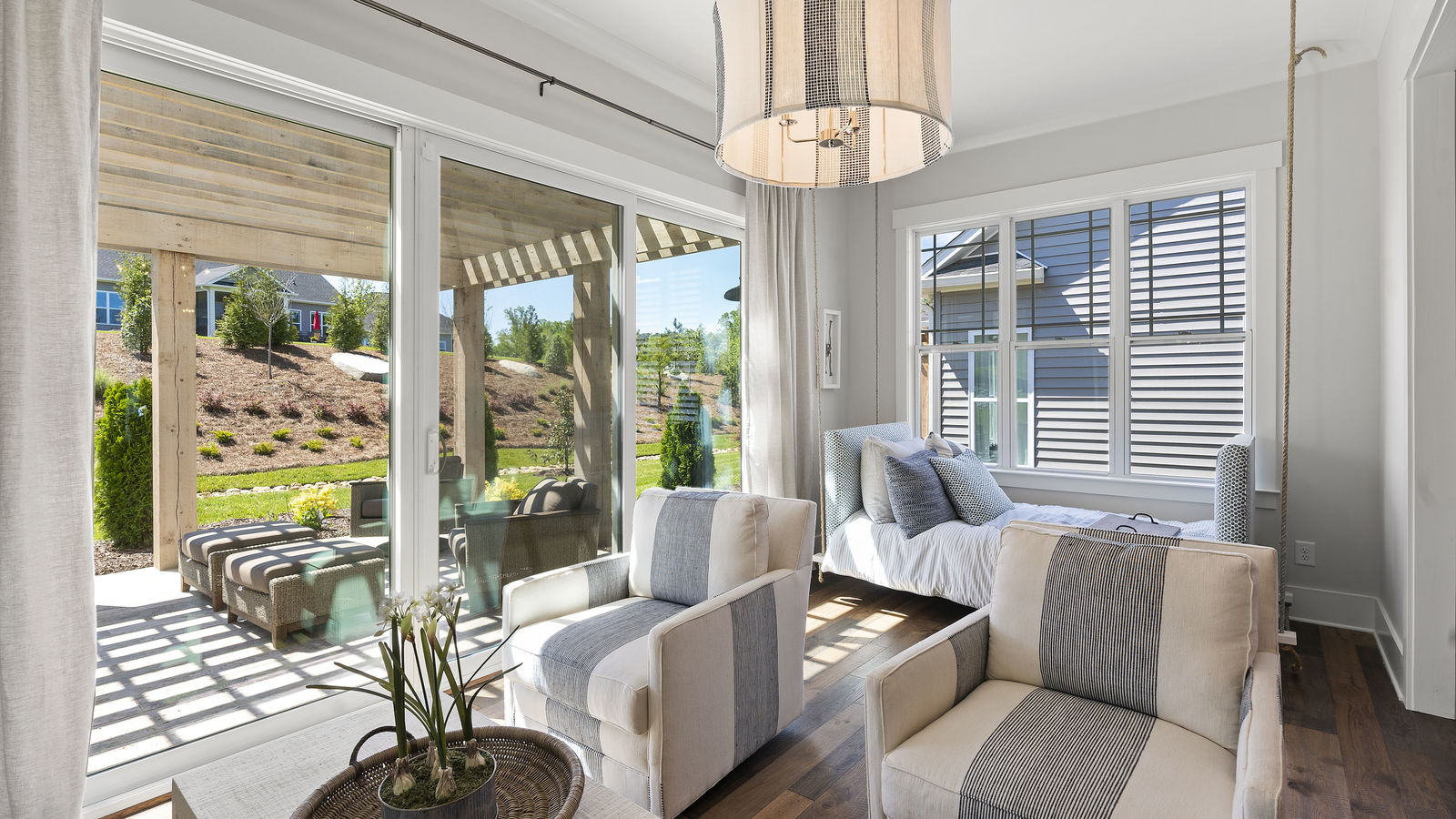 Wonderful opportunity to purchase this absolutely stunning model home in Lake Norman's premier active adult community! Beautifully decorated coastal farmhouse design with open floor plan. Charming and spacious covered front porch, vaulted ceilings with wood beams in Great Room, quartz counters in kitchen and baths, huge working island, breakfast bar, farmstyle sink, soft close cabinets/drawers, and slate appliances. Gorgeous wood flooring throughout! Unique deco tile in master bath with full tiled shower, frameless door and storage galore. Hall bath with tiled tub walls and farm style free-standing vanity. Direct access from master bath to large laundry room. 3rd bedroom is set up as study. Gorgeous sun room leads to huge travertine patio and cedar pergola! Stylish ship lap accents, craftsman molding package, beautiful lighting, and wonderful open floor plan! Home is subject to 2 to 3 year builder lease back.