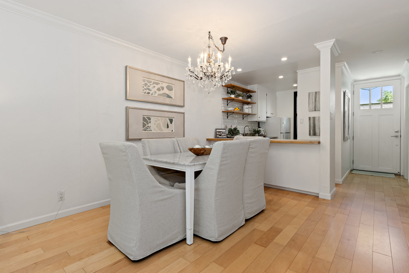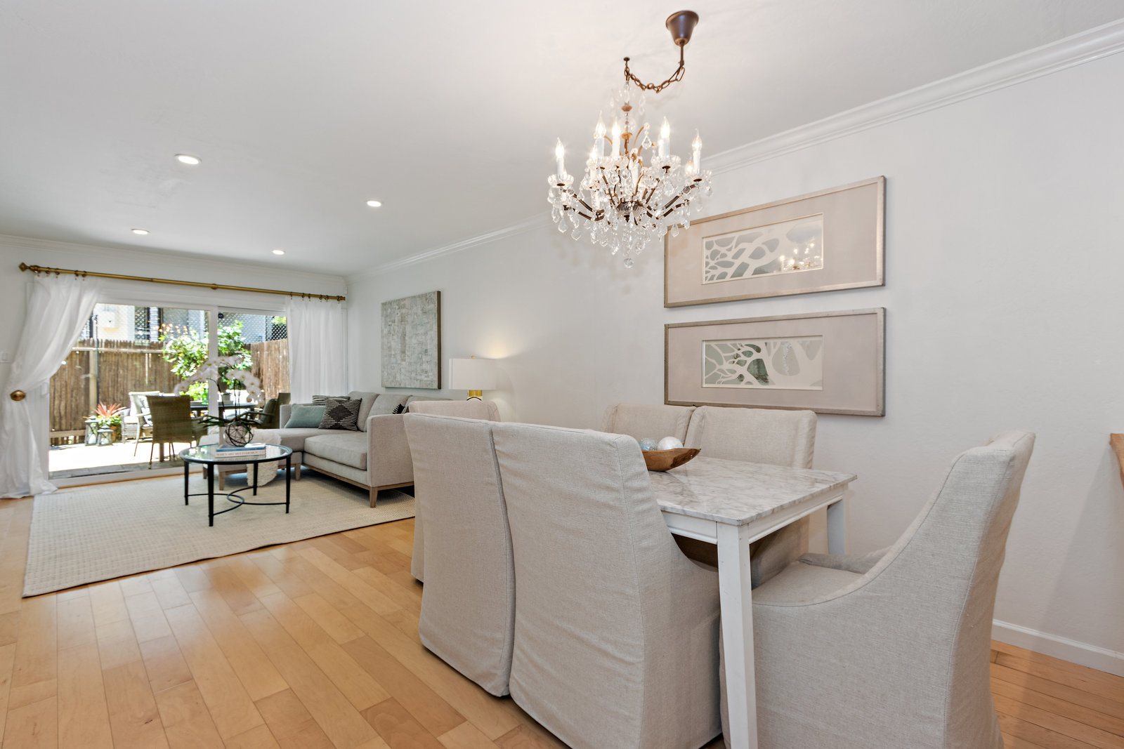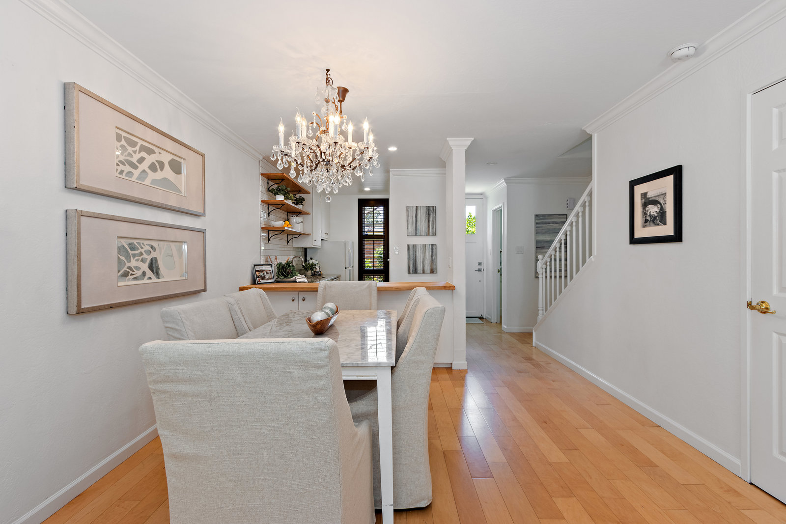 This updated home offers a functional floor plan bathed in natural light that is filled with upgrades throughout! The great room flows to a fenced private patio for easy relaxation and entertaining! The kitchen is outfitted with granite countertops, butcher block bar area, and subway tile backsplash and opens to the dining area with a stunning Restoration Hardware chandelier. The ½ bathroom with its enjoys shaker panel walls Restoration Hardware lighting, medicine cabinet and accessories. Upstairs are two bedrooms, each with mirrored closet doors opening to built-in closet systems for great storage; one enjoys a large window with plantation shutters and the other has a sunny balcony. The primary bathroom has been tastefully remodeled with Carrara Marble counters and tile, Restoration Hardware double-sink vanity and finishes. The complex features common areas for recreation and a community swimming pool. Enjoy carefree living here in Creekside North – including access to the Iron Horse Trail! Located in the heart of downtown Walnut Creek with everything that offers!