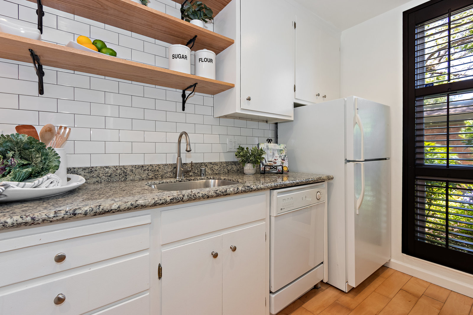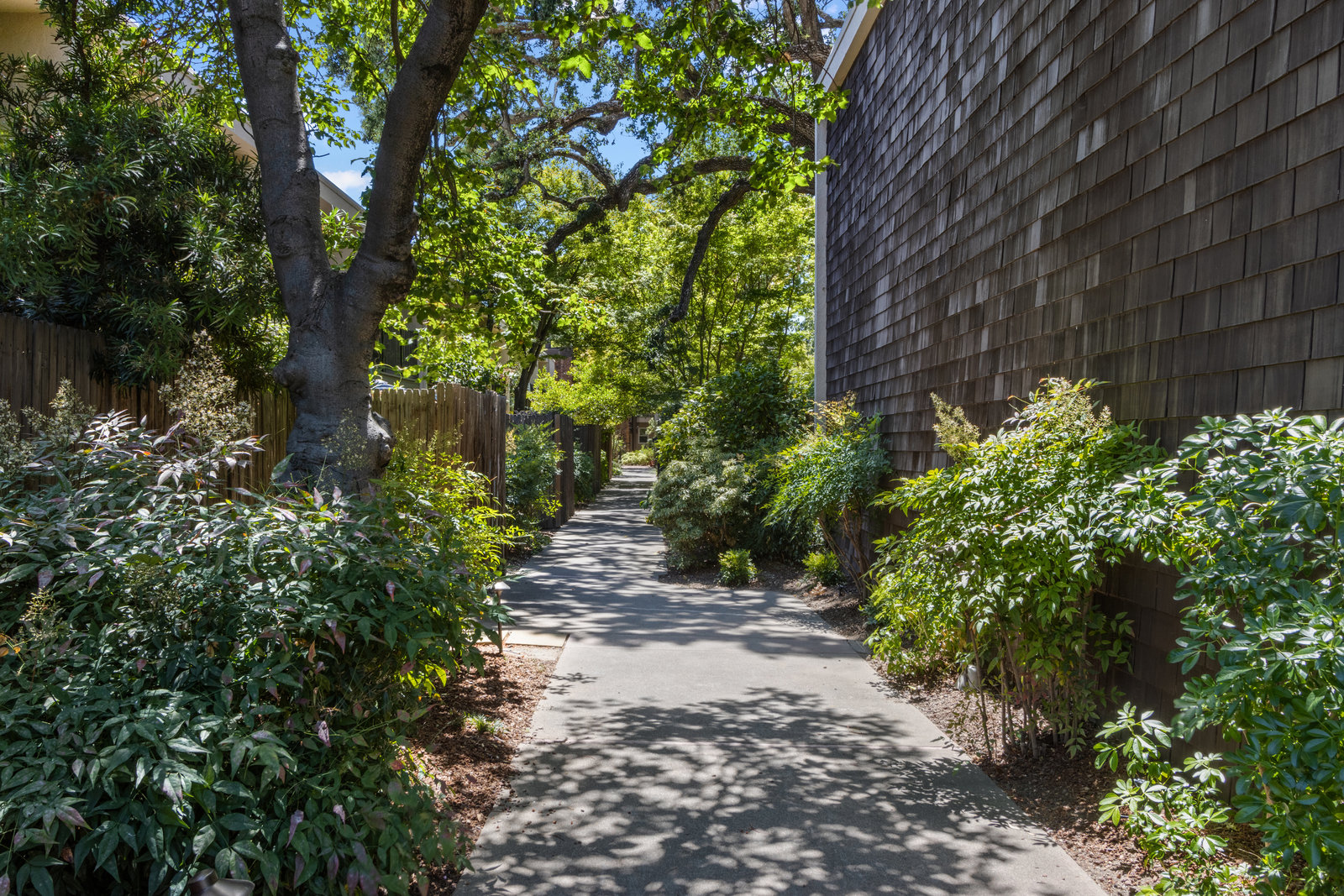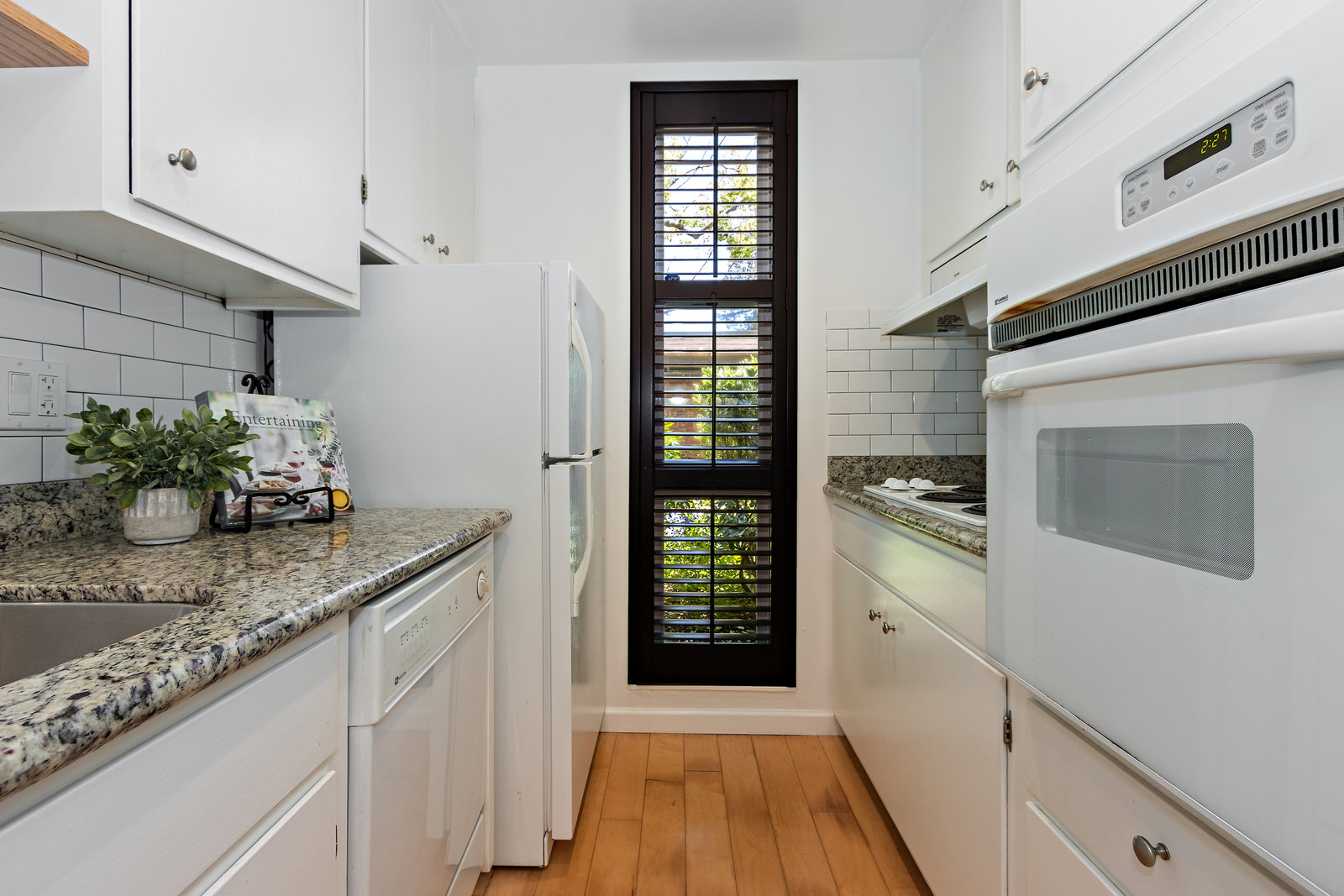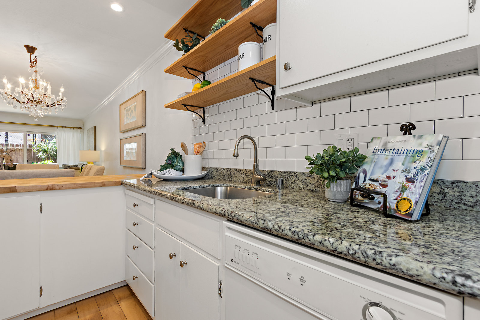 This updated home offers a functional floor plan bathed in natural light that is filled with upgrades throughout! The great room flows to a fenced private patio for easy relaxation and entertaining! The kitchen is outfitted with granite countertops, butcher block bar area, and subway tile backsplash and opens to the dining area with a stunning Restoration Hardware chandelier. The ½ bathroom with its enjoys shaker panel walls Restoration Hardware lighting, medicine cabinet and accessories. Upstairs are two bedrooms, each with mirrored closet doors opening to built-in closet systems for great storage; one enjoys a large window with plantation shutters and the other has a sunny balcony. The primary bathroom has been tastefully remodeled with Carrara Marble counters and tile, Restoration Hardware double-sink vanity and finishes. The complex features common areas for recreation and a community swimming pool. Enjoy carefree living here in Creekside North – including access to the Iron Horse Trail! Located in the heart of downtown Walnut Creek with everything that offers!