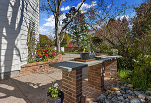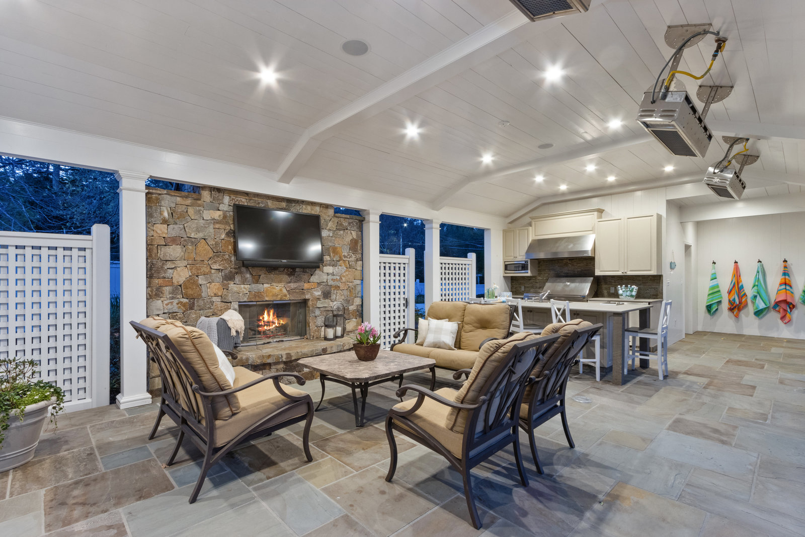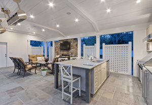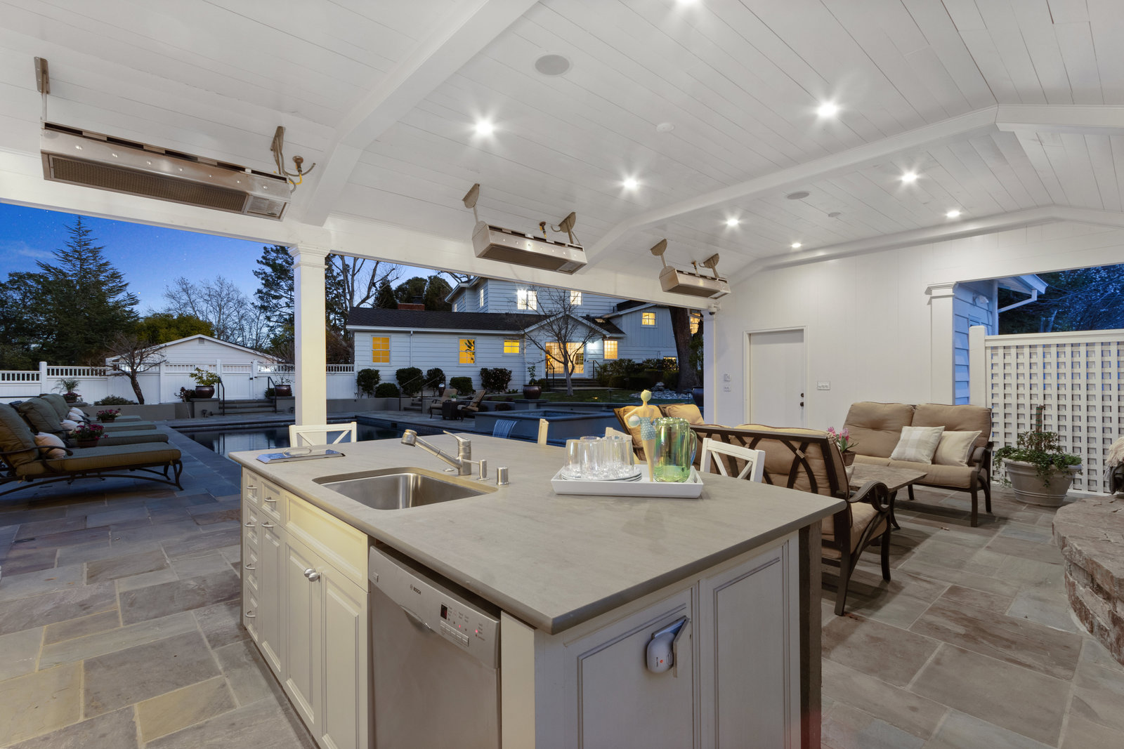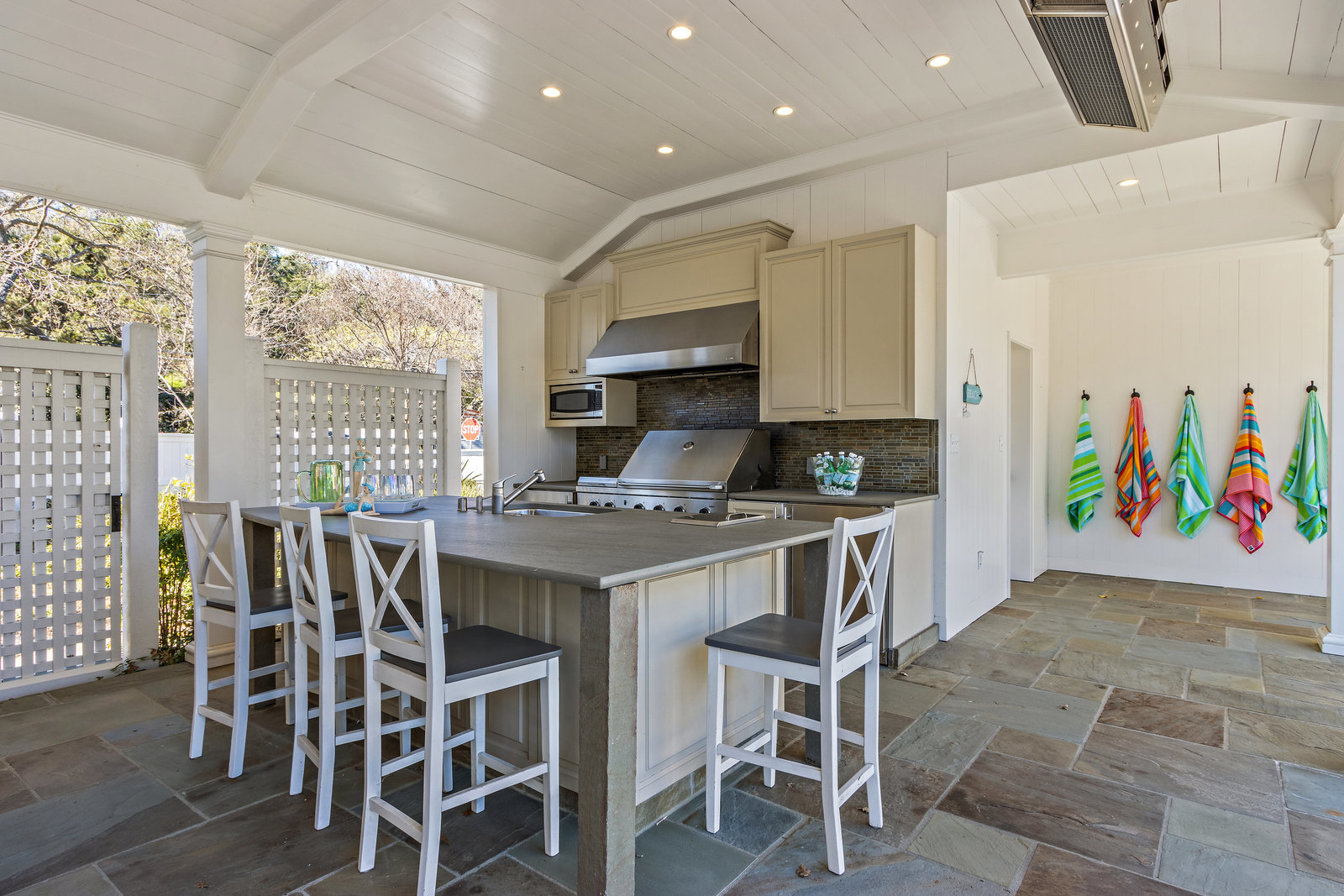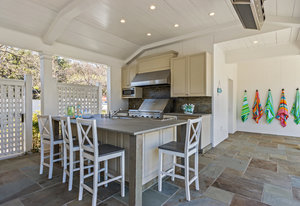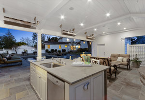 The pool pavilion has every amenity you could desire. The outdoor kitchen features two refrigerators, ice maker, grill, microwave, dishwasher, sink - all stainless steel, plentiful bar seating. Abundant living area with the television in tv stone wall above the outdoor fireplace with gas starter. Heat lamps for year round enjoyment, and built in lighting and integrated speaker system. A fantastic pool bath includes an outdoor shower and double sinks. Garden area behind the pavilion includes raised vegetable beds.