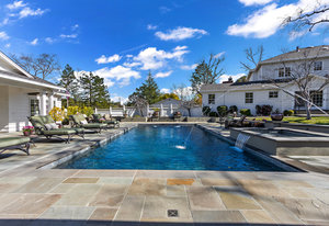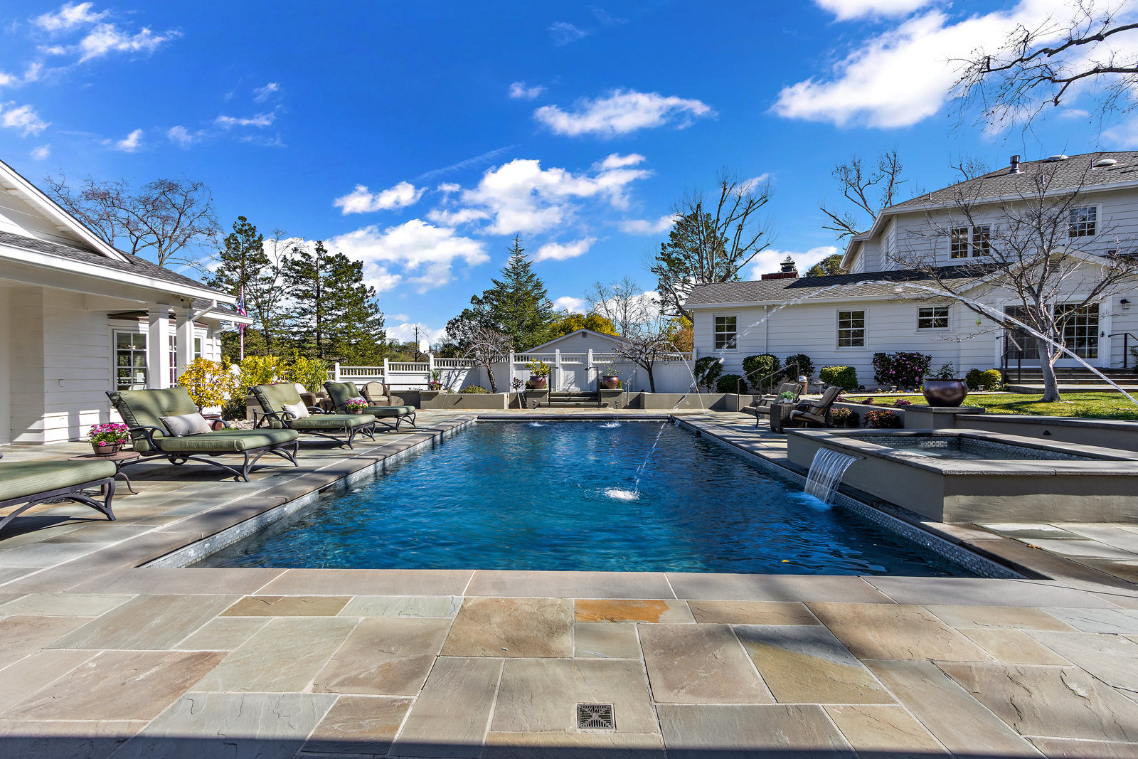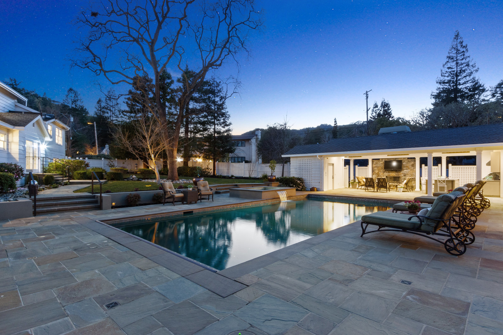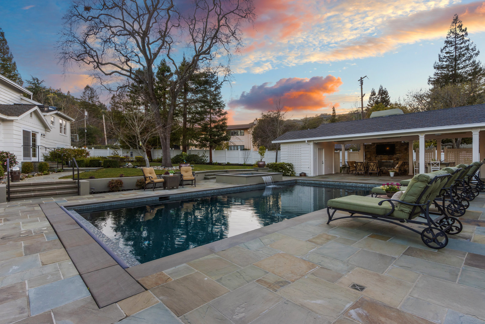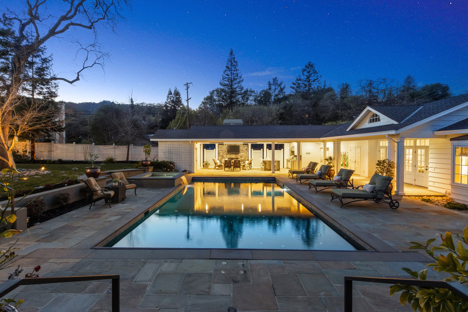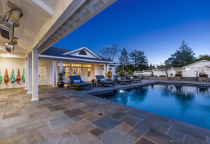 The unforgettable outdoor pool pavilion includes a spacious swimming pool with fountains, led twinkle lights on the pool floor, automatic cover and wonderful spa complete with waterfall.