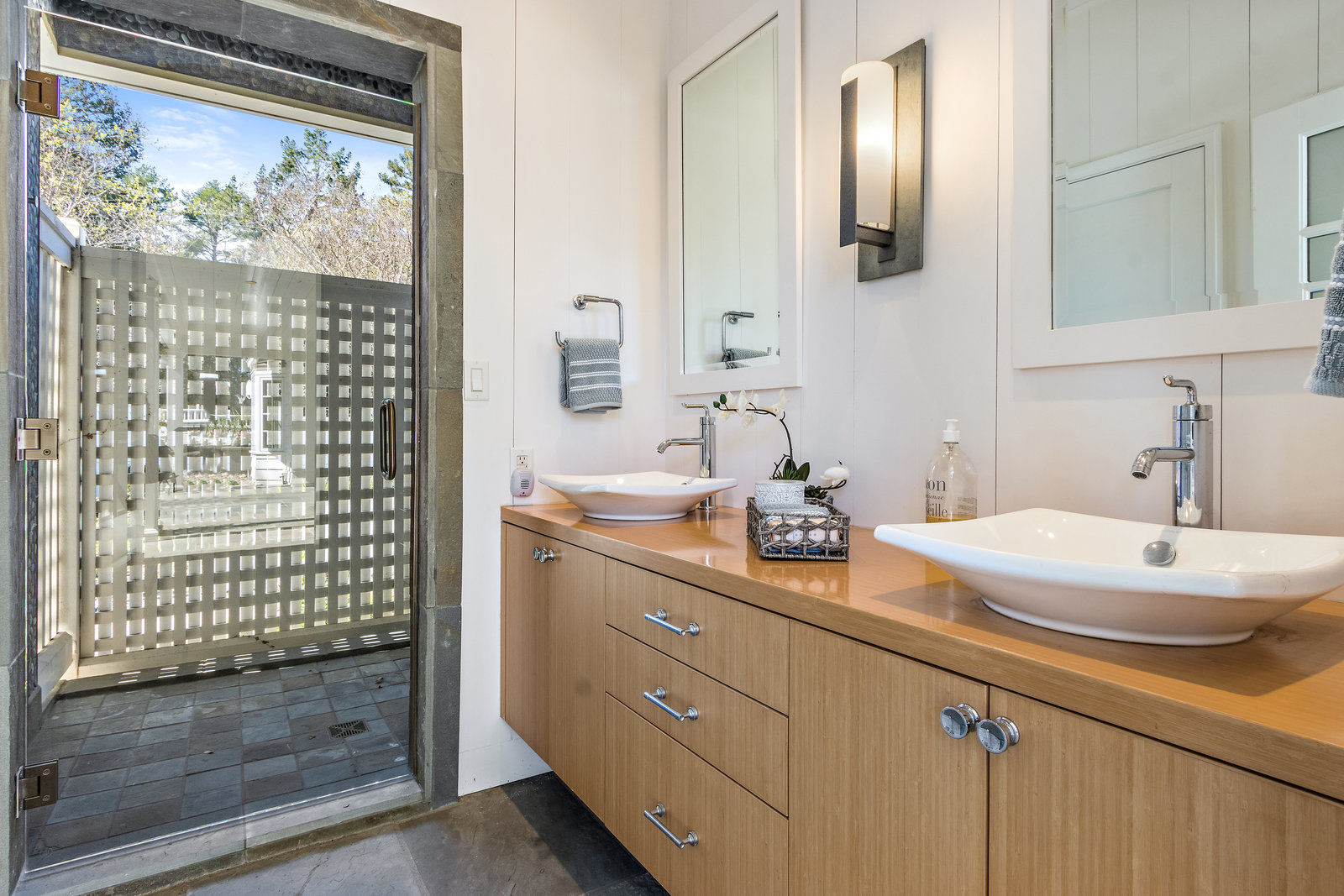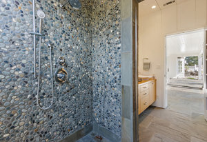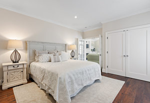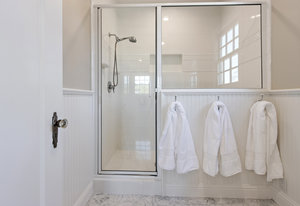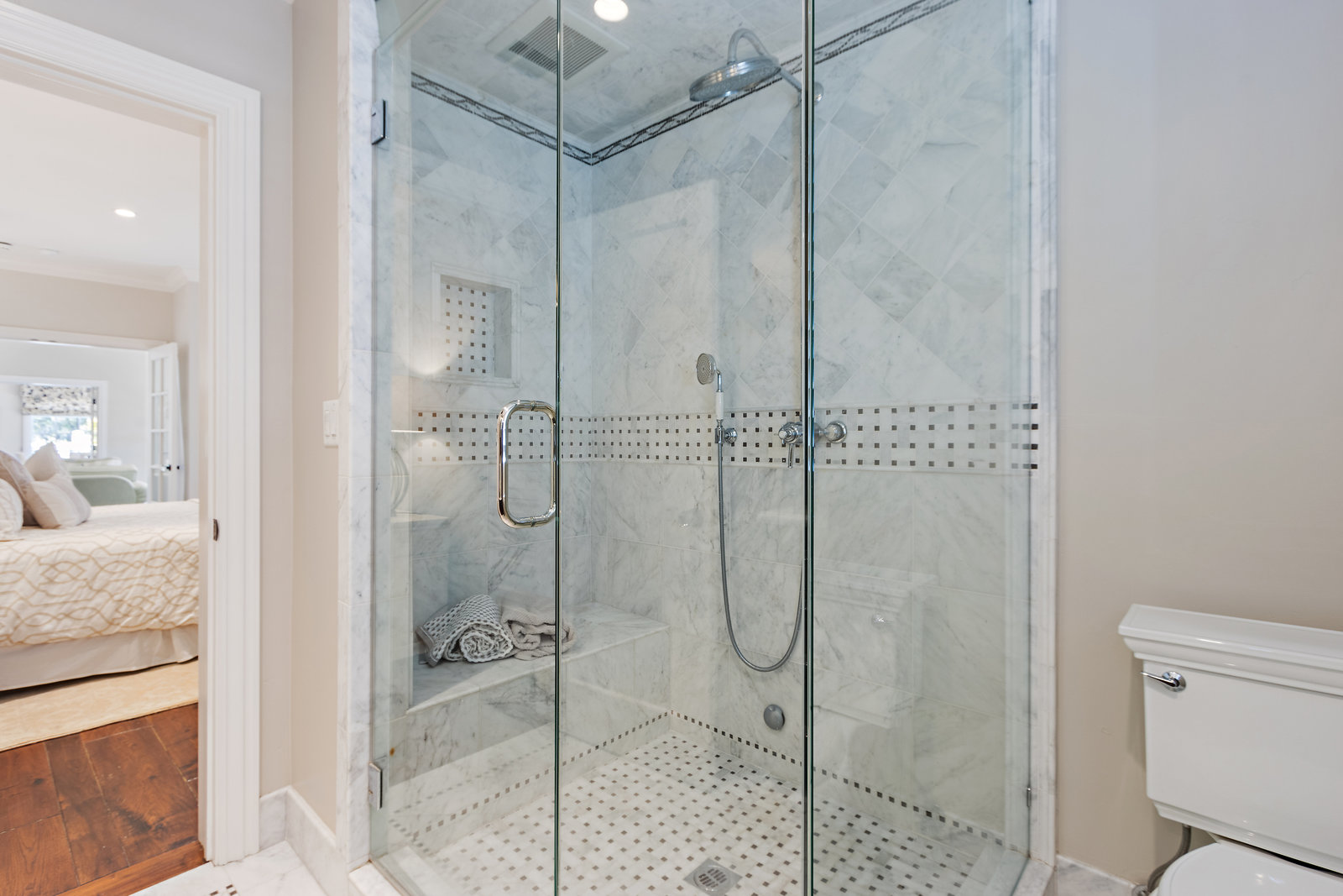 The primary suite has exterior access and an adjacent bath with warm wood cabinetry, carrera marble counters, nickel finishes and large shower with dual shower head glass frameless glass door.