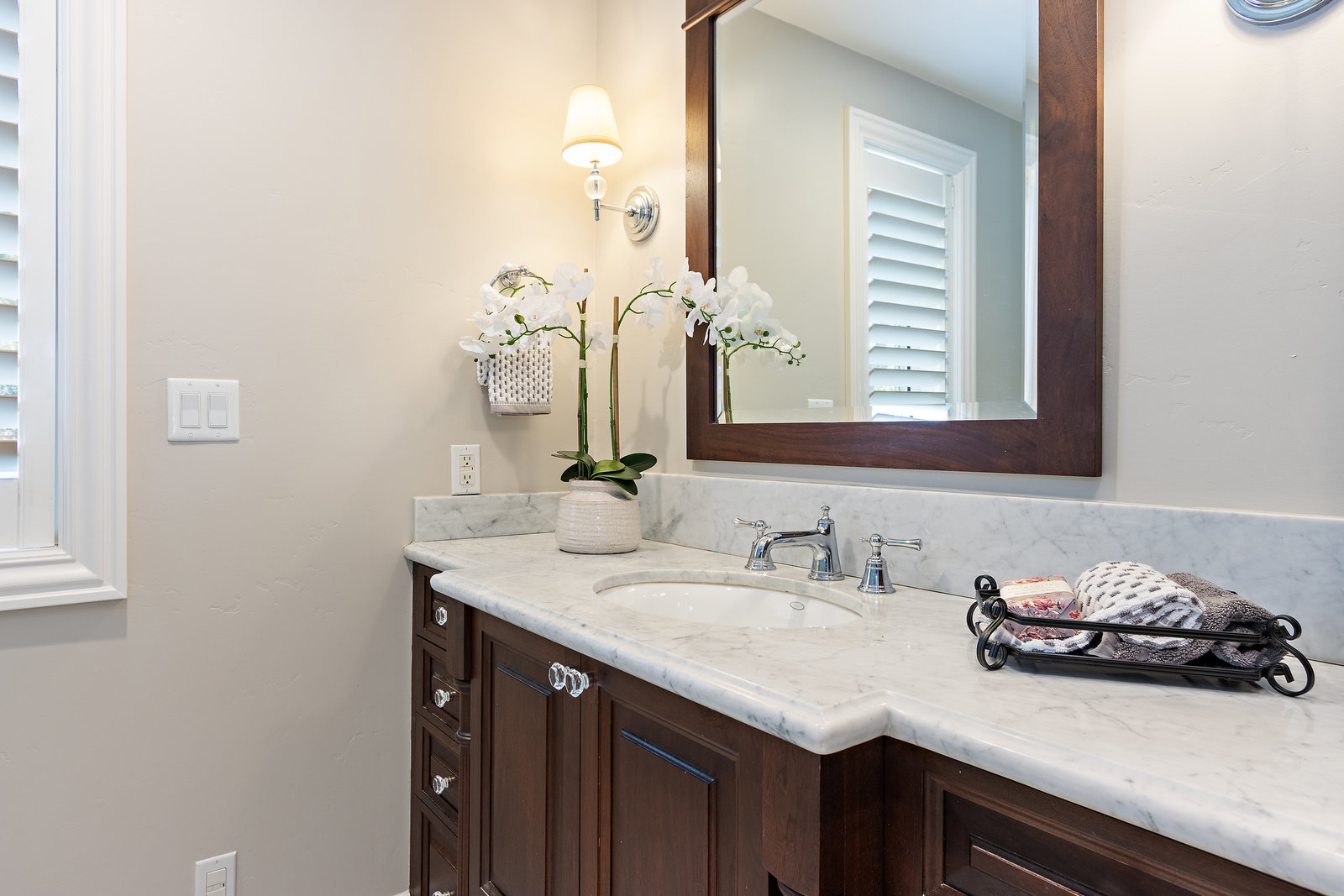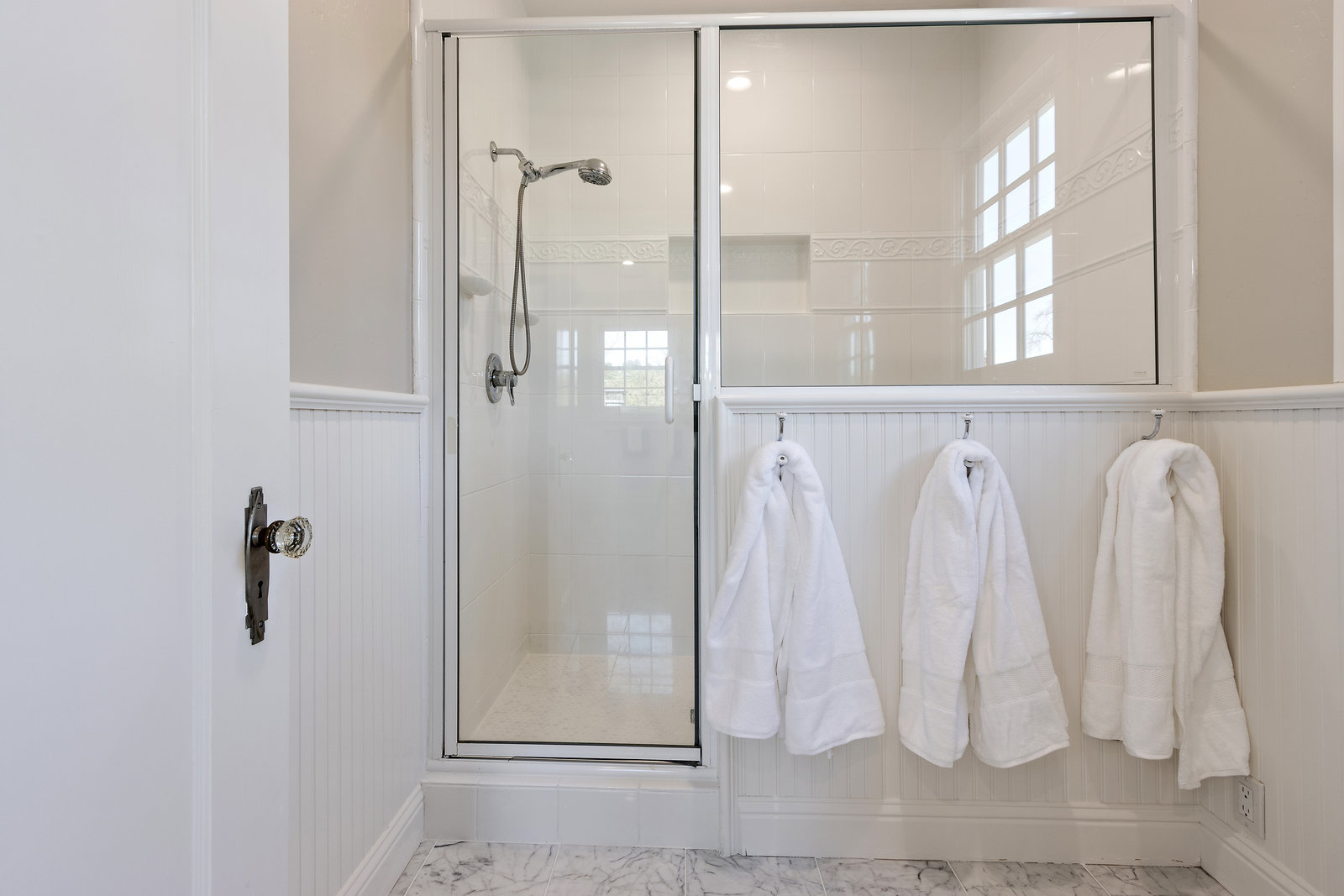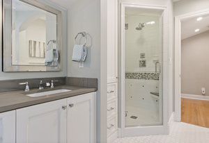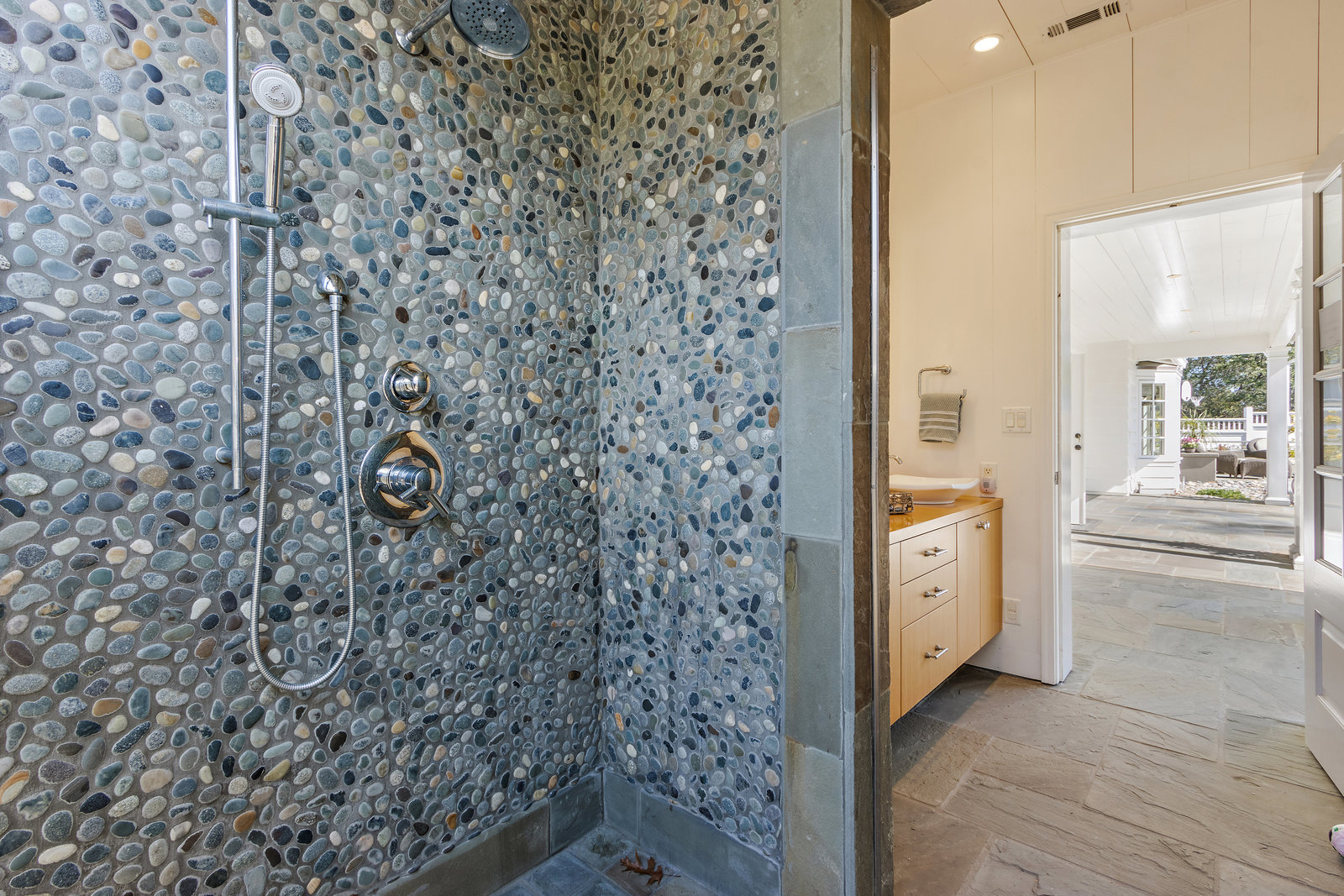 The primary suite has exterior access and an adjacent bath with warm wood cabinetry, carrera marble counters, nickel finishes and large shower with dual shower head glass frameless glass door.