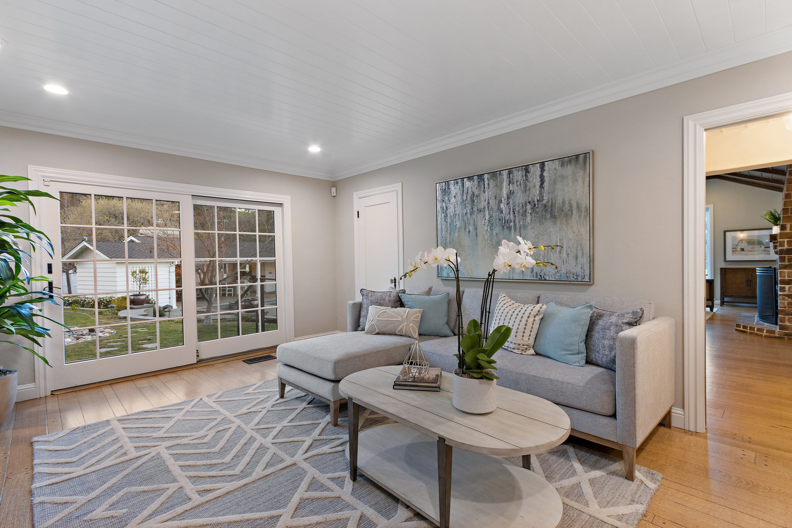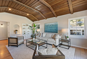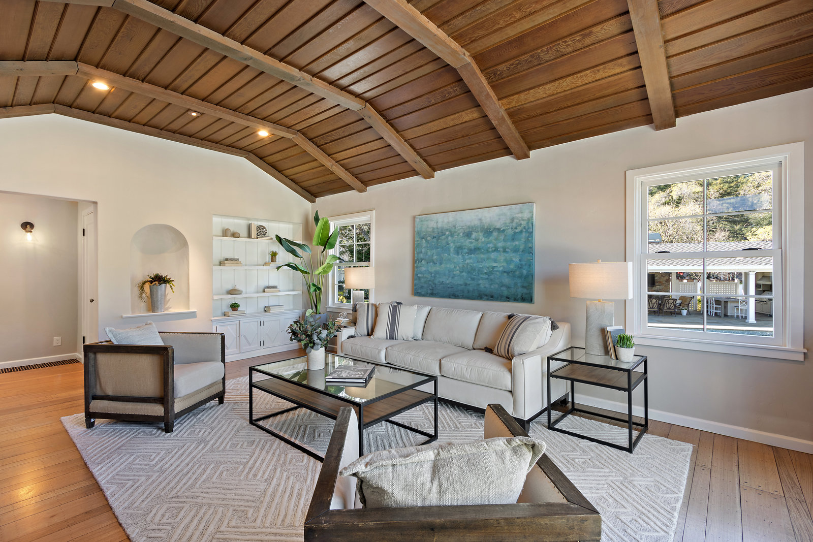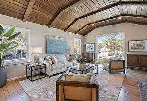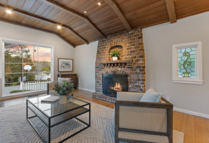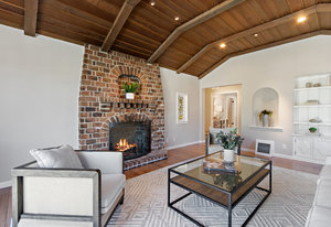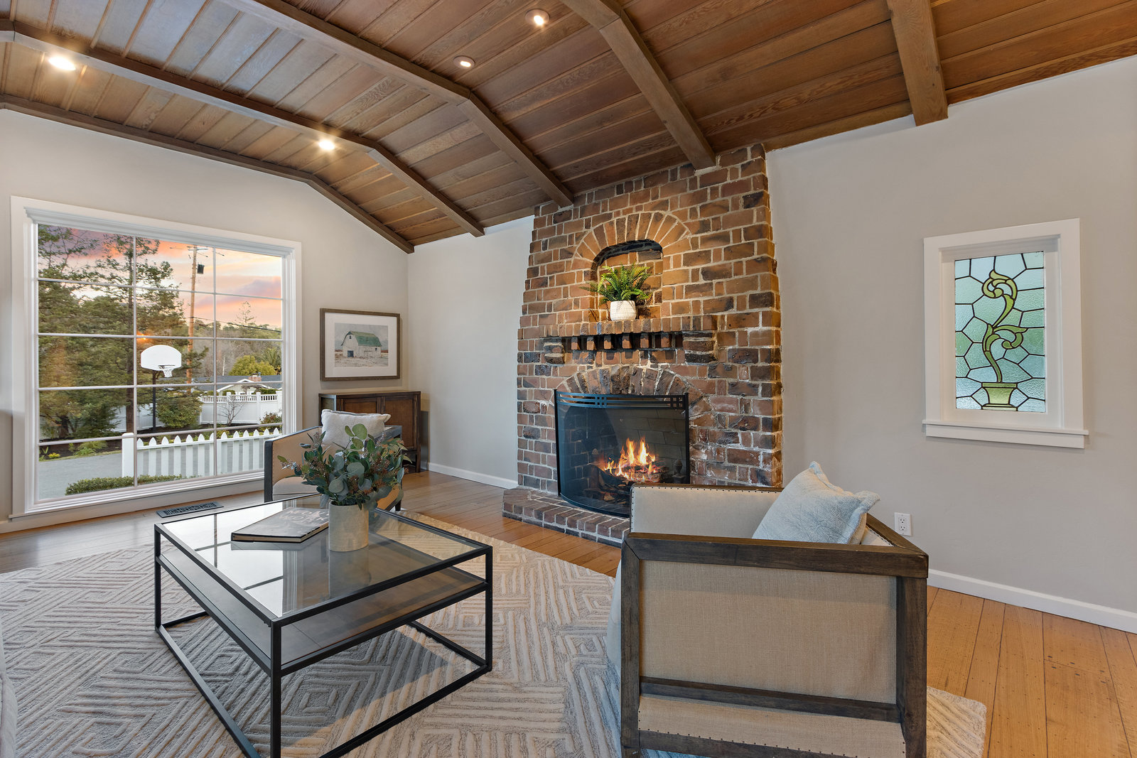 The gracious formal living room with vaulted wood ceiling, built-in cabinetry, hardwood floors, gorgeous floor to ceiling windows, and stunning yet classic brick wood-burning fireplace.