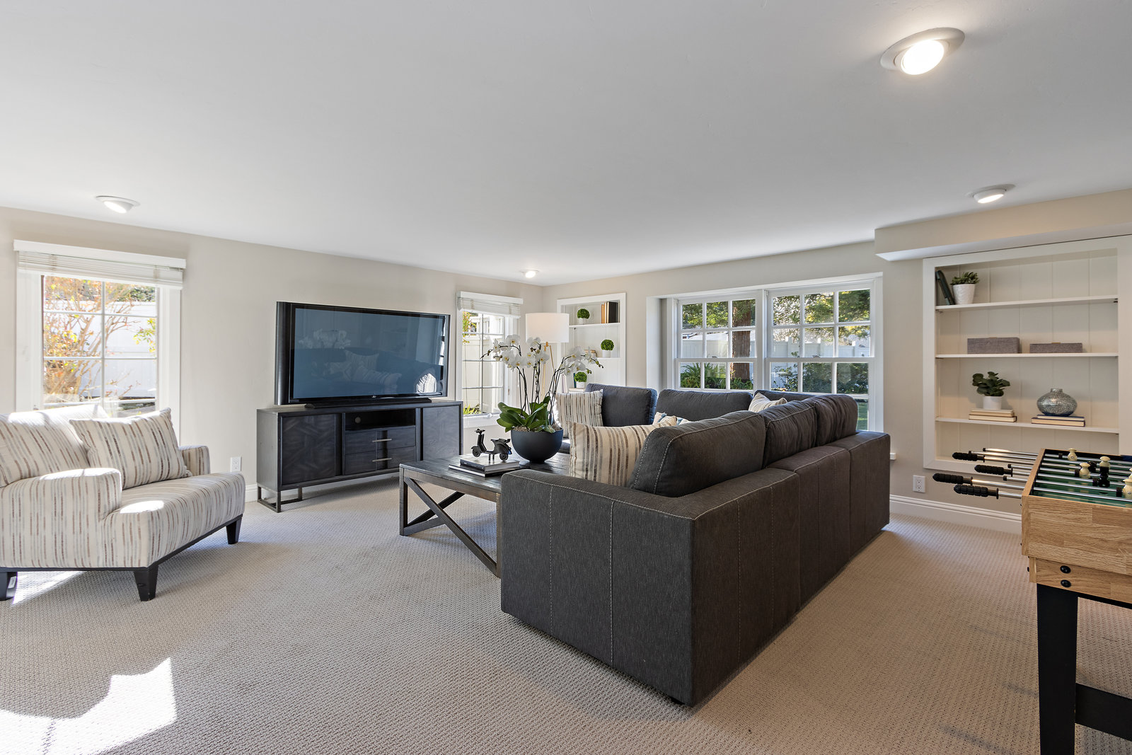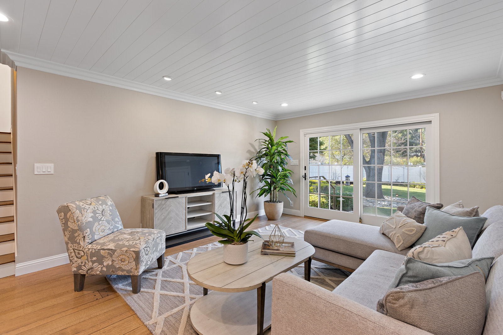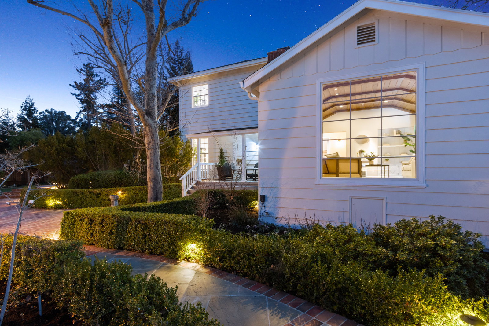 The gracious formal living room with vaulted wood ceiling, built-in cabinetry, hardwood floors, gorgeous floor to ceiling windows, and stunning yet classic brick wood-burning fireplace.