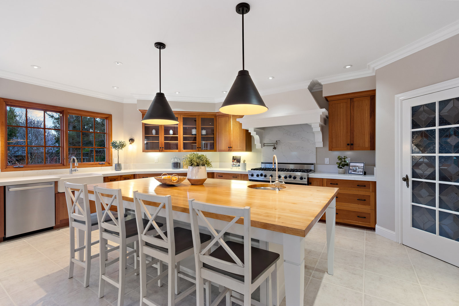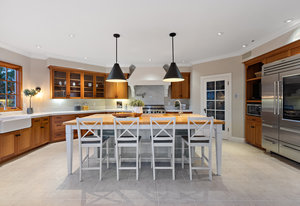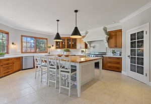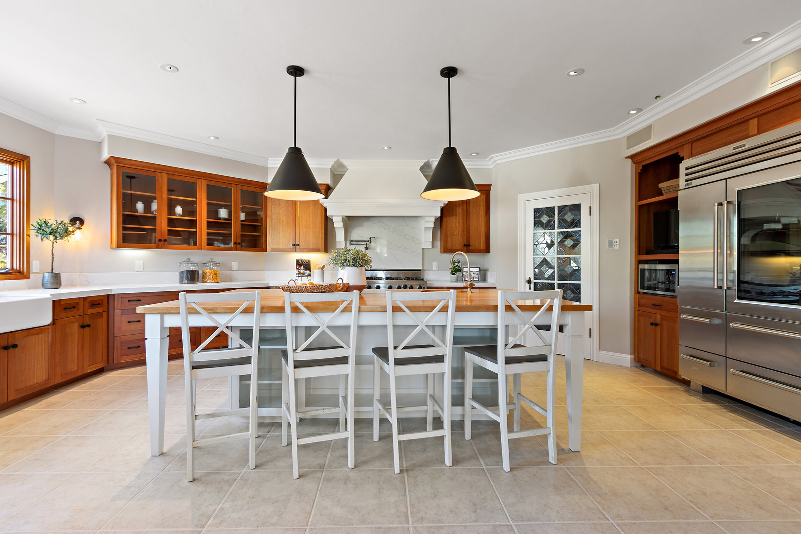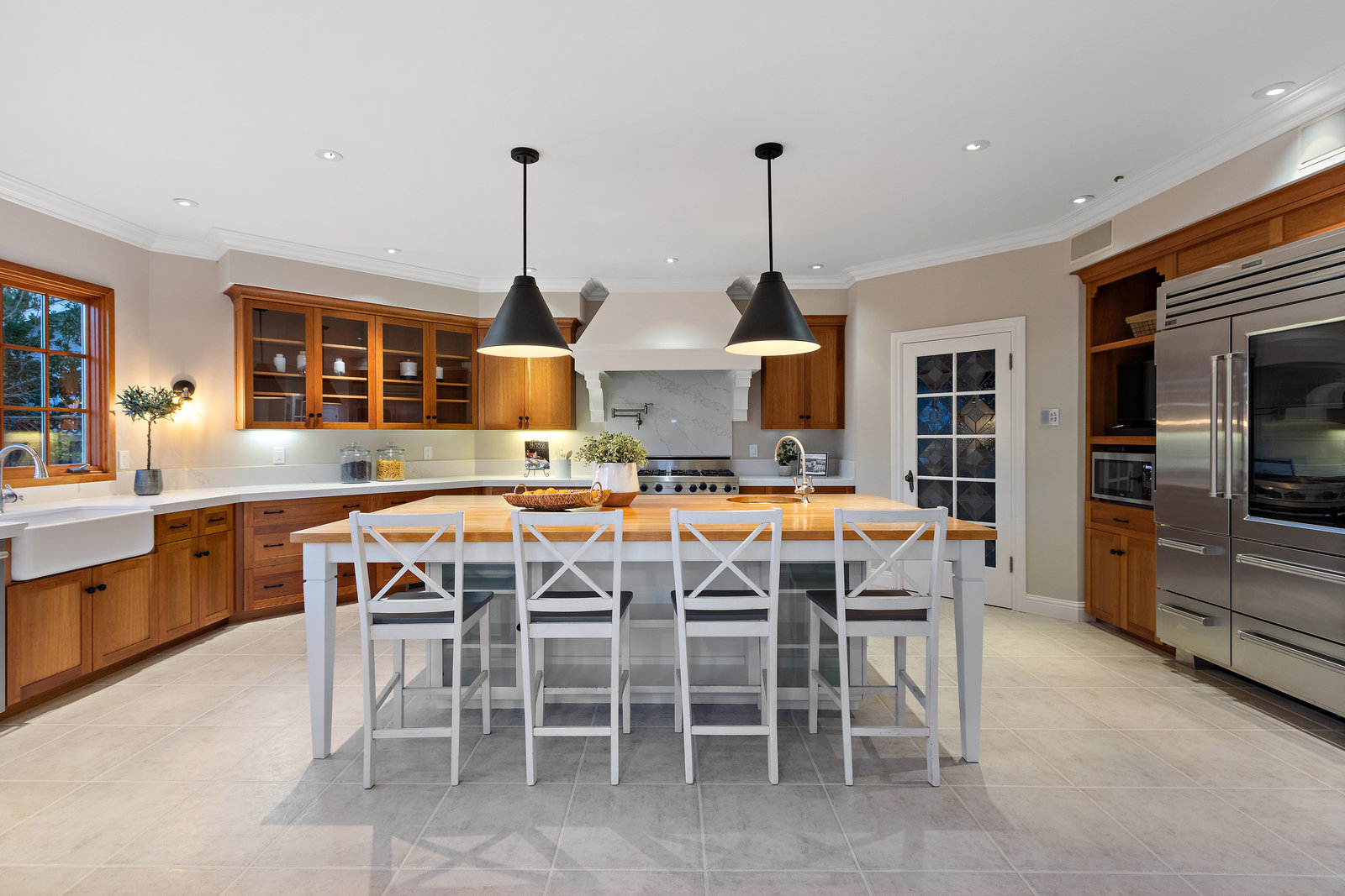 The spacious chef’s kitchen opens to both the dining and family rooms. The focal point is a giant center island with abundant storage and seating, warming drawer and vegetable sink. A gorgeous stained glass door contains a huge walk-in pantry. This chef’s kitchen is complete with stainless steel appliances - Bosch dishwasher, farmhouse sink, Viking 8 burner stove, and Subzero refrigerator.