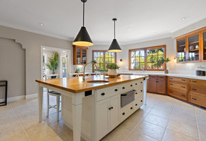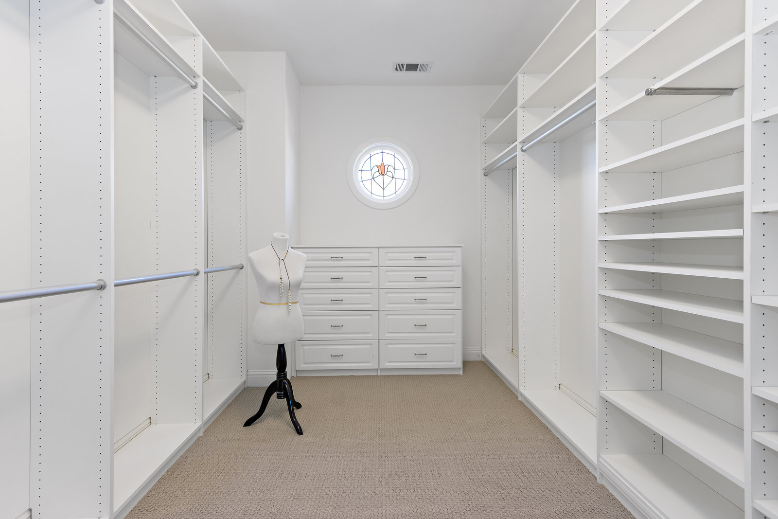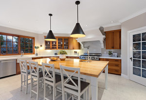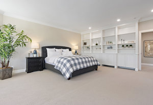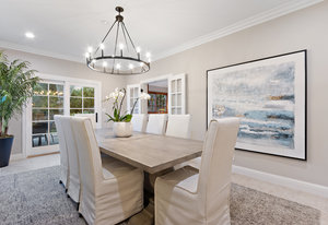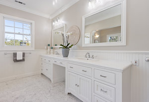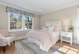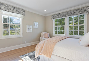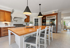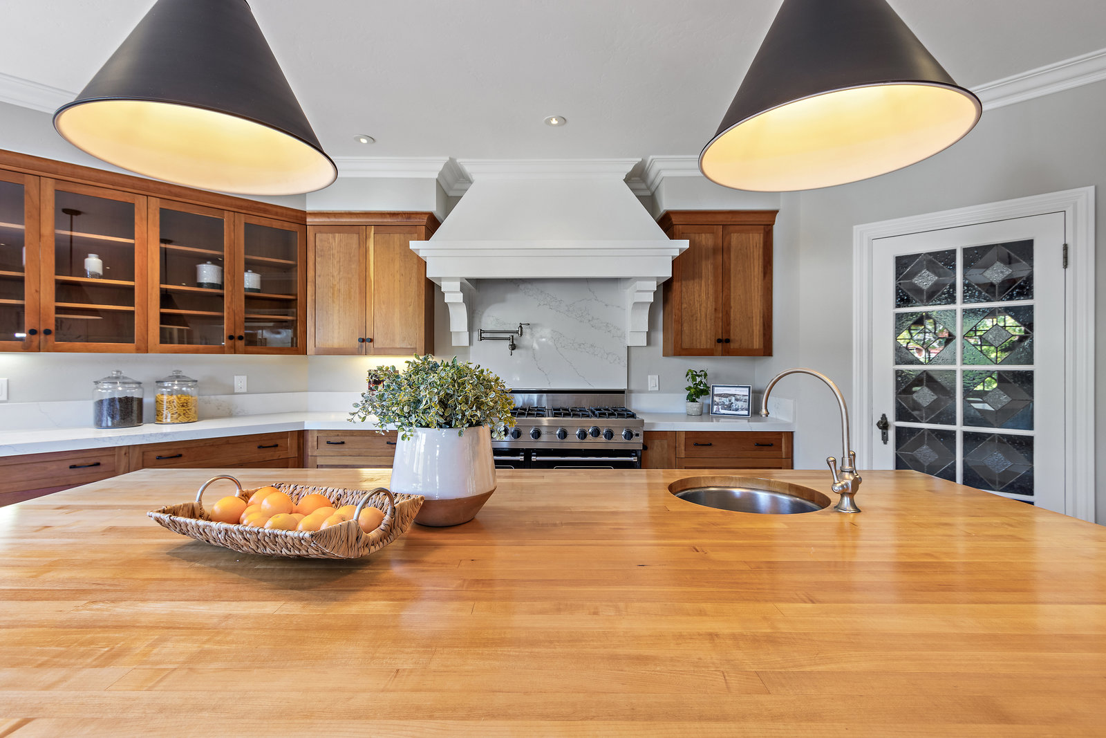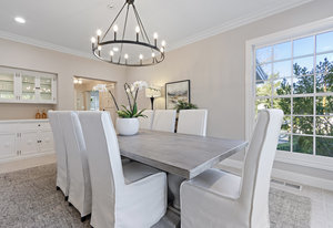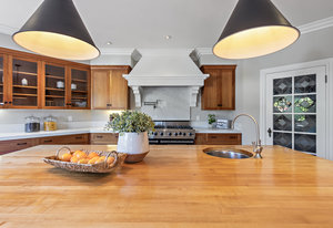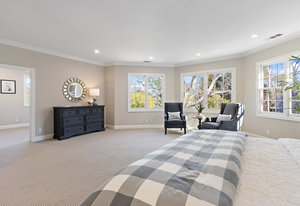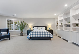 The spacious chef’s kitchen opens to both the dining and family rooms. The focal point is a giant center island with abundant storage and seating, warming drawer and vegetable sink. A gorgeous stained glass door contains a huge walk-in pantry. This chef’s kitchen is complete with stainless steel appliances - Bosch dishwasher, farmhouse sink, Viking 8 burner stove, and Subzero refrigerator.