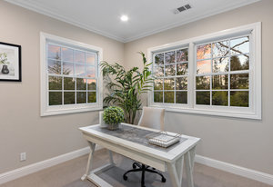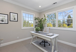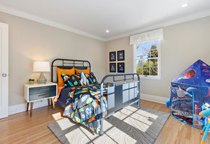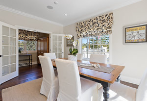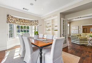 Through another set of french doors you will find the dining room/2nd bedroom has a delightful bay window and built-in cabinetry complete with additional french doors to more storage or an office space.