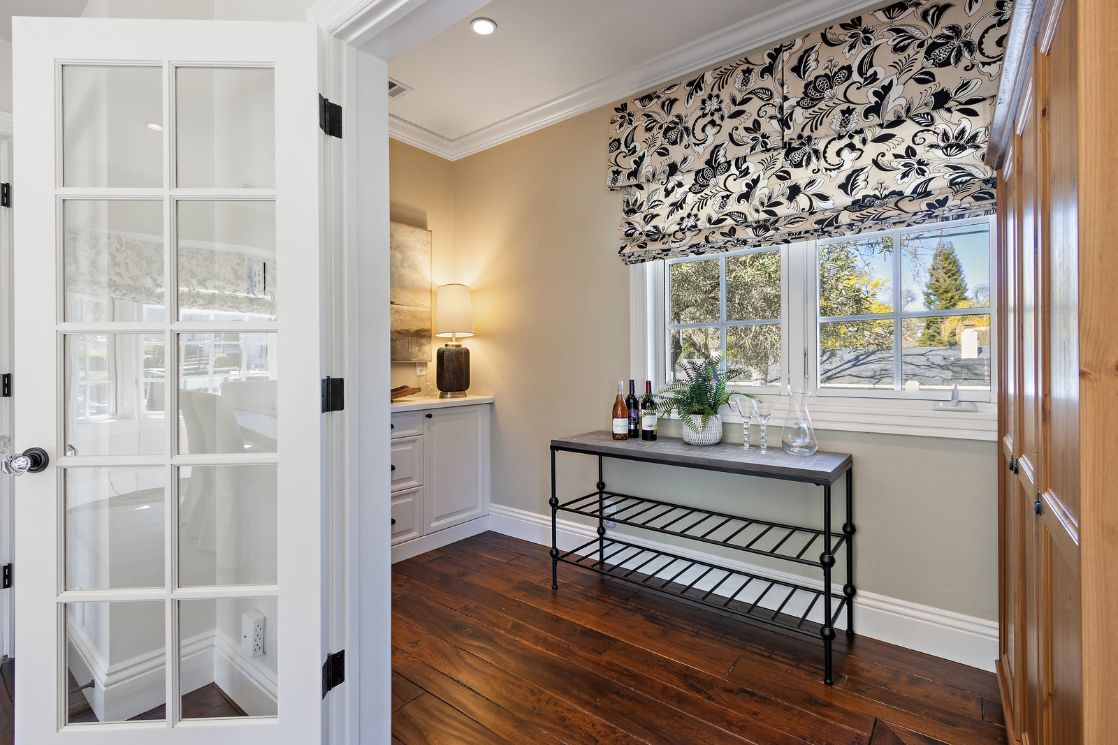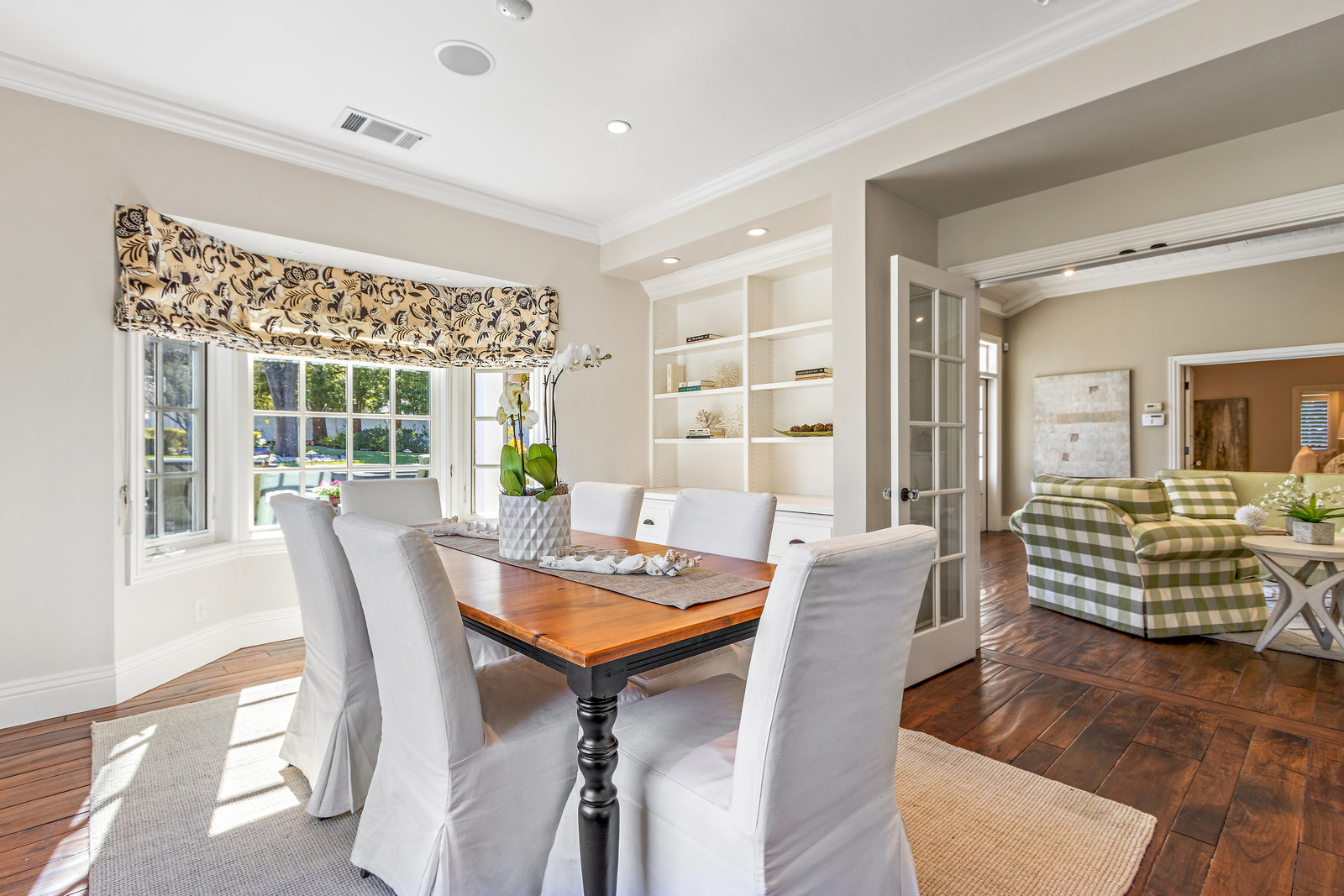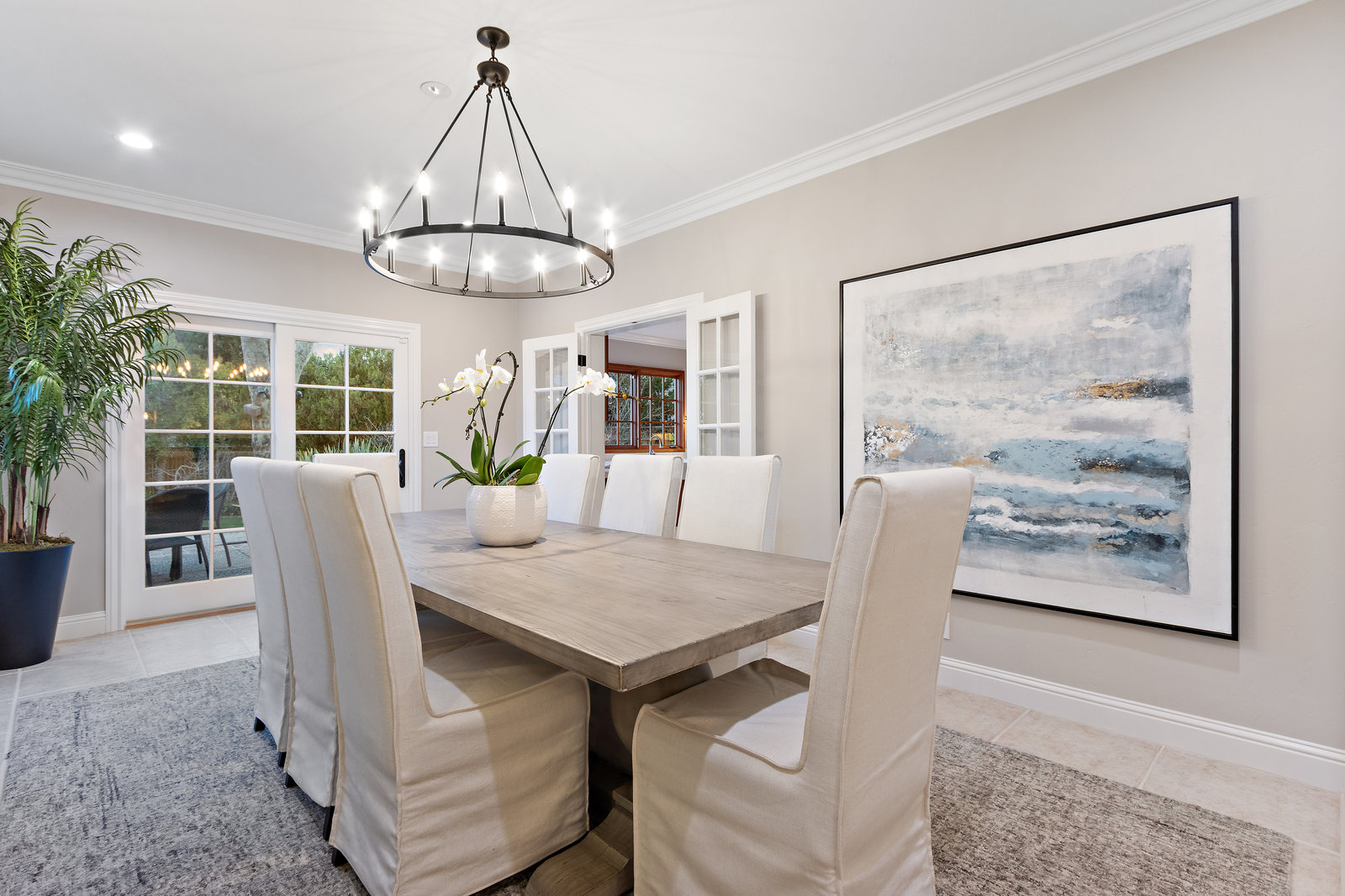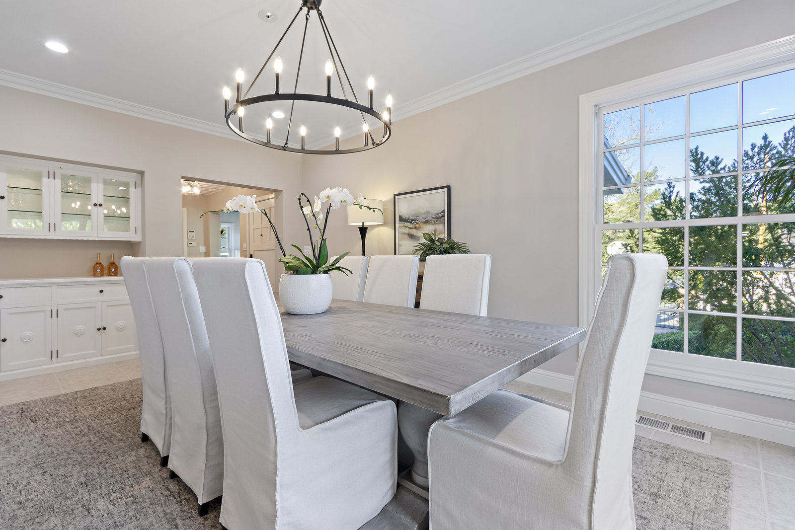 The spacious formal dining room with wagon wheel chandelier, tile flooring, built-in buffet and china cabinet, and sliding glass door leading to the lush backyard with outdoor casual dining patio and the sprawling lawn areas and fruit trees beyond.