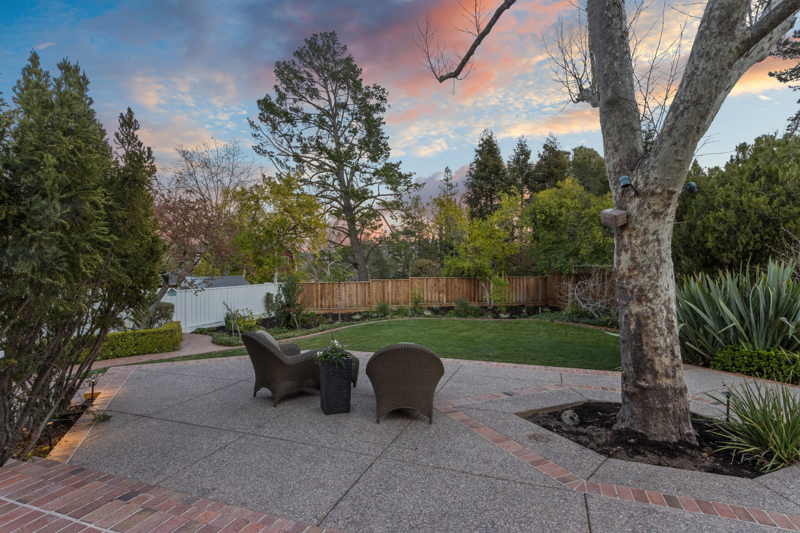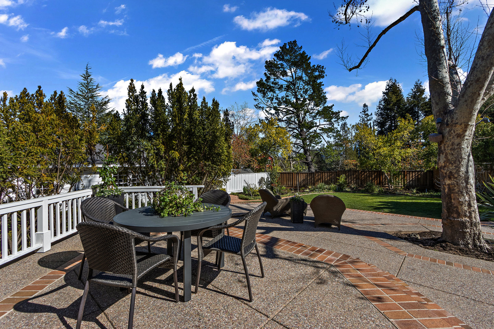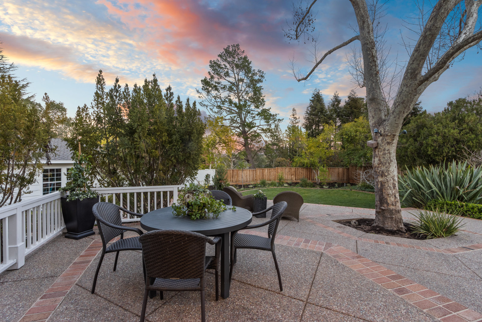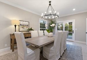 The spacious formal dining room with wagon wheel chandelier, tile flooring, built-in buffet and china cabinet, and sliding glass door leading to the lush backyard with outdoor casual dining patio and the sprawling lawn areas and fruit trees beyond.