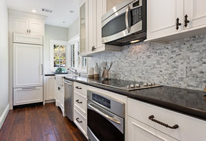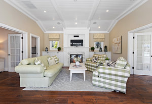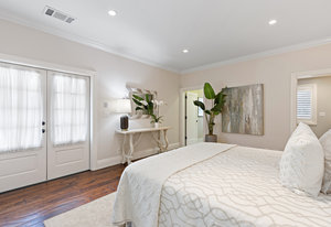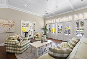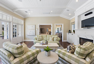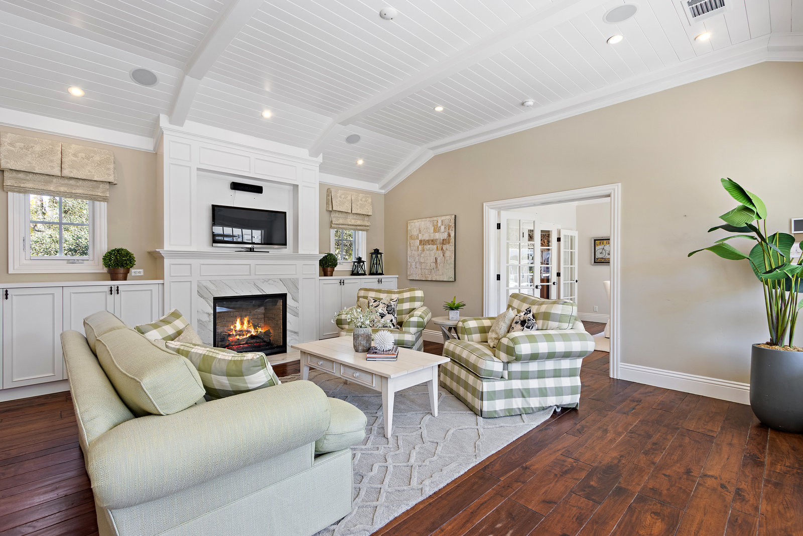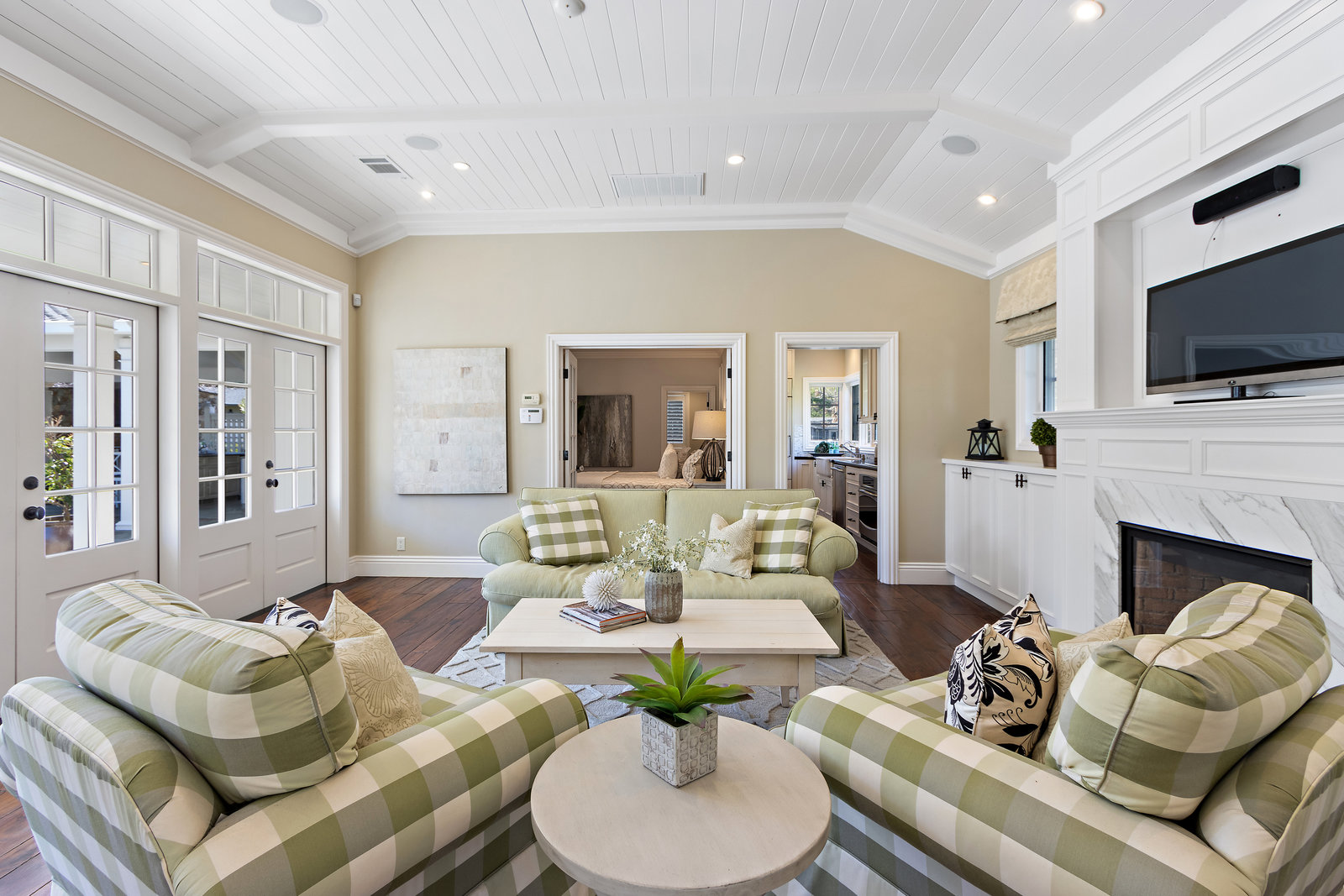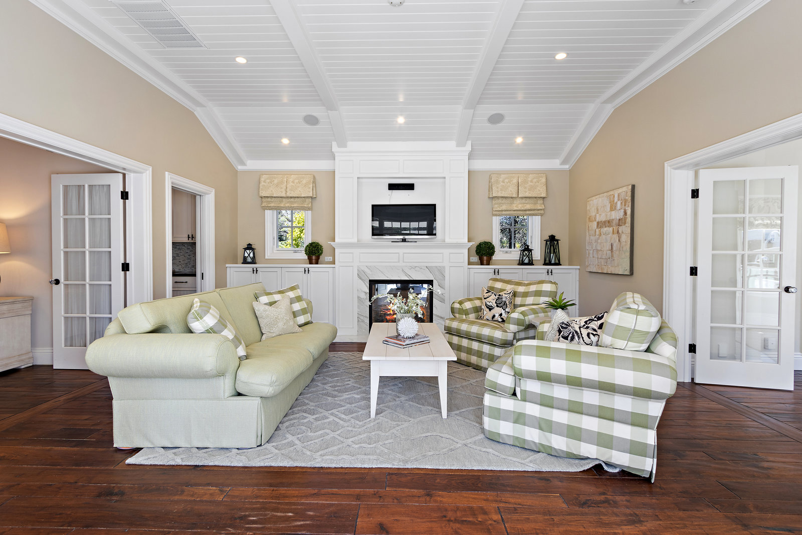 The architecturally stunning guest house can be entered through one of the three sets of french doors where you will find a great room with raised ceilings, hardwood floors, gas fireplace with carrara marble surround and extensive white painted cabinetry and millwork.