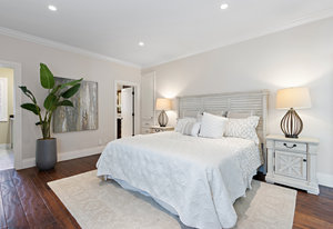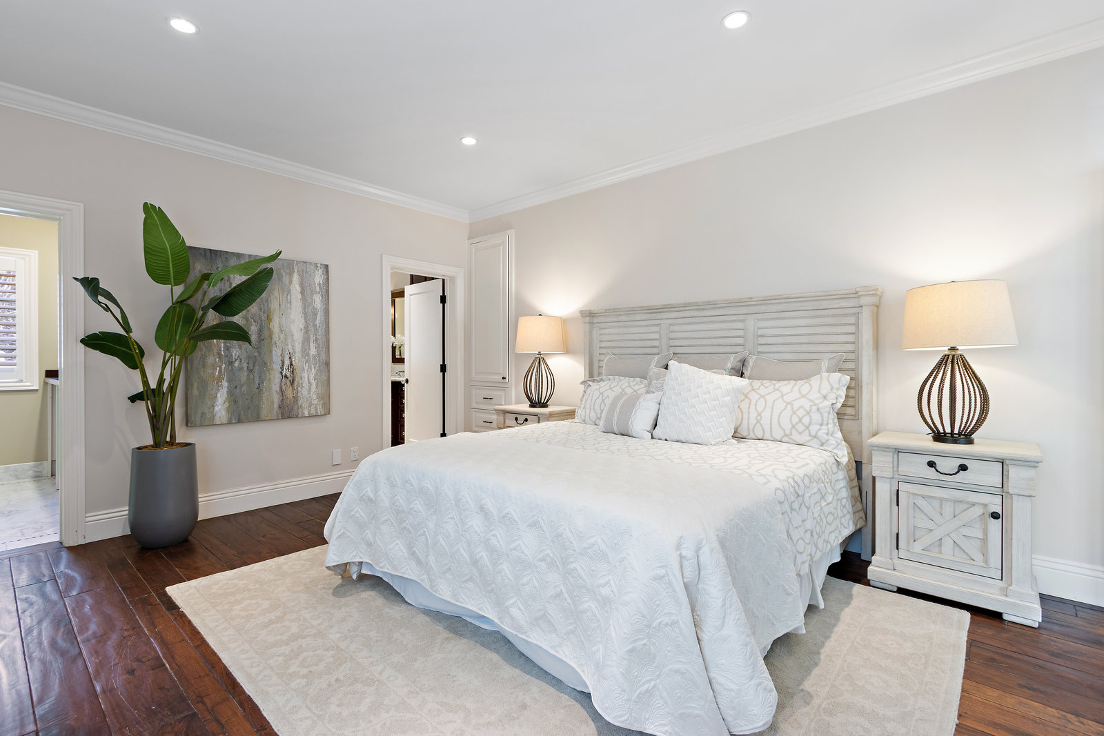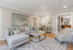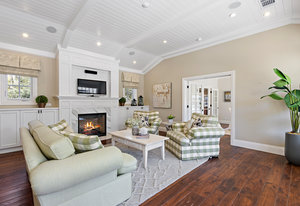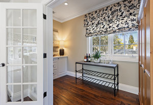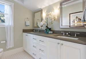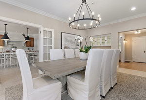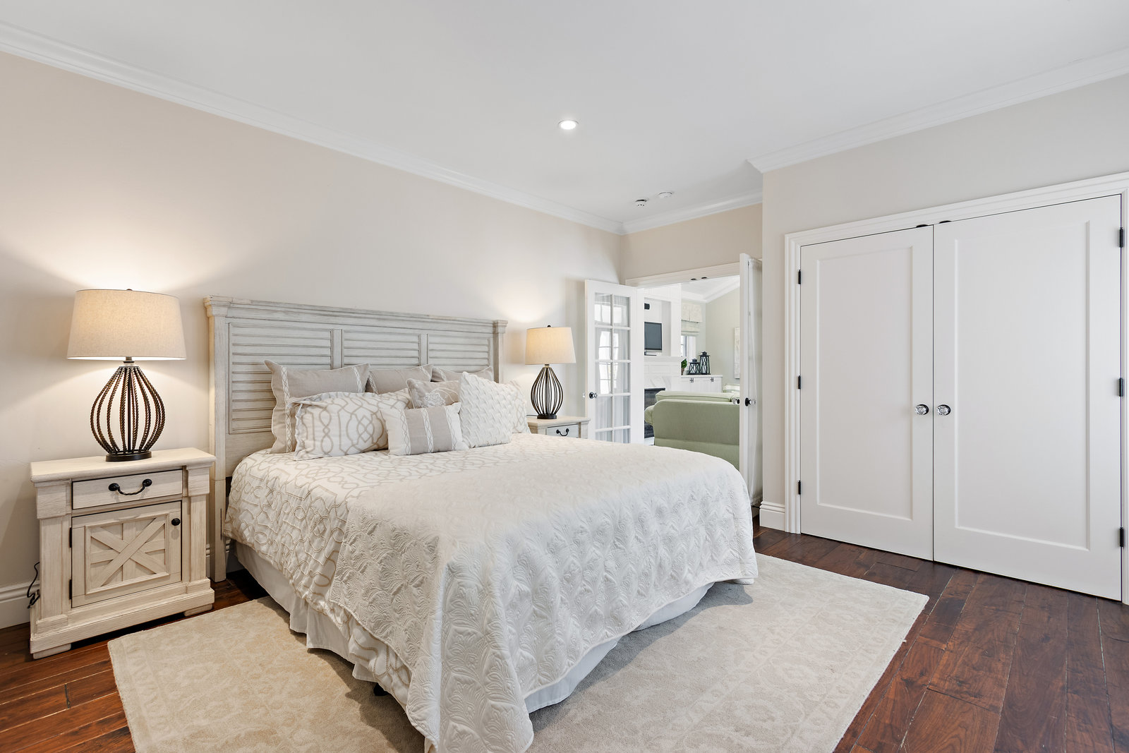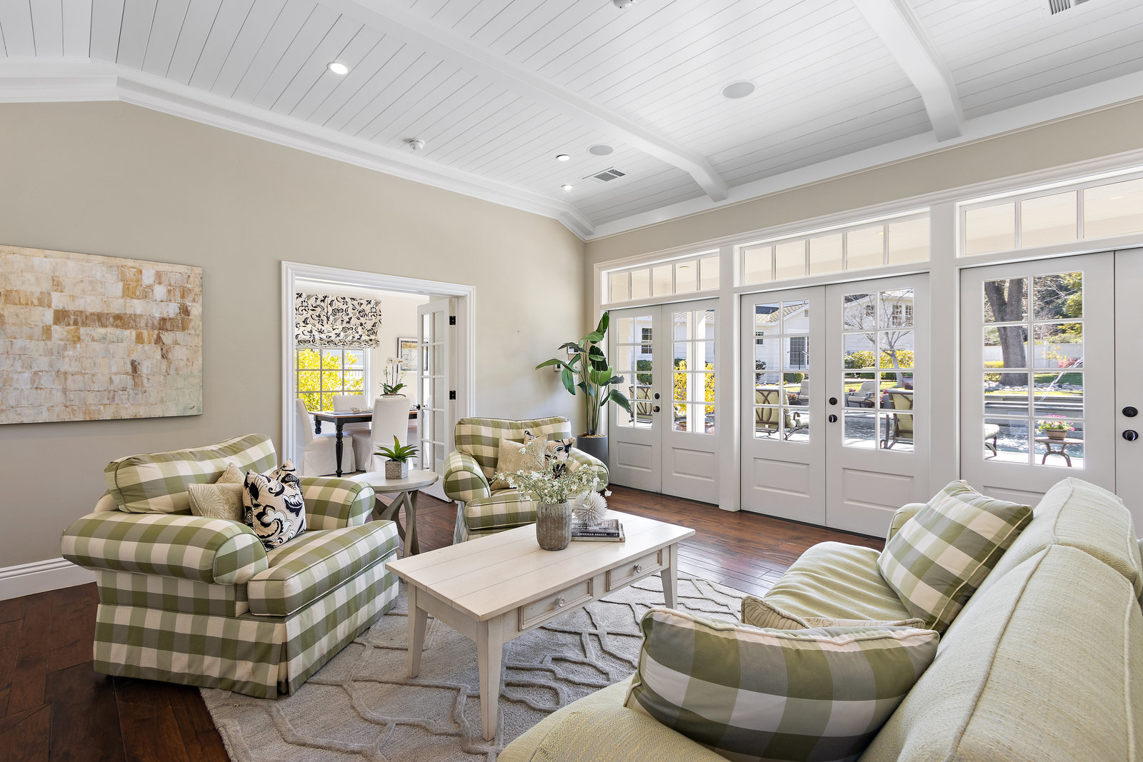 The architecturally stunning guest house can be entered through one of the three sets of french doors where you will find a great room with raised ceilings, hardwood floors, gas fireplace with carrara marble surround and extensive white painted cabinetry and millwork.