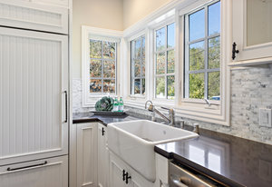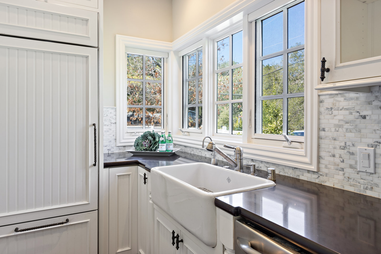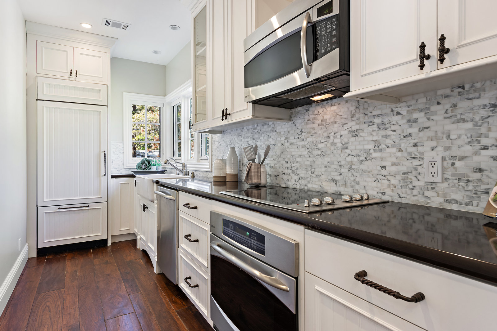 A full farmhouse kitchen includes carrera marble backsplash and black granite counters with a farmhouse sink. GE Profile stainless steel appliances, including stove top, oven, microwave, and dishwasher; plus wood paneled refrigerator.