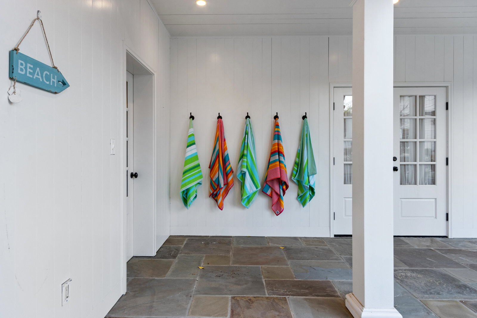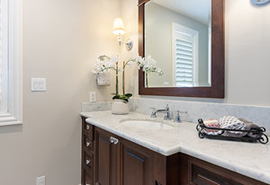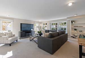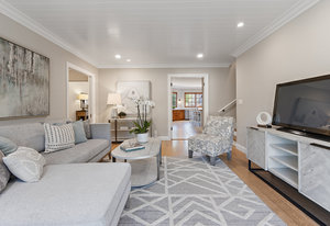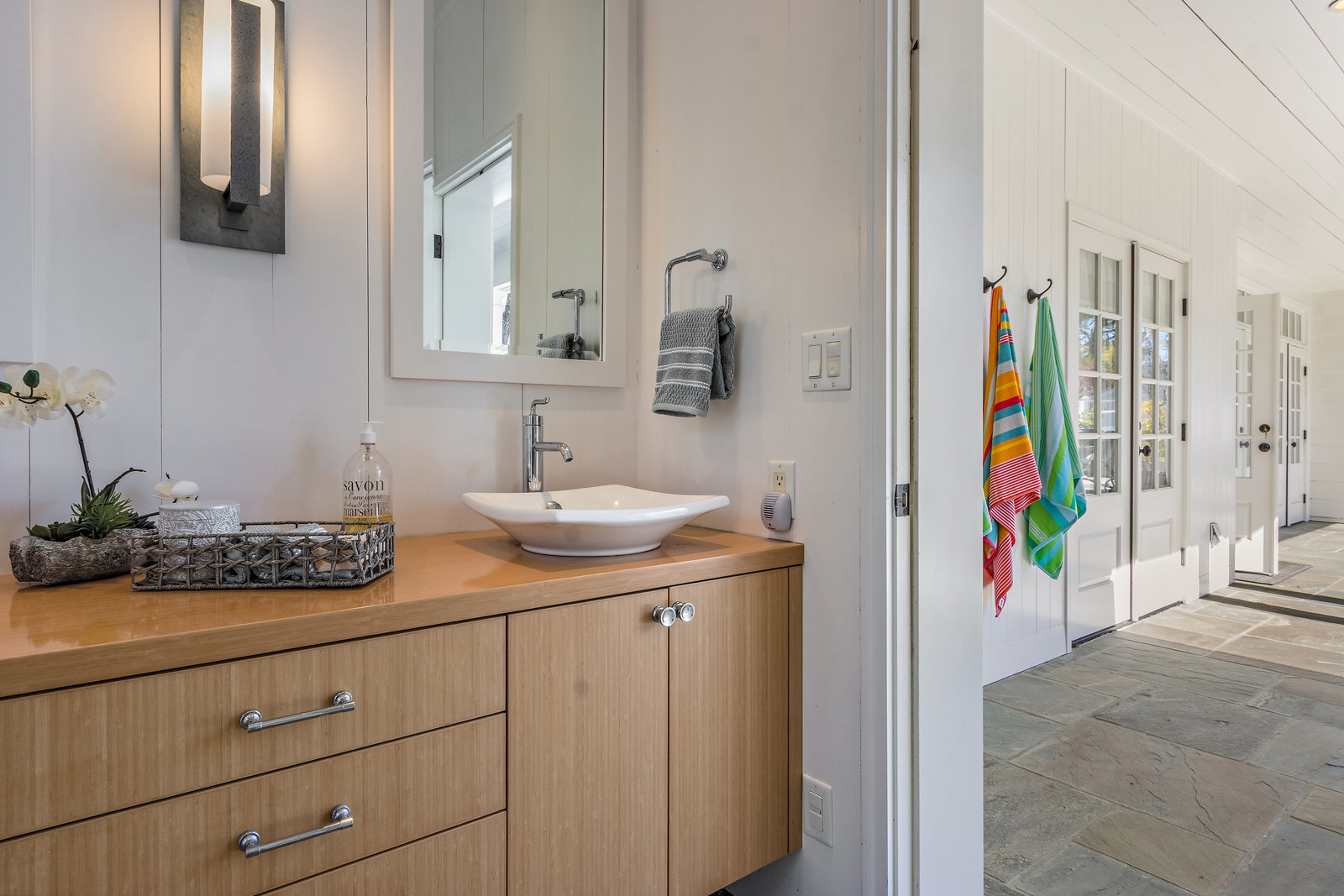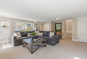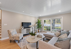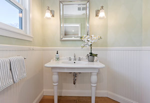 Family room features wood floors and an oversized slider to the yard. Adjacent classic powder room with wainscotting and nickel finishes.