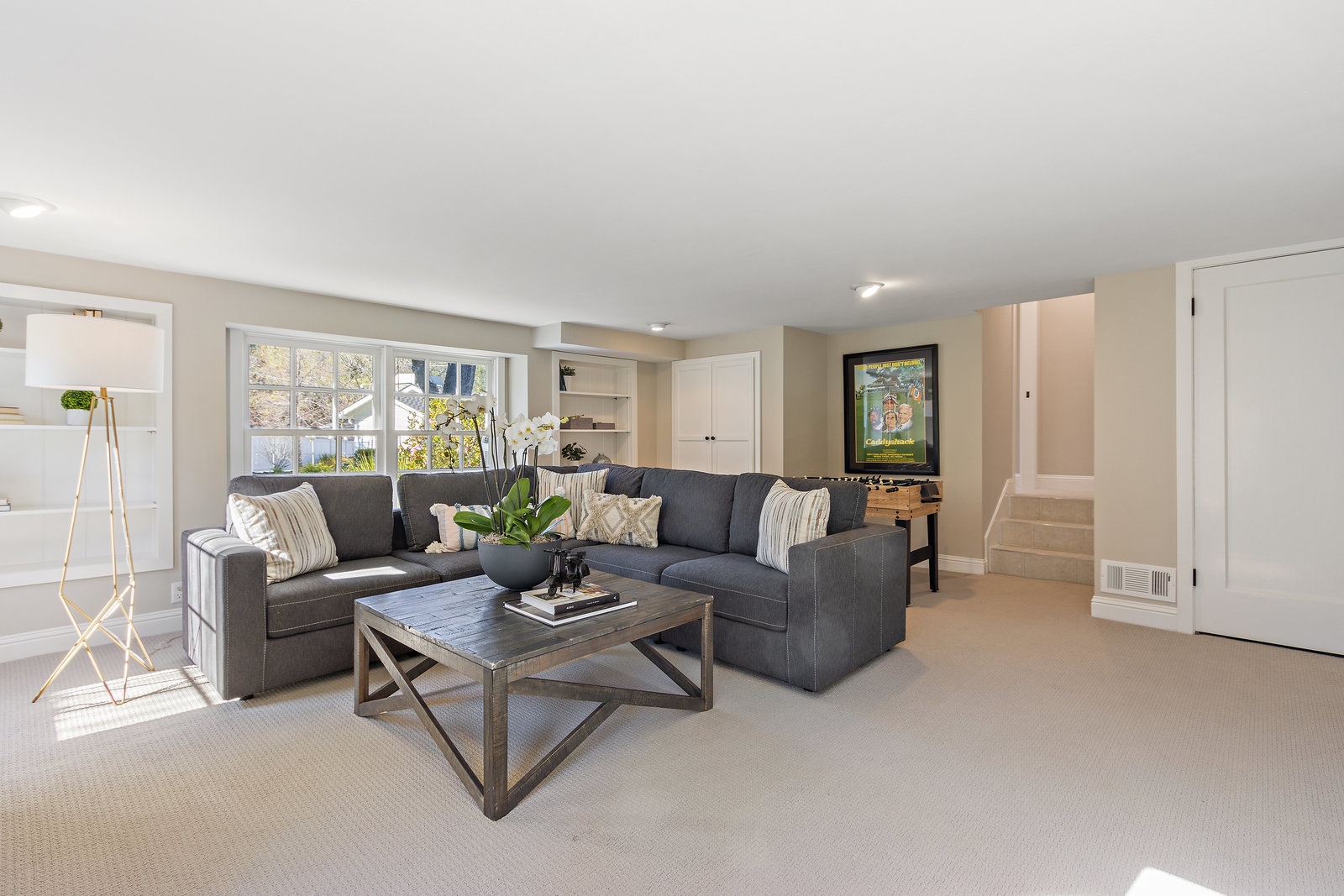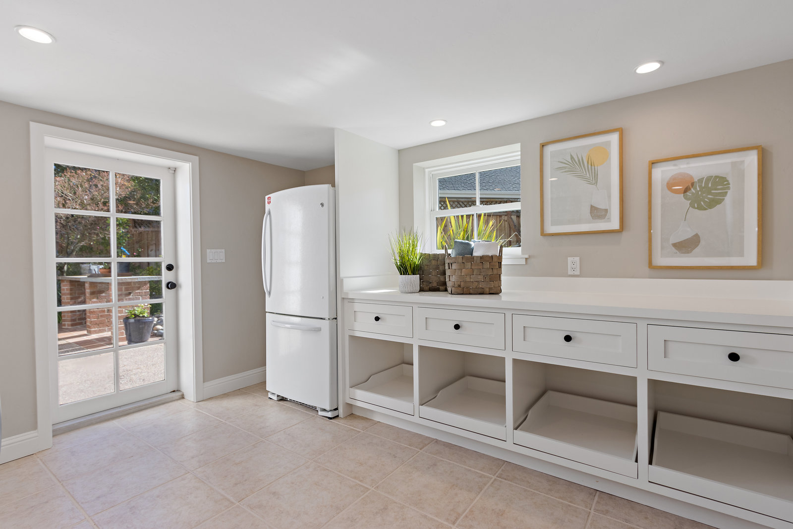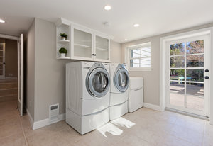 Down a few steps to a spacious laundry room with front loading washer and dryer, and additional refrigerator that opens to outdoor potting area.