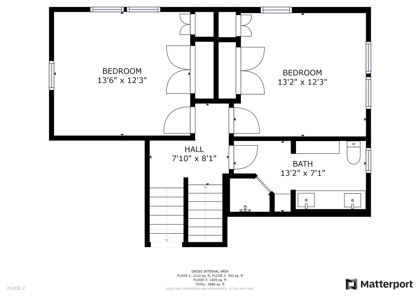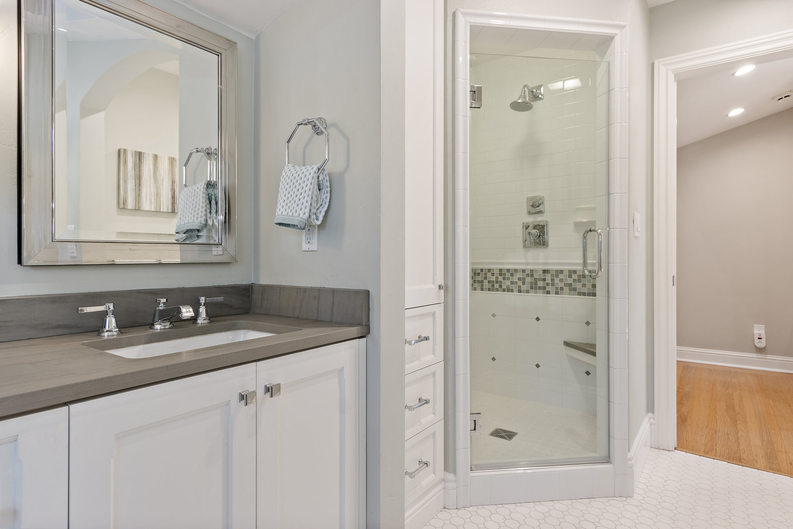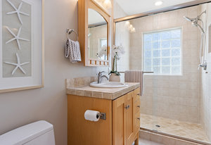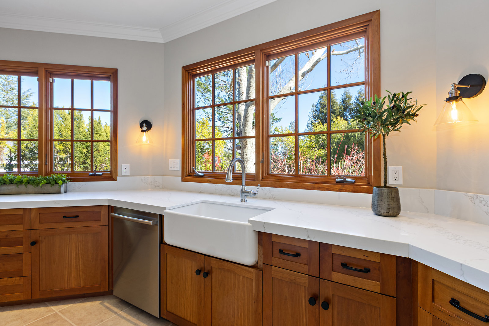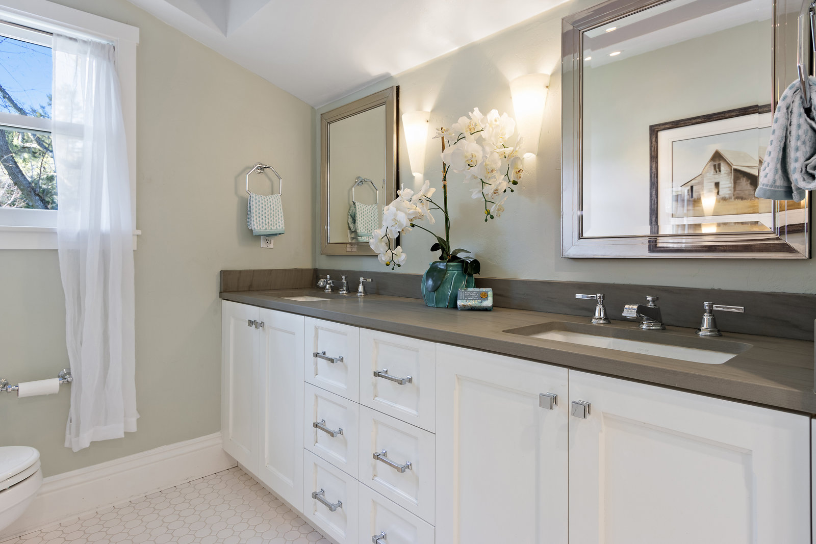 Up a half flight of stairs are two light filled bedrooms each featuring hardwood floors and built-in cabinetry. They share a spacious bathroom with dual sinks, stone counter, skylight, and a tile shower with dual shower heads.
