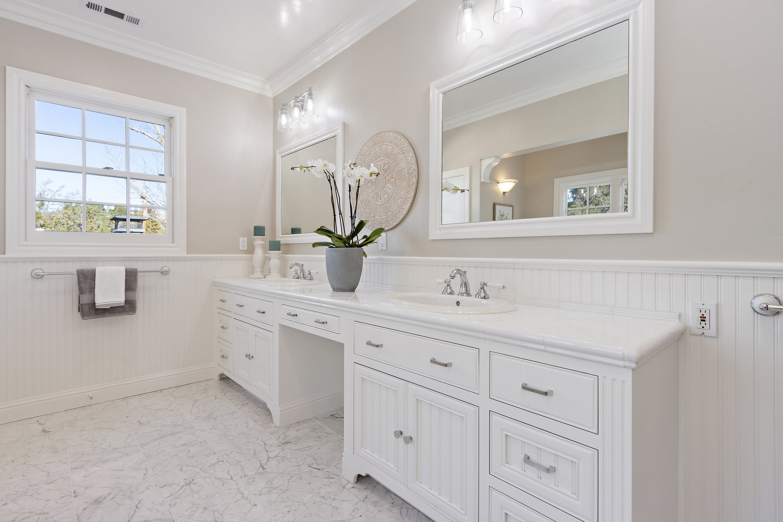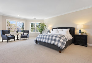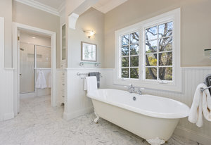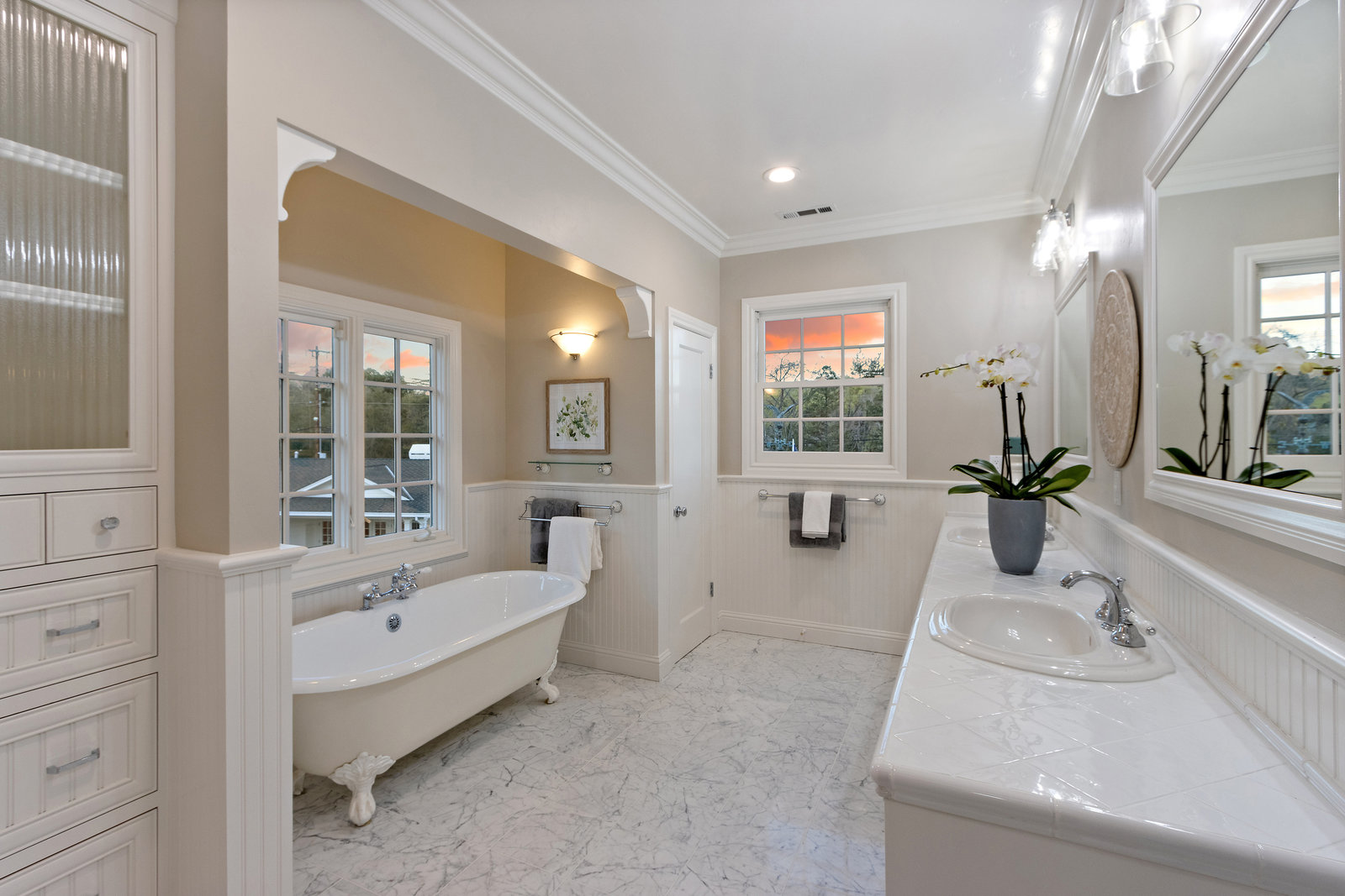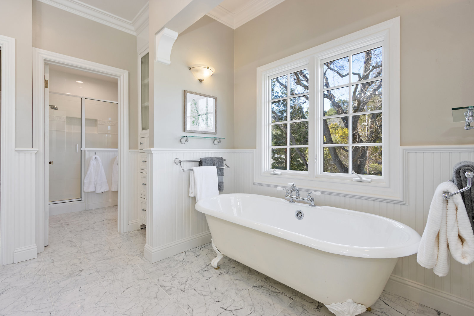 Another half flight to the spacious and private primary suite. This bright and sophisticated room with new carpeting includes a bay of windows and a wall of built-in cabinetry for your home library. A dedicated office space or nursery overlooks picturesque gardens. A spacious walk-in closet has abundant storage with built-ins and closet organizers. Luxurious spa-like compartmentalized bathroom with dual sinks and makeup area, claw foot tub, separate oversize shower - lots of windows bring in natural light and to showcase beautiful carrera tile finishes, wainscotting and more.