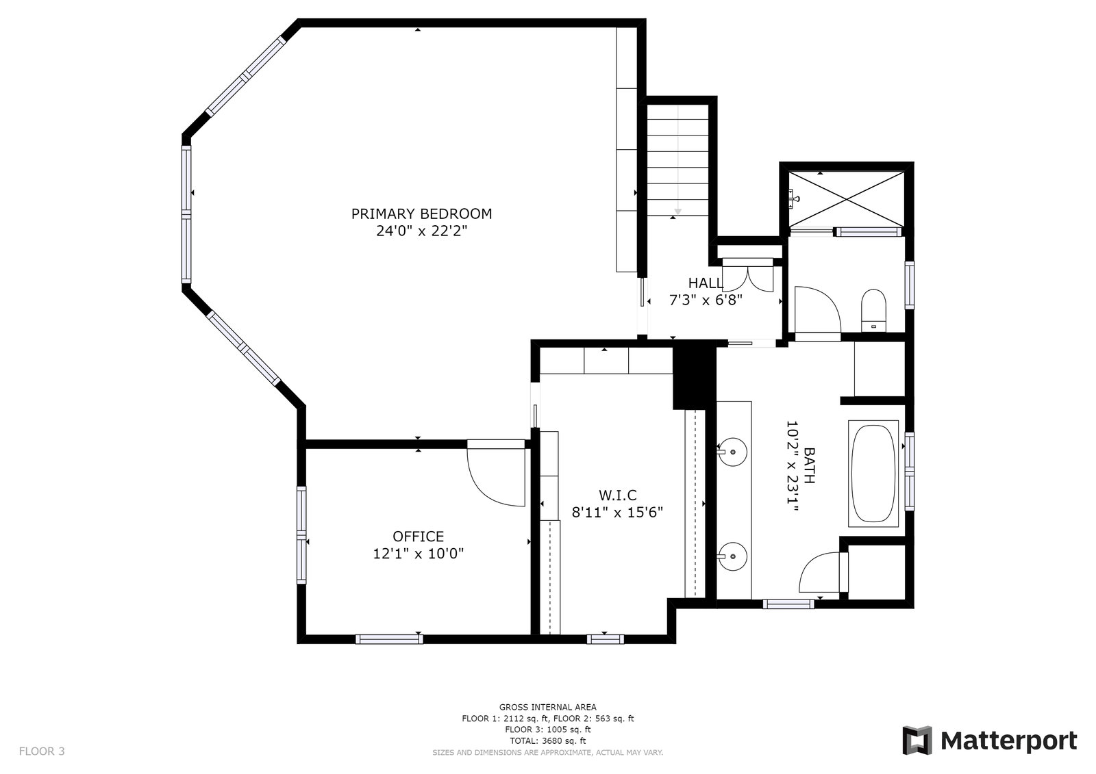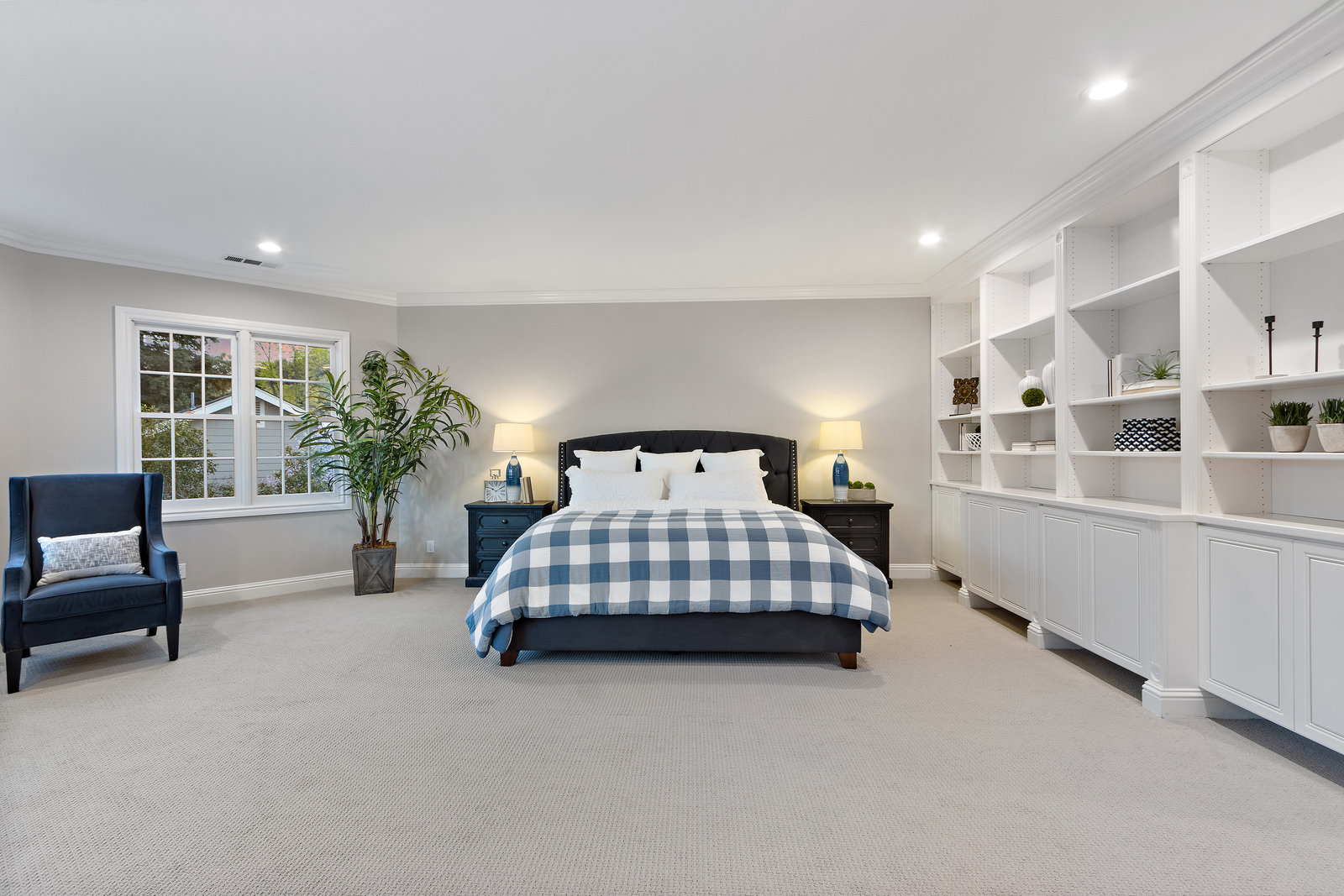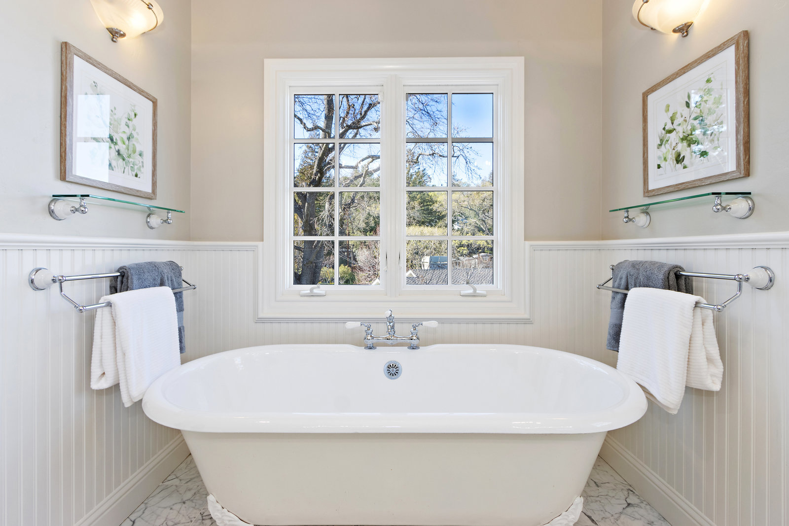 Another half flight to the spacious and private primary suite. This bright and sophisticated room with new carpeting includes a bay of windows and a wall of built-in cabinetry for your home library. A dedicated office space or nursery overlooks picturesque gardens. A spacious walk-in closet has abundant storage with built-ins and closet organizers. Luxurious spa-like compartmentalized bathroom with dual sinks and makeup area, claw foot tub, separate oversize shower - lots of windows bring in natural light and to showcase beautiful carrera tile finishes, wainscotting and more.
