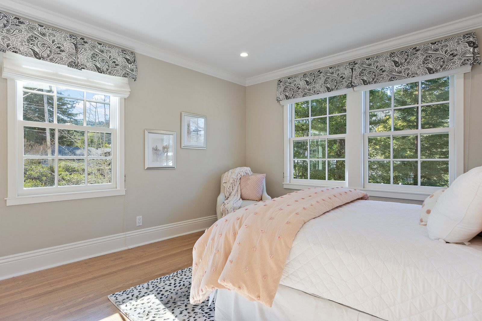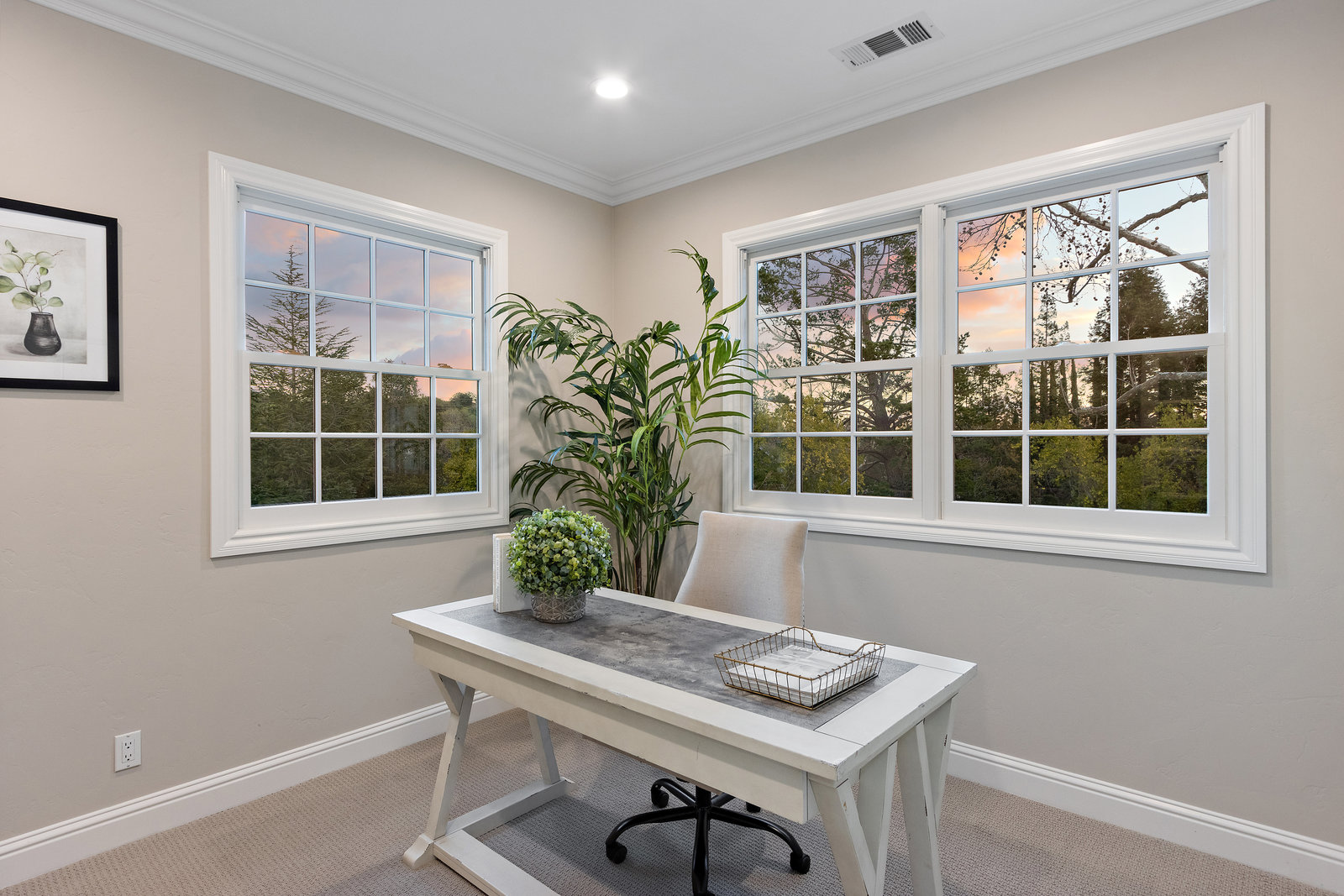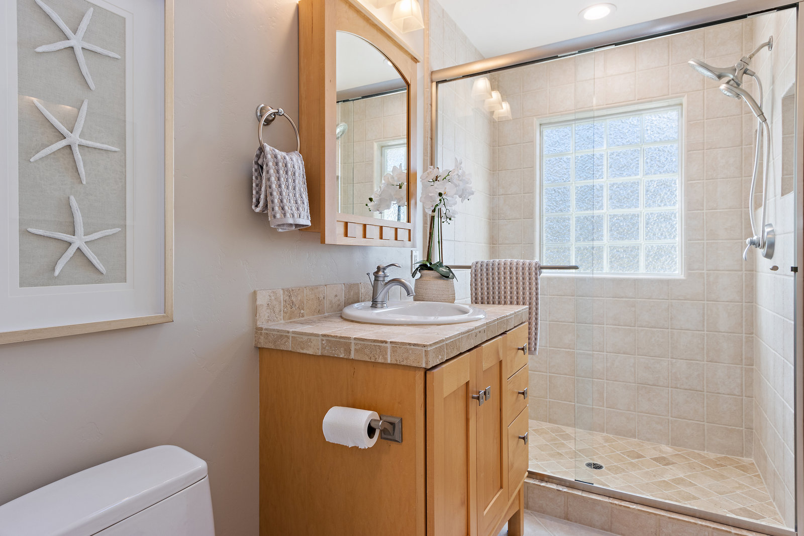 This floor also has the fourth bedroom/bonus room with built-in cabinetry, and new carpeting. It is ensuite with shower with dual shower heads, tile counters and floor, and a skylight bringing in natural light.