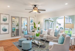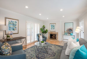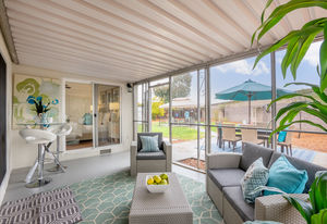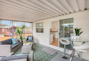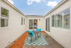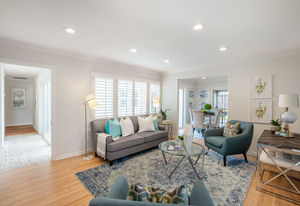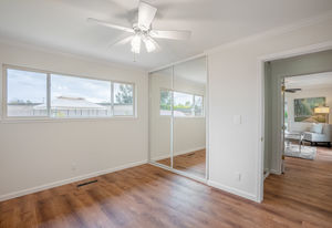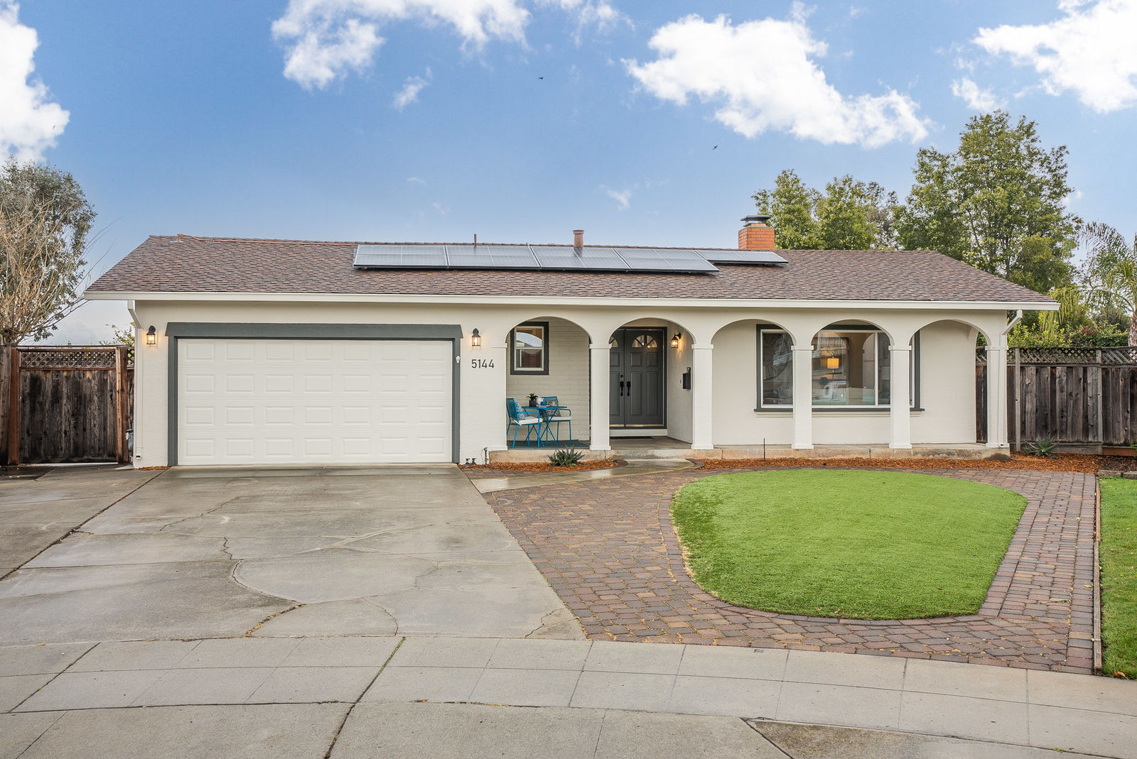 Fresh interior paint, crown molding, refinished hardwood and wood grain laminate floors, paneled interior doors, ceiling fans, recessed lighting, solar panels, and plantation shutters are featured throughout the almost 1,800 square feet of single-level living space with four bedrooms and 2.5 bathrooms.