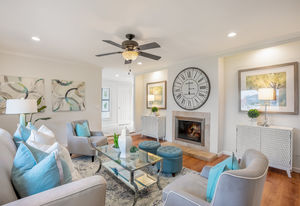 The living and family rooms share a dual-sided gas fireplace. The living room also has front-facing windows and recessed lighting.
