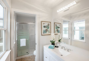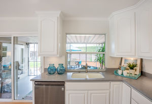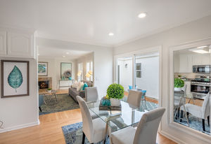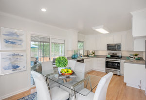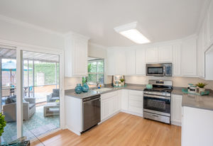 The heart of the home, the kitchen, showcases all newly painted cabinetry, dishwasher, microwave, new oven, and Corian counters. The adjacent casual dining area also has access to the backyard’s enclosed sunroom, an ideal flexible-use space for a play/game room or even a home office.