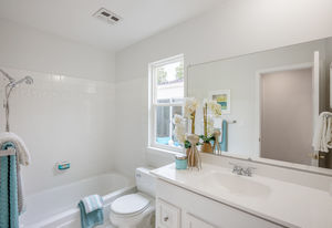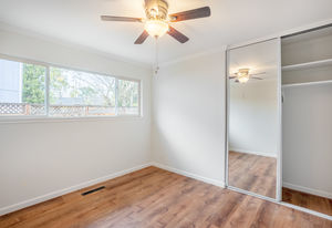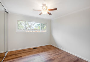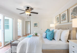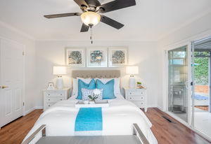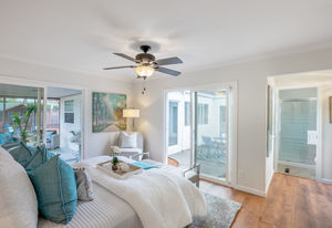 Four bedrooms include the master retreat that has access to the central atrium and a second slider to the backyard. This room has a walk-in and storage closets and a bathroom updated with a new vanity, mirror and fixtures, and glass-enclosed shower. Other bedrooms have sliding mirrored closet doors and ceiling fans.