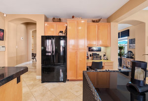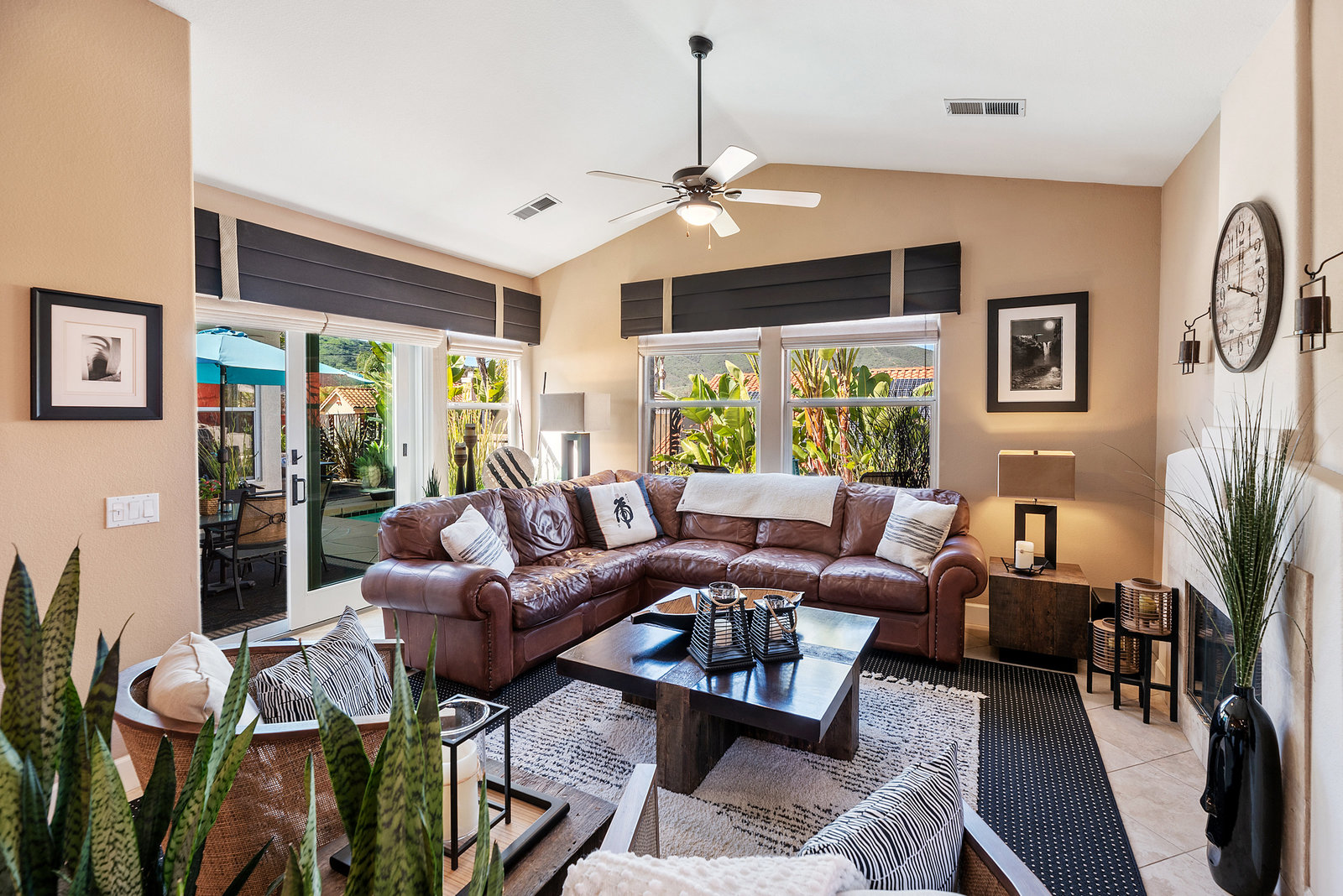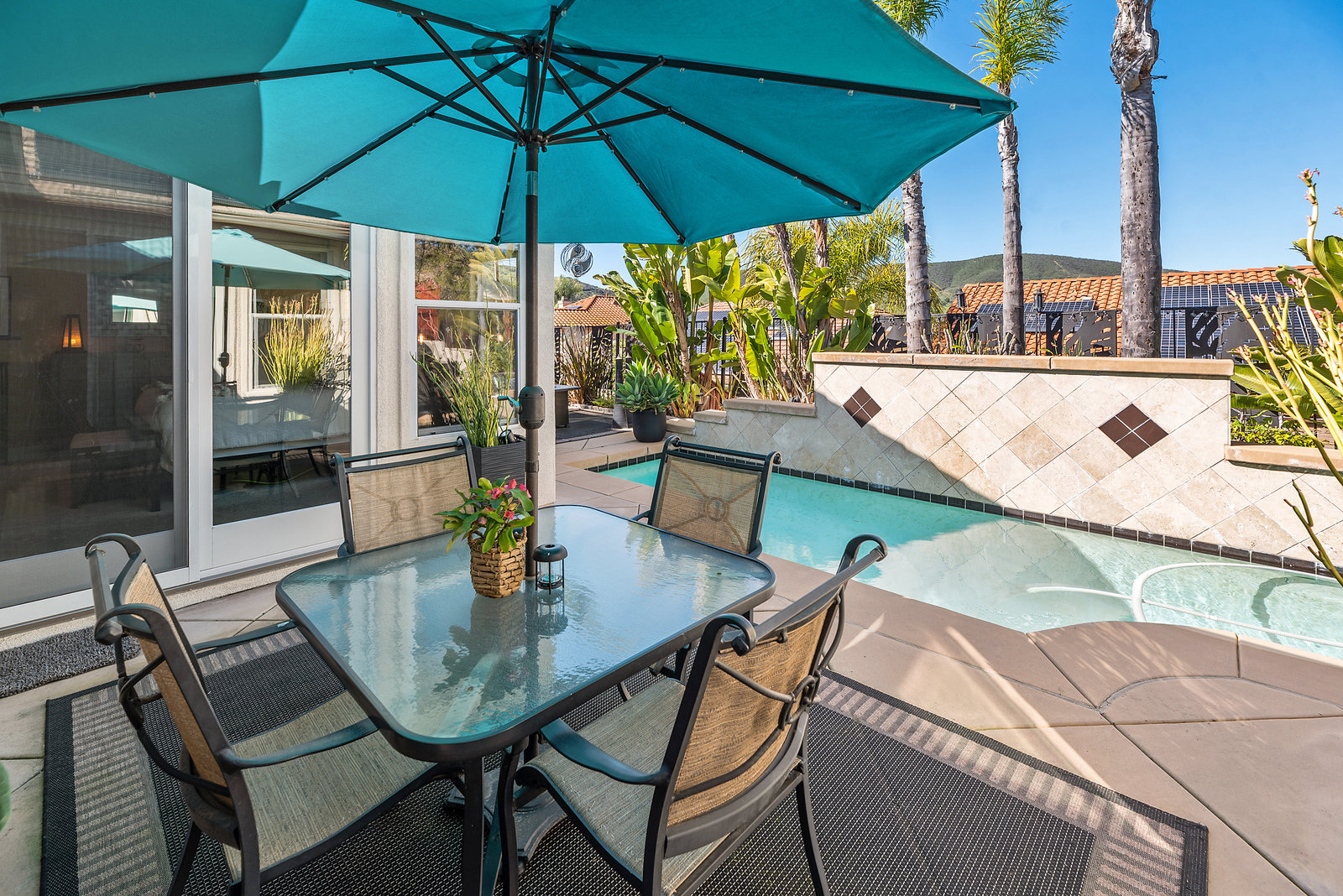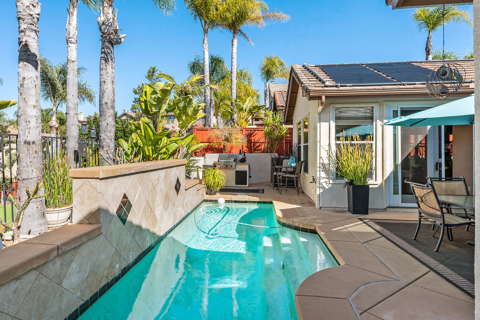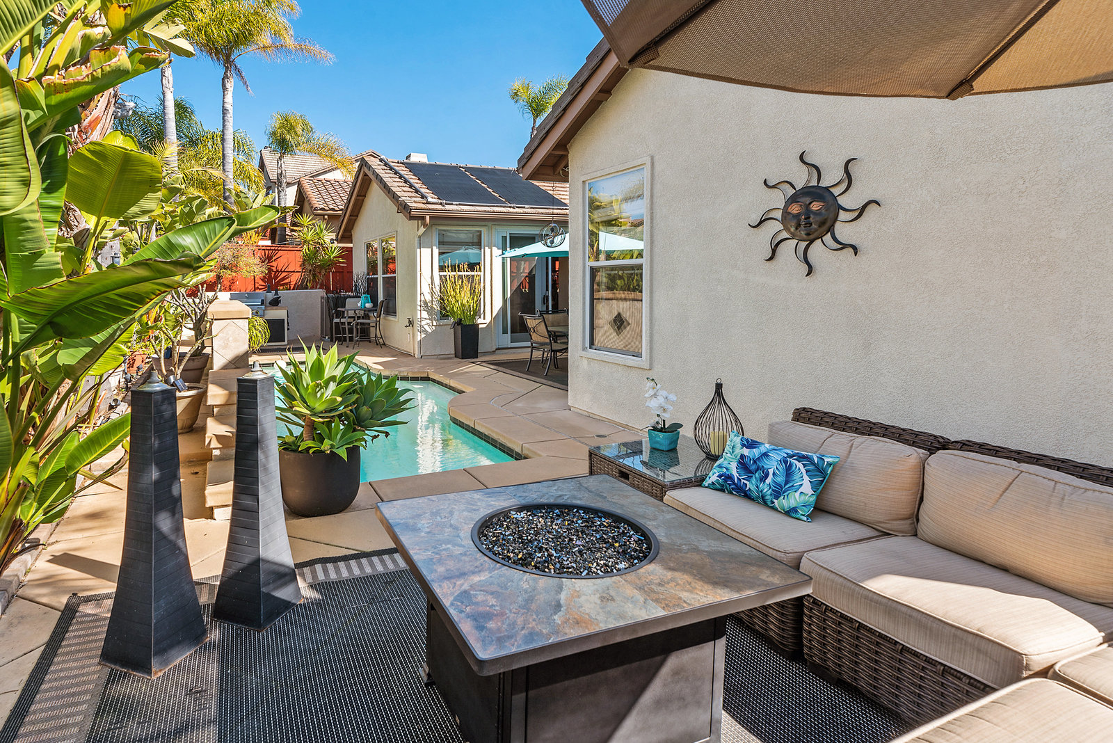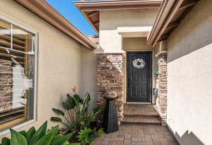 Staycation living at its best! Stunning 1-story home, 3+ bedrooms, 2 baths, 2257 sf, with your own private pool featuring a travertine privacy wall and waterfall! Fantastic location in the highly desirable Twin Oaks Valley Ranch community! The original owner has lovingly cared for and upgraded this beautiful home, which includes PAID Solar for the home and pool! In recent years, upgrades have included exterior paint, artificial turf, brick paver driveway and side walkways, front door invisible screen, kitchen remodel includes newer appliances and granite countertops, gorgeous spa-like bathroom remodels in both the primary and guest bathrooms, newer carpet and wood engineered flooring, sliding doors, newer fence, in home water system (softener and filtration), newer furnace & A/C! Noted exterior features: Pool with decking, raised waterfall, tropical landscaping. Inside features: elegant travertine floors, 6" baseboards, ceiling fans, plantation shutters, custom window coverings and blinds! The 2-Car Garage has storage cabinets and a built-in overhead storage rack. The 1-Car Garage has a workshop with built-in upper and lower cabinets including a countertop and sink! Public records show 4 bedrooms; however, the current layout includes 3 bedrooms (all with walk-in closets) and a den (no closet or door).