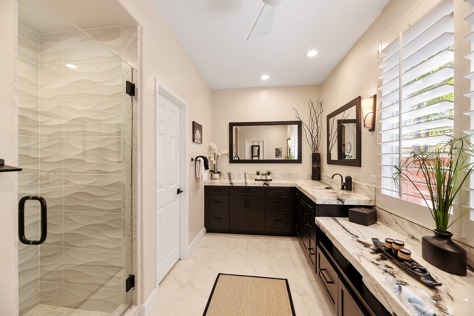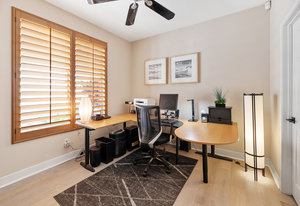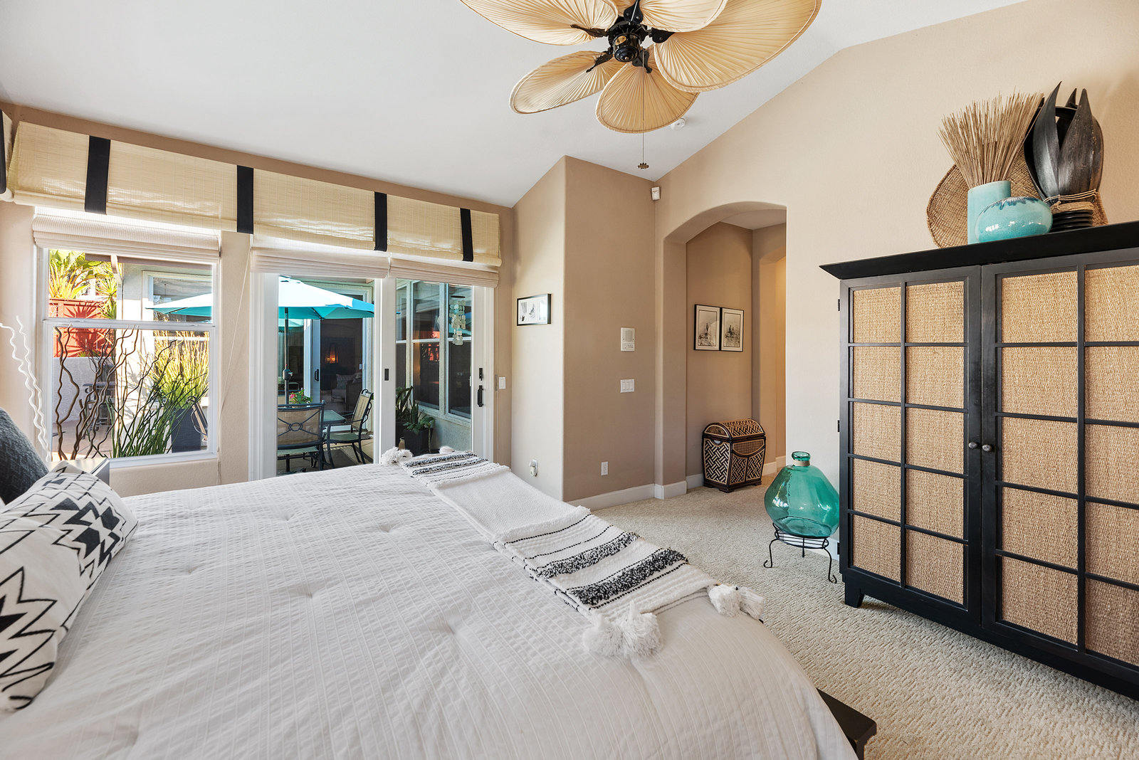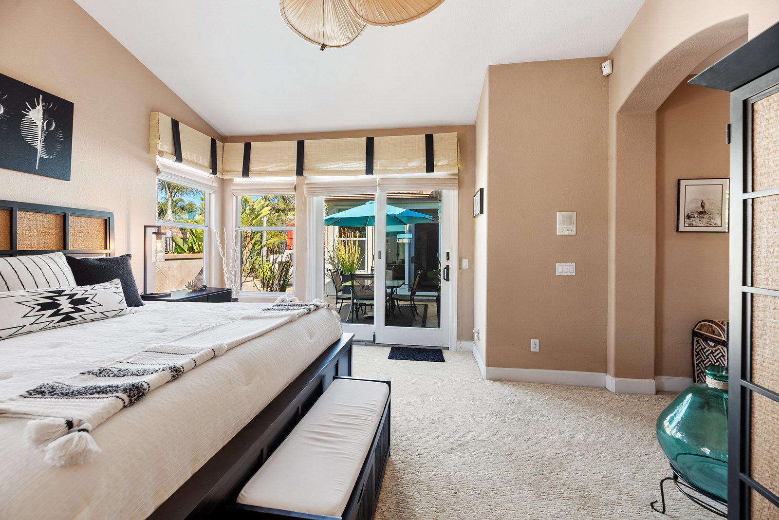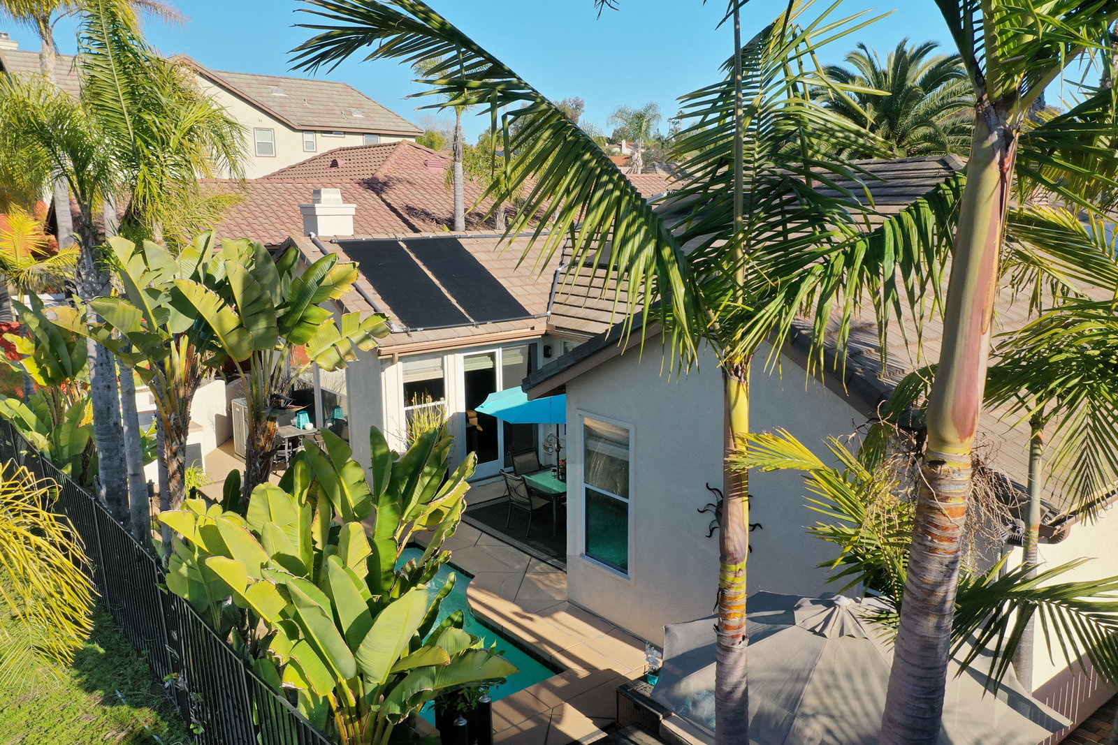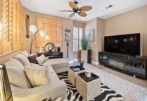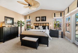 Staycation living at its best! Stunning 1-story home, 3+ bedrooms, 2 baths, 2257 sf, with your own private pool featuring a travertine privacy wall and waterfall! Fantastic location in the highly desirable Twin Oaks Valley Ranch community! The original owner has lovingly cared for and upgraded this beautiful home, which includes PAID Solar for the home and pool! In recent years, upgrades have included exterior paint, artificial turf, brick paver driveway and side walkways, front door invisible screen, kitchen remodel includes newer appliances and granite countertops, gorgeous spa-like bathroom remodels in both the primary and guest bathrooms, newer carpet and wood engineered flooring, sliding doors, newer fence, in home water system (softener and filtration), newer furnace & A/C! Noted exterior features: Pool with decking, raised waterfall, tropical landscaping. Inside features: elegant travertine floors, 6" baseboards, ceiling fans, plantation shutters, custom window coverings and blinds! The 2-Car Garage has storage cabinets and a built-in overhead storage rack. The 1-Car Garage has a workshop with built-in upper and lower cabinets including a countertop and sink! Public records show 4 bedrooms; however, the current layout includes 3 bedrooms (all with walk-in closets) and a den (no closet or door).