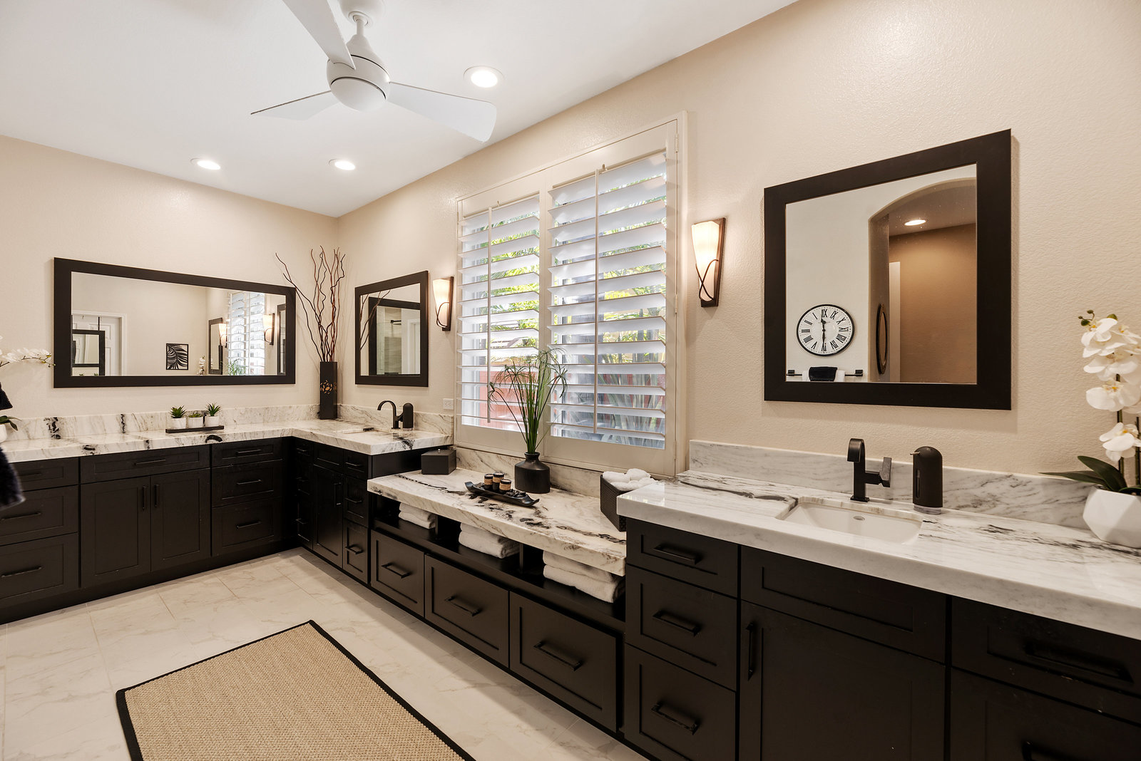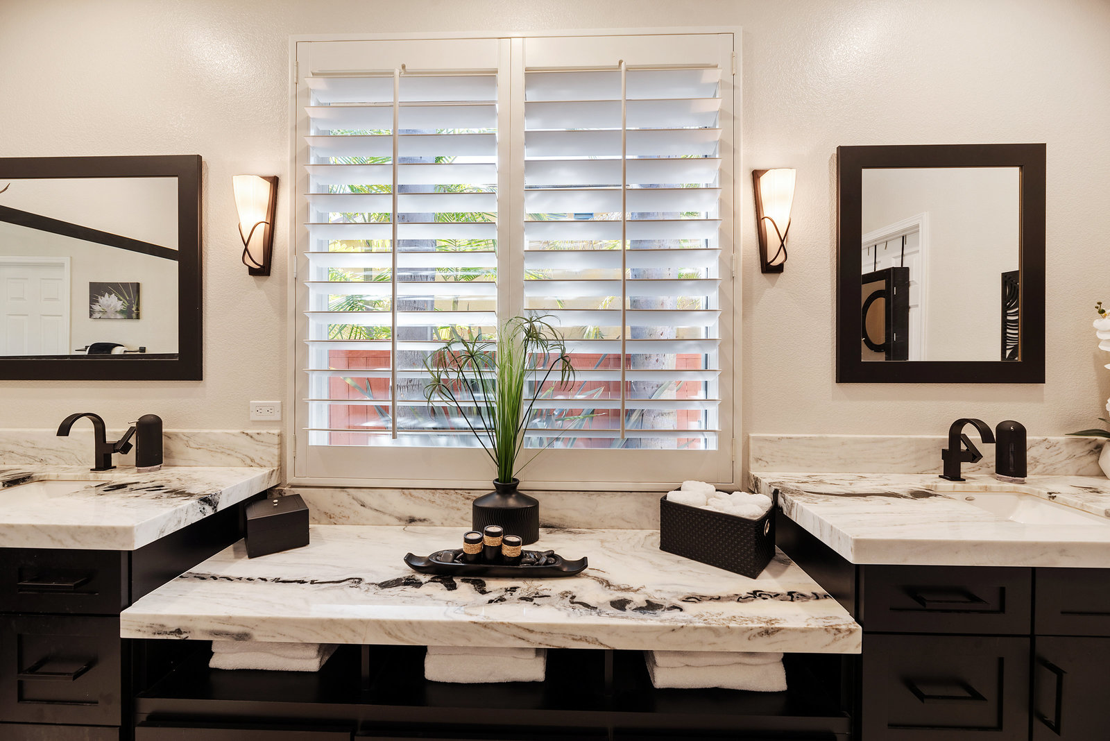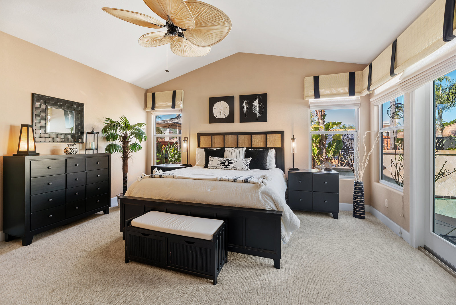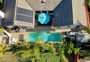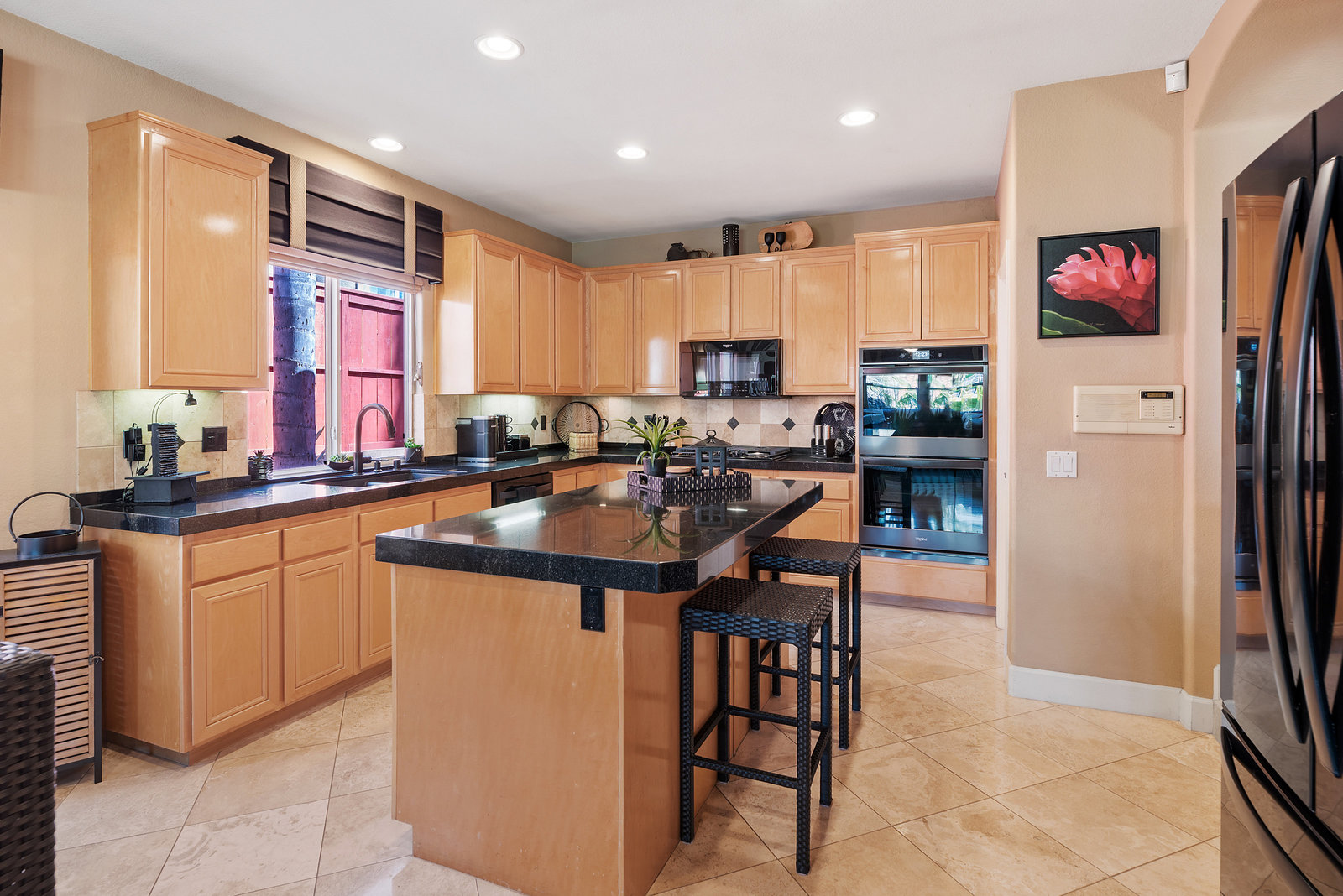 Staycation living at its best! Stunning 1-story home, 3+ bedrooms, 2 baths, 2257 sf, with your own private pool featuring a travertine privacy wall and waterfall! Fantastic location in the highly desirable Twin Oaks Valley Ranch community! The original owner has lovingly cared for and upgraded this beautiful home, which includes PAID Solar for the home and pool! In recent years, upgrades have included exterior paint, artificial turf, brick paver driveway and side walkways, front door invisible screen, kitchen remodel includes newer appliances and granite countertops, gorgeous spa-like bathroom remodels in both the primary and guest bathrooms, newer carpet and wood engineered flooring, sliding doors, newer fence, in home water system (softener and filtration), newer furnace & A/C! Noted exterior features: Pool with decking, raised waterfall, tropical landscaping. Inside features: elegant travertine floors, 6" baseboards, ceiling fans, plantation shutters, custom window coverings and blinds! The 2-Car Garage has storage cabinets and a built-in overhead storage rack. The 1-Car Garage has a workshop with built-in upper and lower cabinets including a countertop and sink! Public records show 4 bedrooms; however, the current layout includes 3 bedrooms (all with walk-in closets) and a den (no closet or door).
