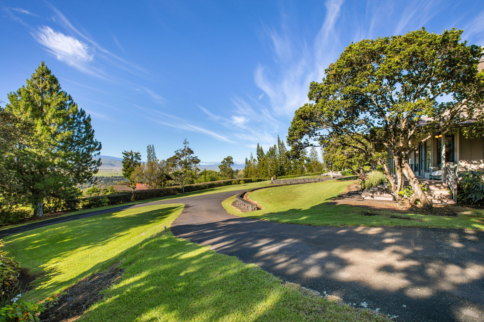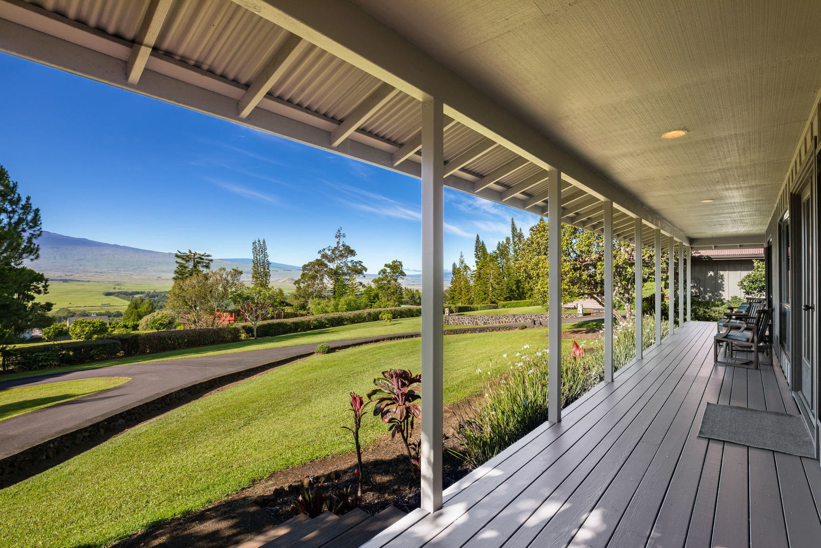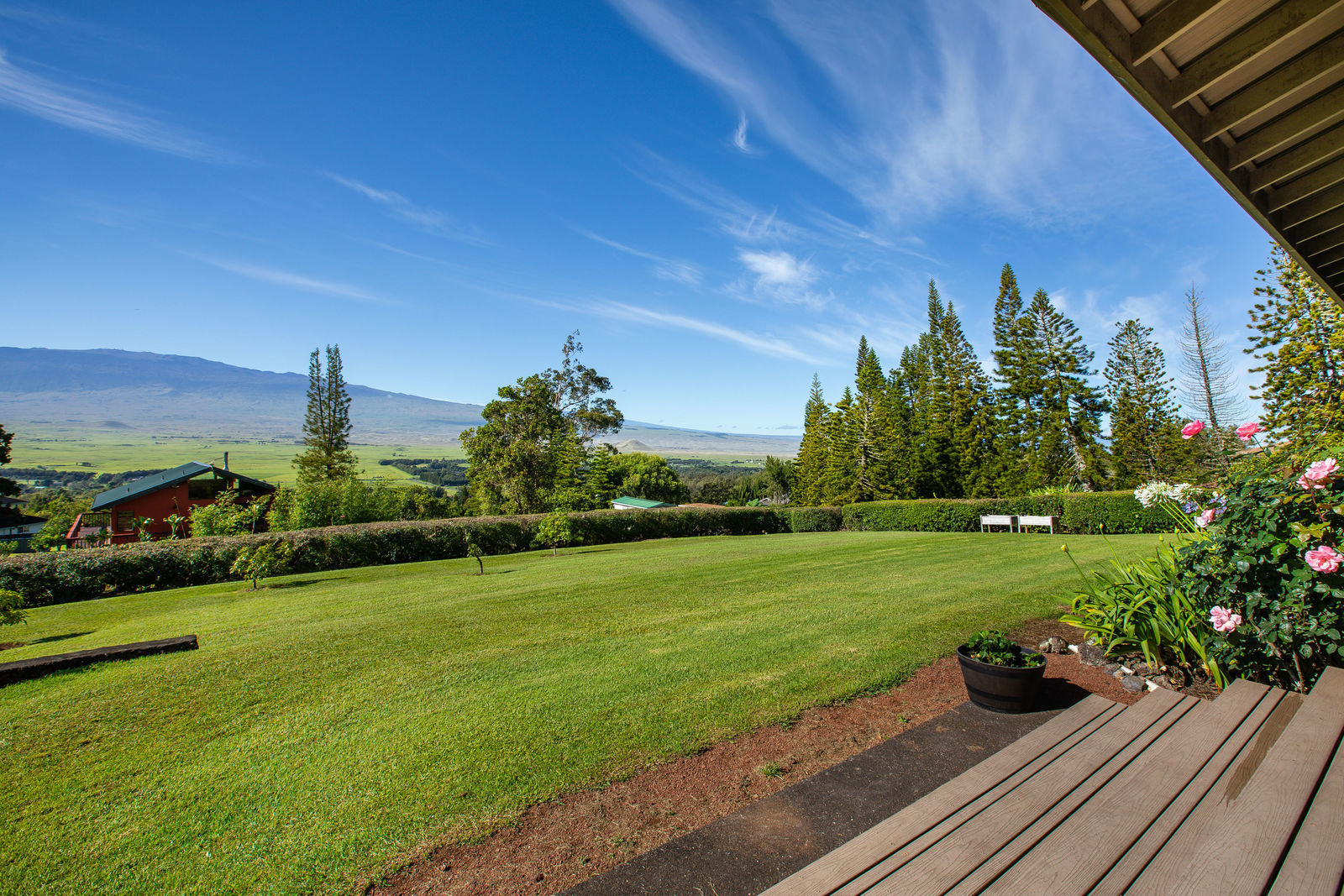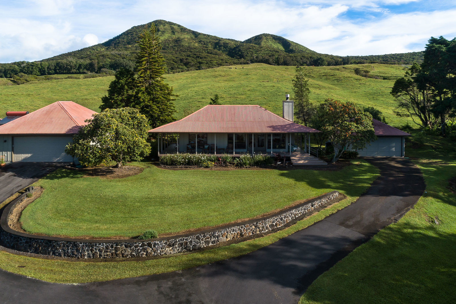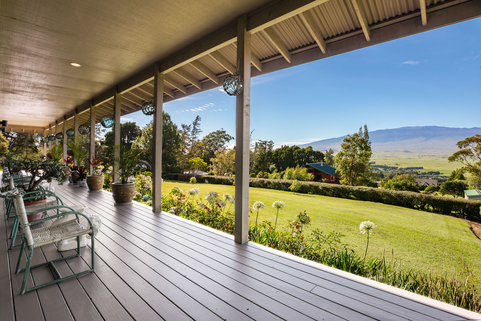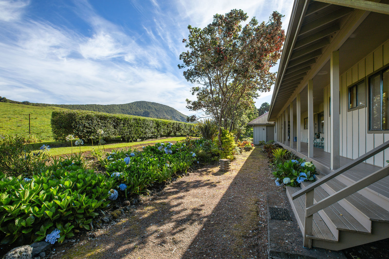 PRIVATE COMPOUND WITH FABULOUS MAUNA KEA VIEWS! Main home plus legal ohana (second home) on 1.2 acres.This property is adjacent to acres and acres of Hawaiian Home Lands pastures and the views from the back of the property are also gorgeous! The main house is 3299 sq. ft. with 3 bdrms., 2 1/2 bths., a den/office which could easily be a 4th bdrm. and two additional framed attic spaces that are 408 sq. ft. each. (Could also be bdrms.) There is also a small sitting room upstairs.The ohana is 864 sq. ft. with 2 bdrms., 1 bth. living room, kitchen and fireplace. This dwelling also has a detached 400 sq. ft. garage.Each home has a covered lanai that surrounds three sides of the house and gives easy access to the beautifully landscaped yard and gardens. Each house also has an enclosed garage with the main garage of 816 sq. ft. being large enough for a workshop if you have an at-home hobby.The floors of the main home are chocolate heart eucalyptus, there is a fireplace between the living room and family room, central heating, a large kitchen for those who love to cook includes an island and also an additional sink in the counter separating the kitchen and dining room. The master bedroom suite is located on the 1st floor. There is also a separate guest 1/2 bath off of the family room.The second house (Ohana) has been used for several years as a rental. The current tenants are on a month to month basis.