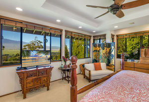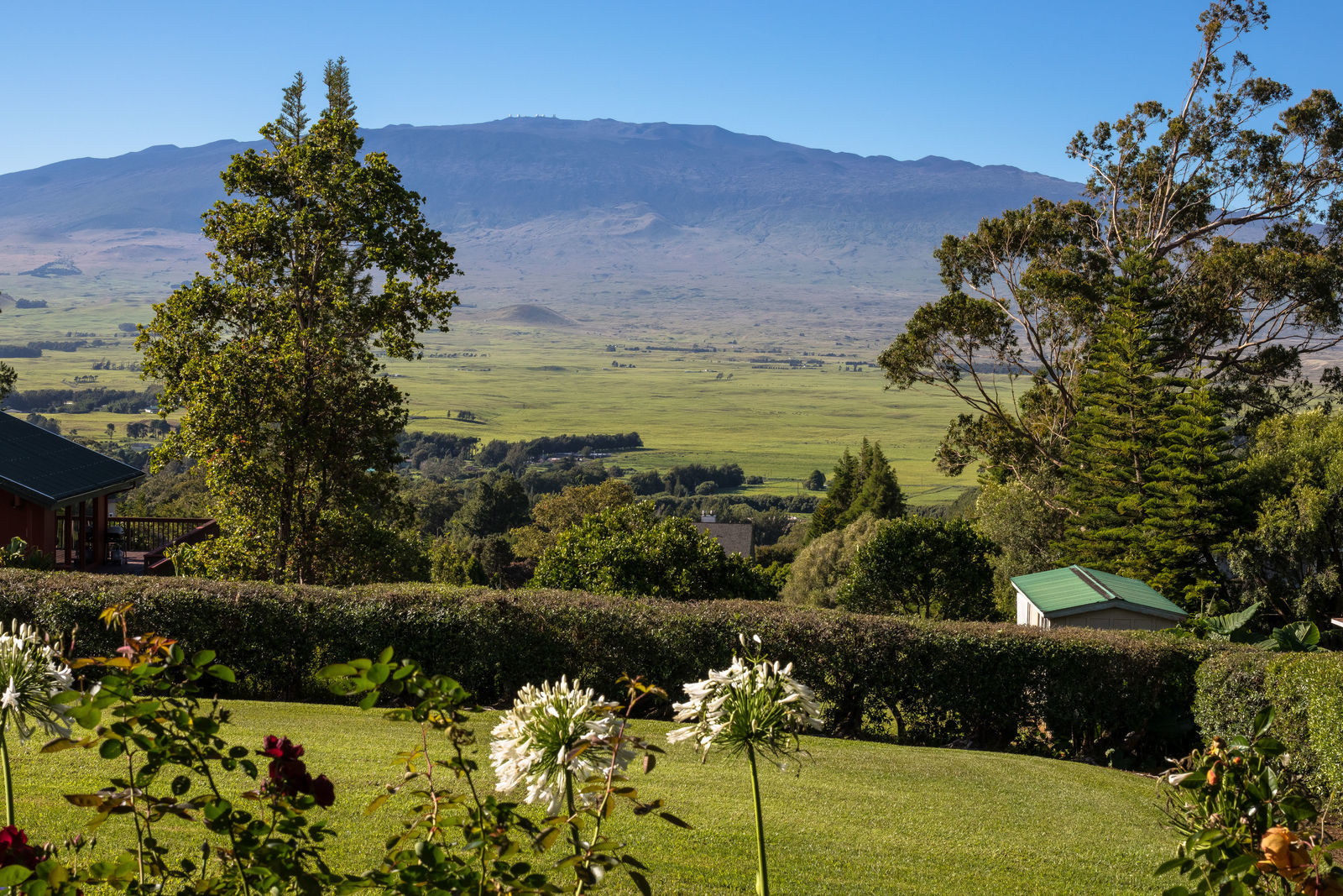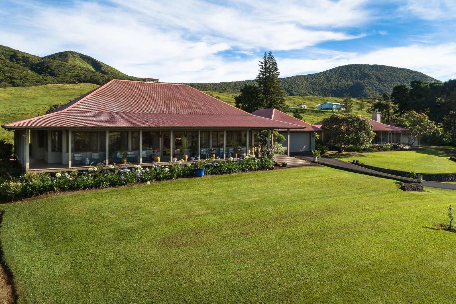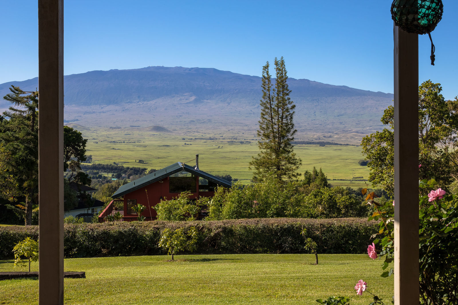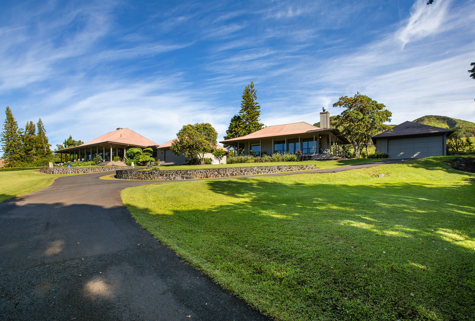 PRIVATE COMPOUND WITH FABULOUS MAUNA KEA VIEWS! Main home plus legal ohana (second home) on 1.2 acres.This property is adjacent to acres and acres of Hawaiian Home Lands pastures and the views from the back of the property are also gorgeous! The main house is 3299 sq. ft. with 3 bdrms., 2 1/2 bths., a den/office which could easily be a 4th bdrm. and two additional framed attic spaces that are 408 sq. ft. each. (Could also be bdrms.) There is also a small sitting room upstairs.The ohana is 864 sq. ft. with 2 bdrms., 1 bth. living room, kitchen and fireplace. This dwelling also has a detached 400 sq. ft. garage.Each home has a covered lanai that surrounds three sides of the house and gives easy access to the beautifully landscaped yard and gardens. Each house also has an enclosed garage with the main garage of 816 sq. ft. being large enough for a workshop if you have an at-home hobby.The floors of the main home are chocolate heart eucalyptus, there is a fireplace between the living room and family room, central heating, a large kitchen for those who love to cook includes an island and also an additional sink in the counter separating the kitchen and dining room. The master bedroom suite is located on the 1st floor. There is also a separate guest 1/2 bath off of the family room.The second house (Ohana) has been used for several years as a rental. The current tenants are on a month to month basis.