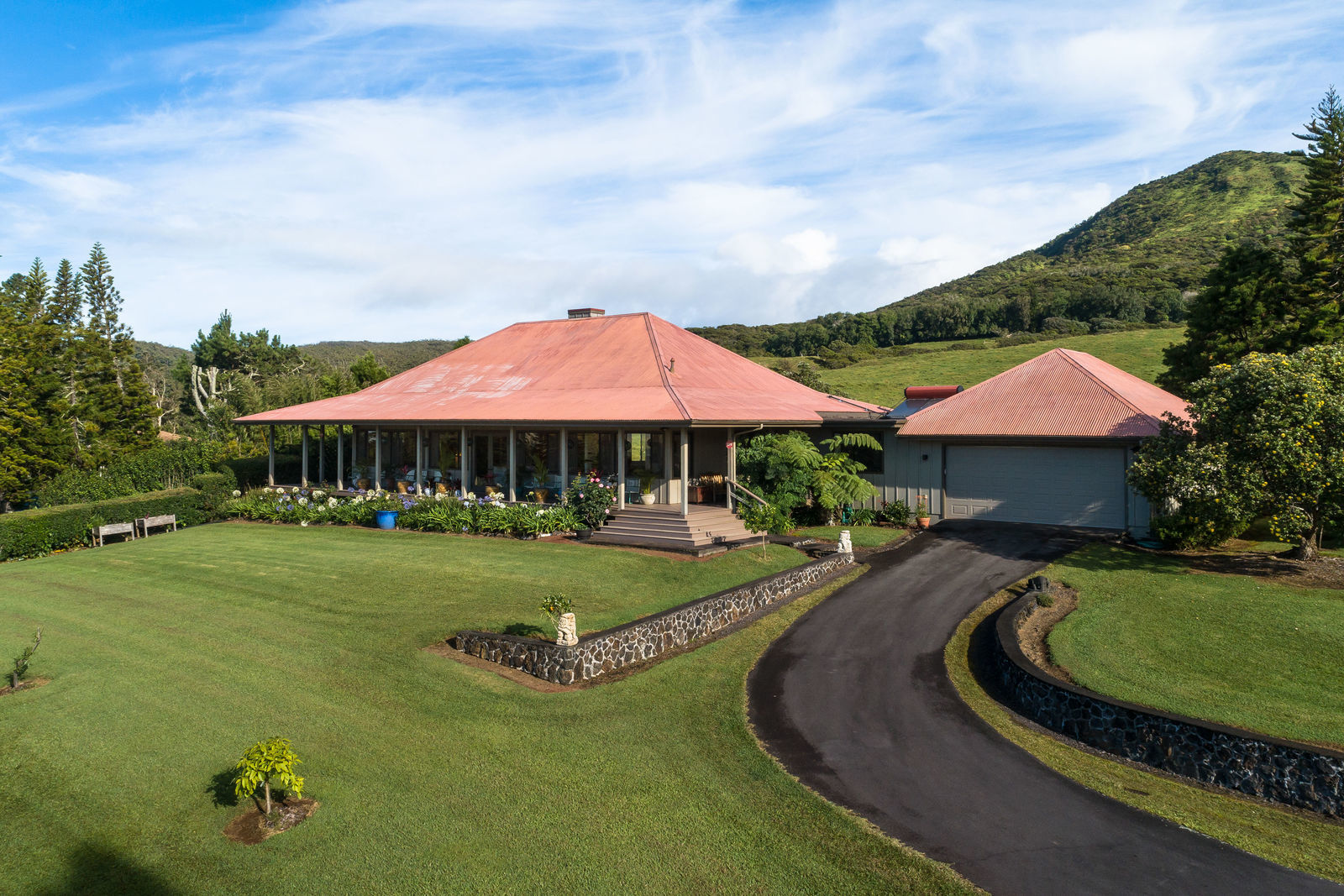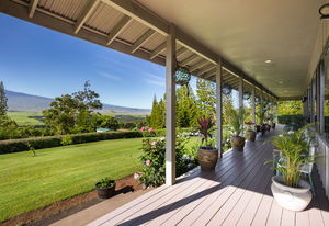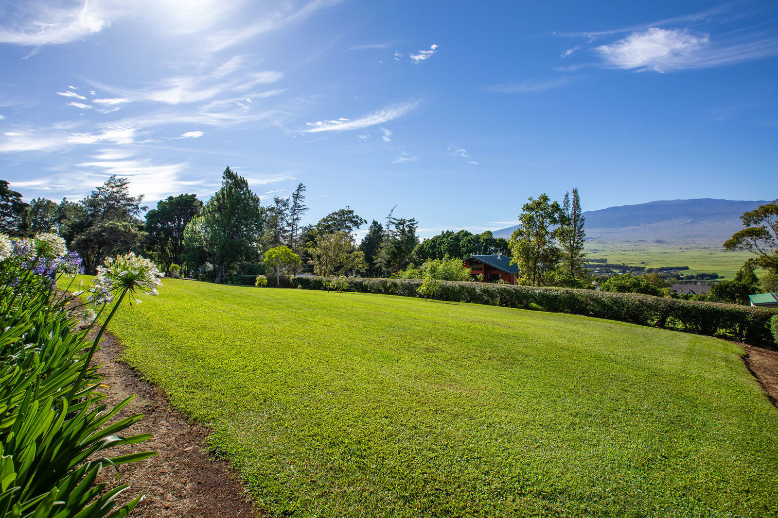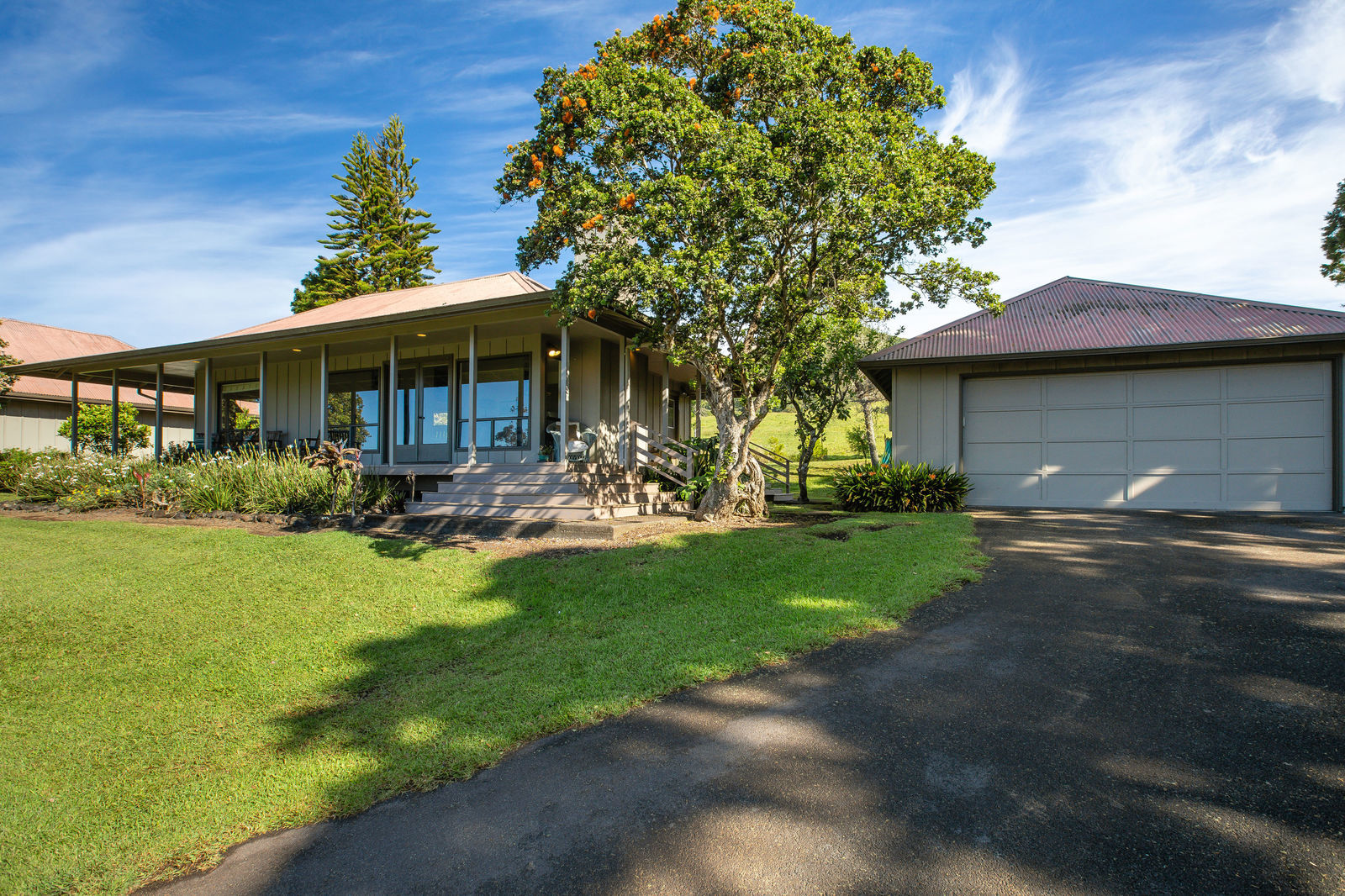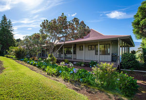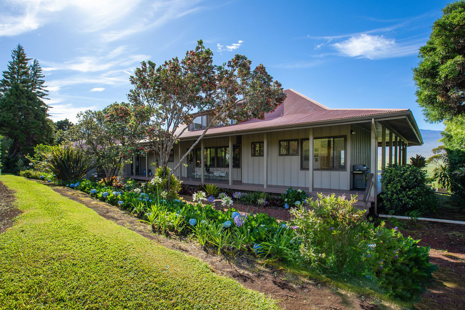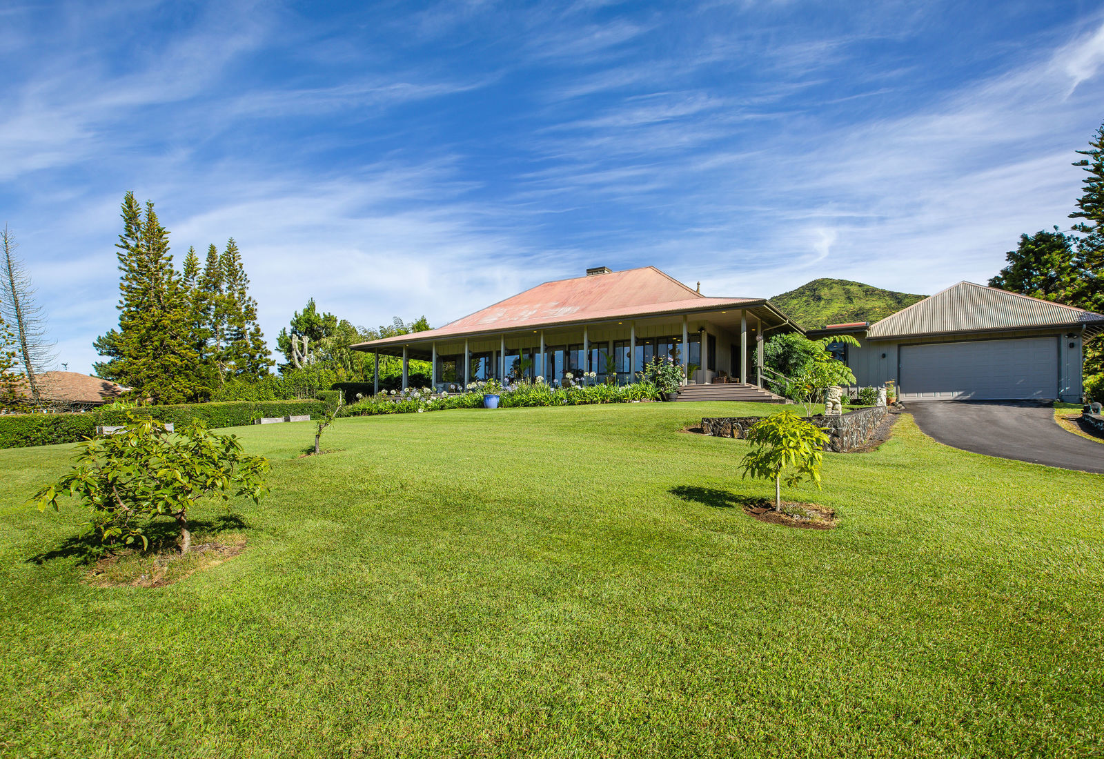 PRIVATE COMPOUND WITH FABULOUS MAUNA KEA VIEWS! Main home plus legal ohana (second home) on 1.2 acres.This property is adjacent to acres and acres of Hawaiian Home Lands pastures and the views from the back of the property are also gorgeous! The main house is 3299 sq. ft. with 3 bdrms., 2 1/2 bths., a den/office which could easily be a 4th bdrm. and two additional framed attic spaces that are 408 sq. ft. each. (Could also be bdrms.) There is also a small sitting room upstairs.The ohana is 864 sq. ft. with 2 bdrms., 1 bth. living room, kitchen and fireplace. This dwelling also has a detached 400 sq. ft. garage.Each home has a covered lanai that surrounds three sides of the house and gives easy access to the beautifully landscaped yard and gardens. Each house also has an enclosed garage with the main garage of 816 sq. ft. being large enough for a workshop if you have an at-home hobby.The floors of the main home are chocolate heart eucalyptus, there is a fireplace between the living room and family room, central heating, a large kitchen for those who love to cook includes an island and also an additional sink in the counter separating the kitchen and dining room. The master bedroom suite is located on the 1st floor. There is also a separate guest 1/2 bath off of the family room.The second house (Ohana) has been used for several years as a rental. The current tenants are on a month to month basis.