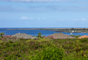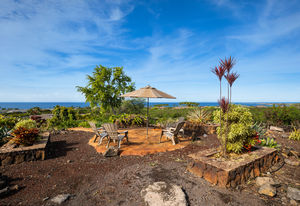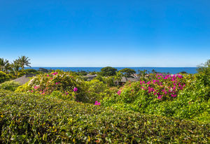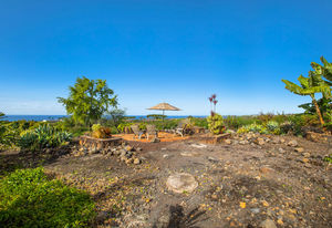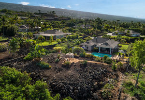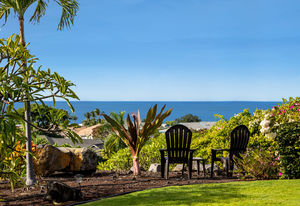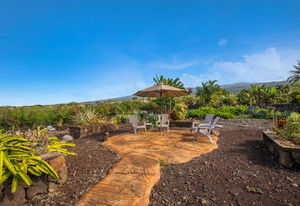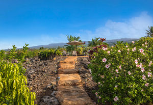 A tropically landscaped garden path leads to a sunset vantage point atop a natural lava knoll.