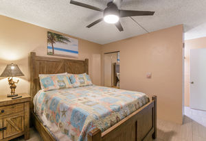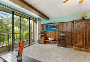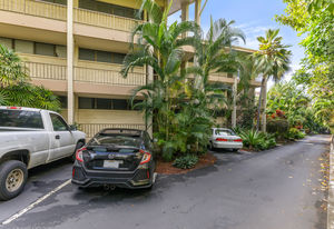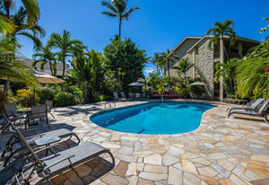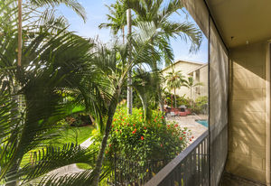End unit adjacent to pool with tropical garden views, near assigned parking stall.