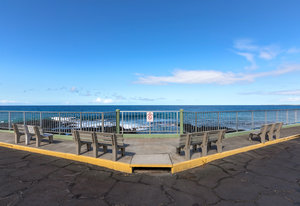 Oceanfront sunset viewing area, with steps down to the dramatic rocky shoreline.