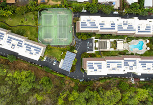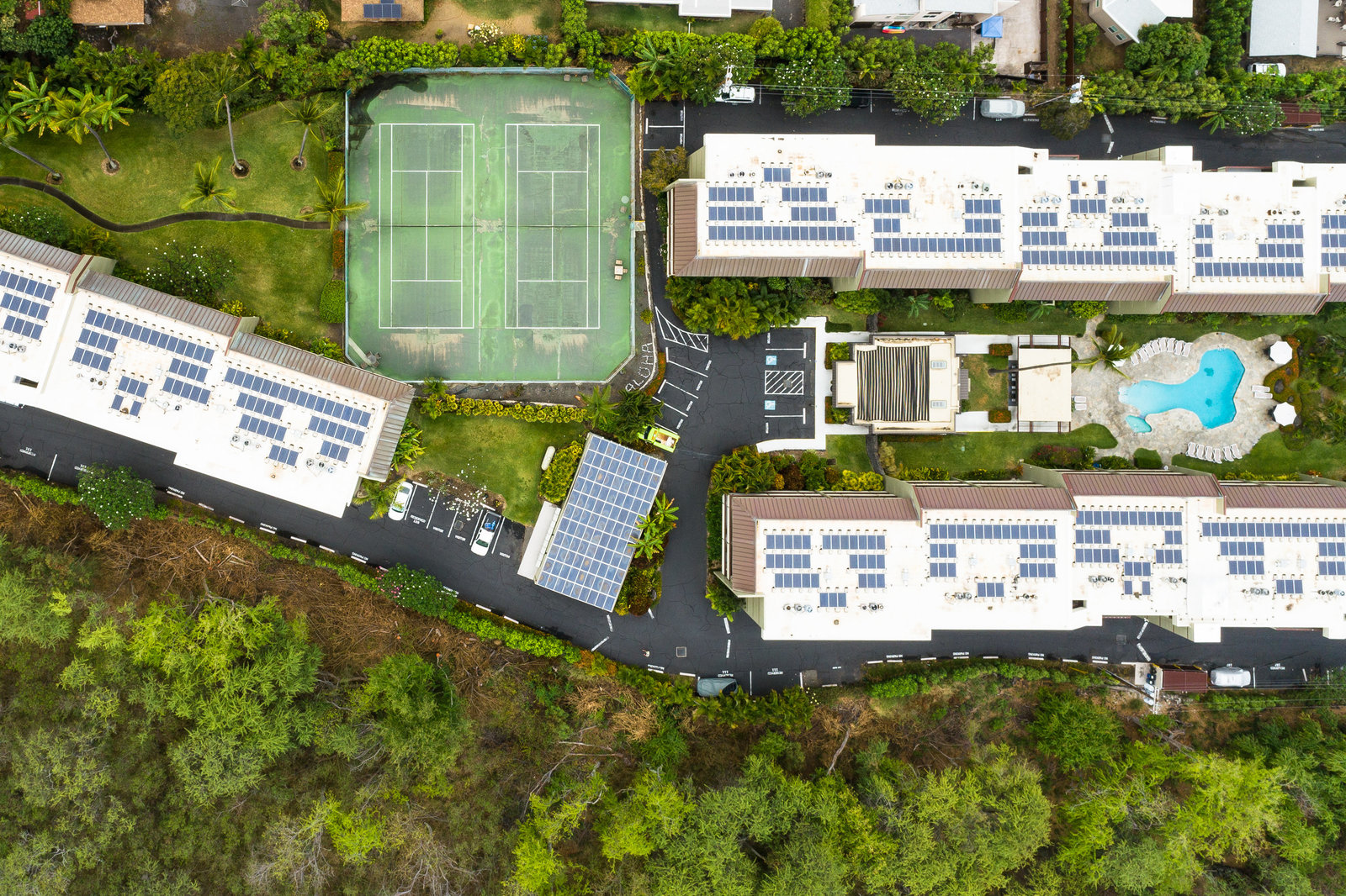 Concrete building with rooftop photovoltaic and covered tandem 2-car parking underneath.