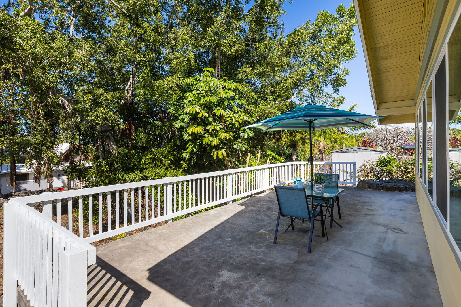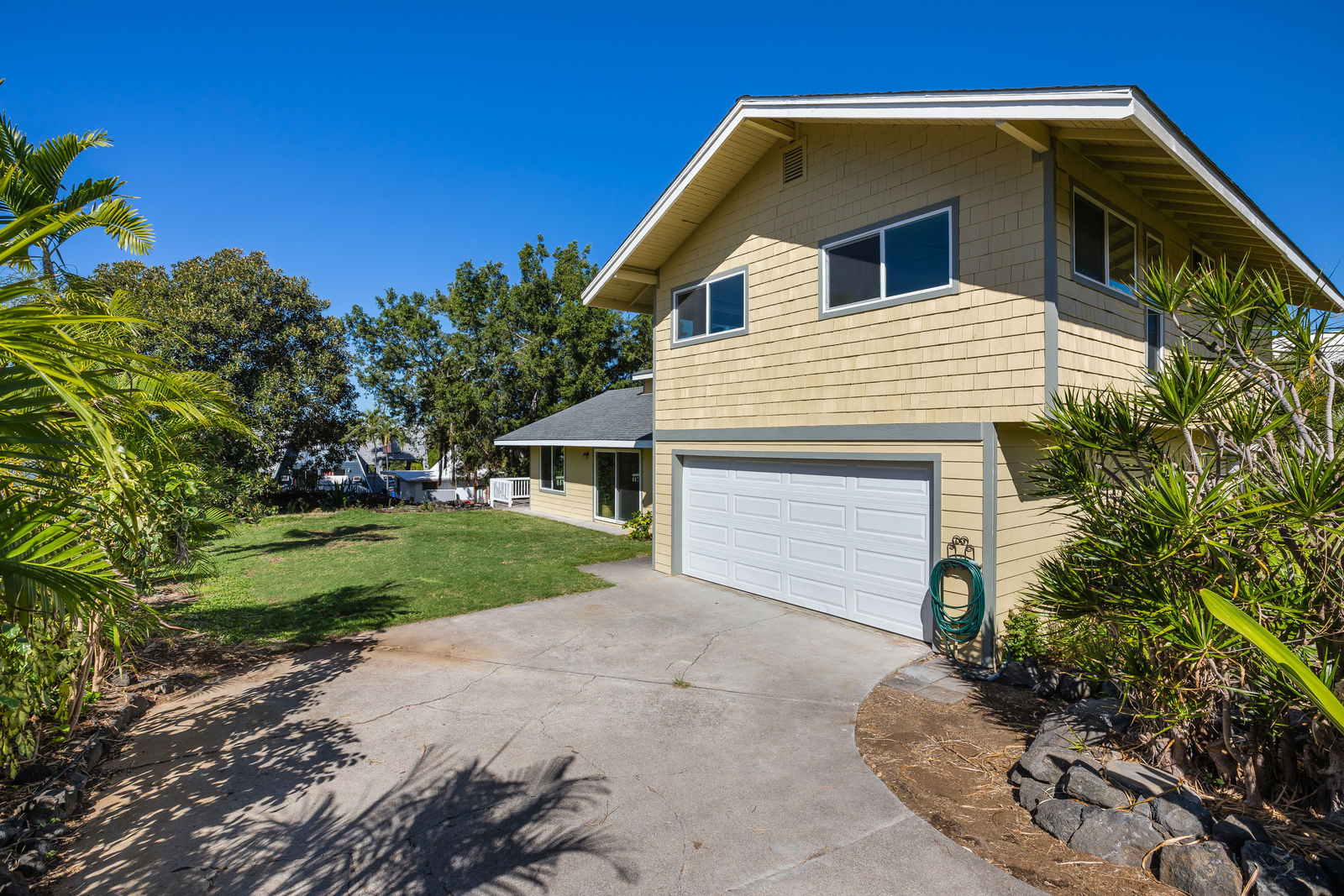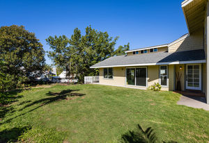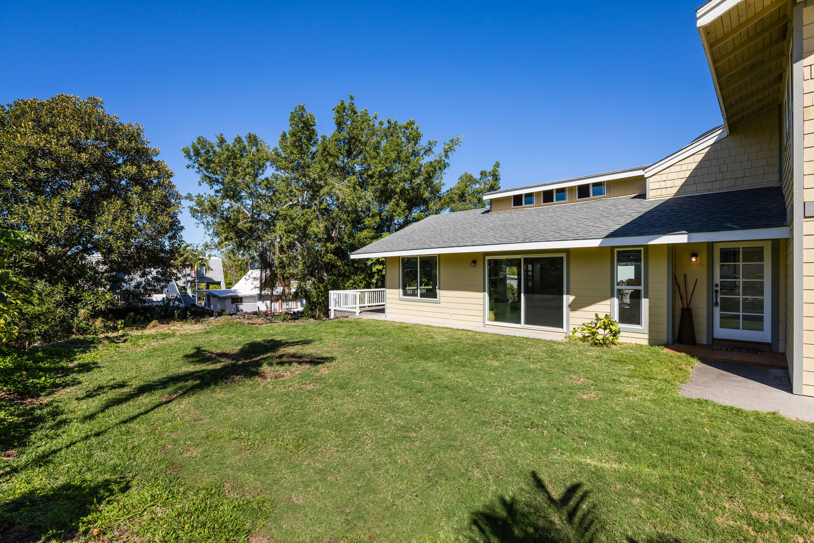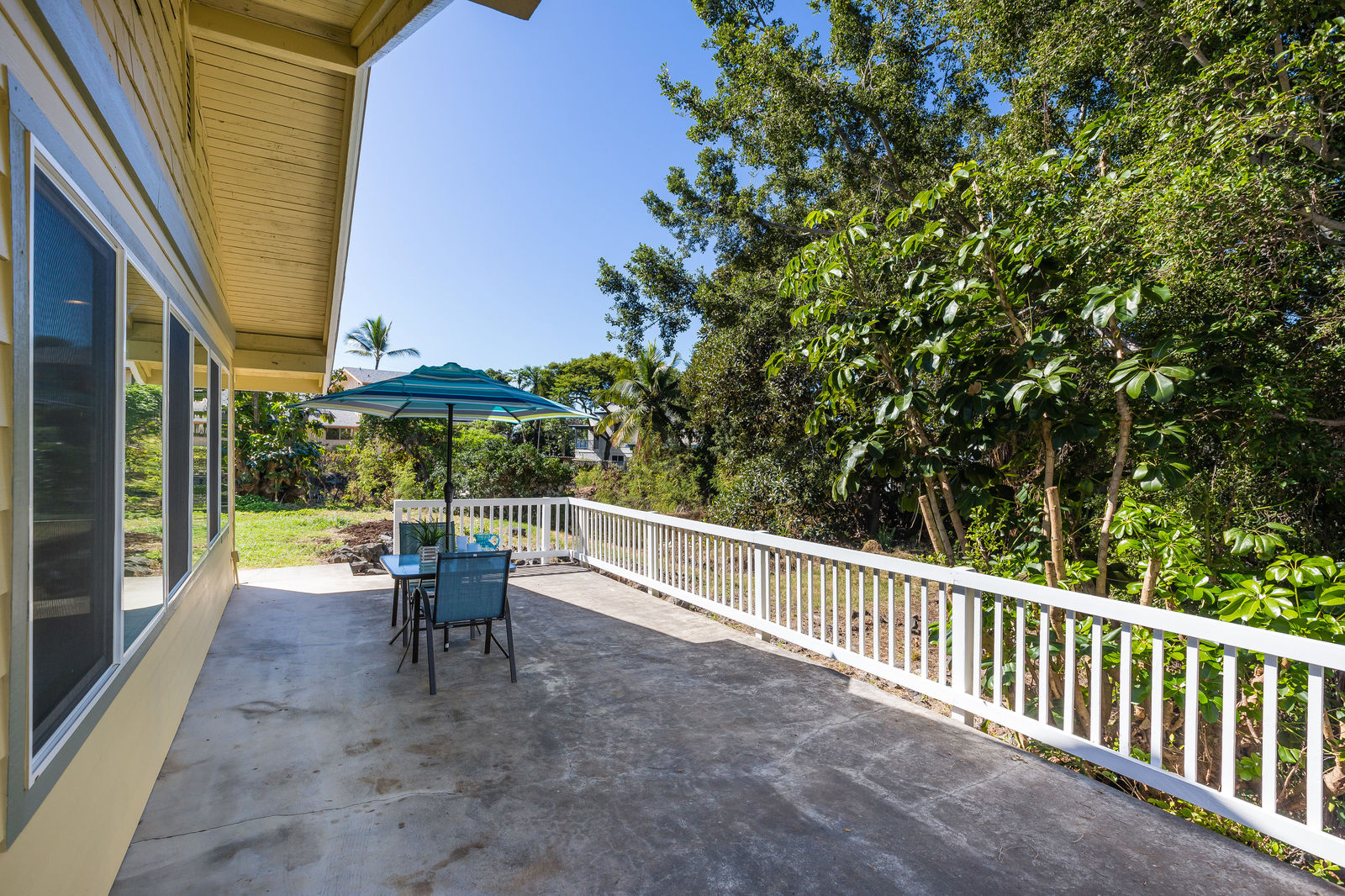 Alongside the house are a large concrete patio and grassy lawn area.