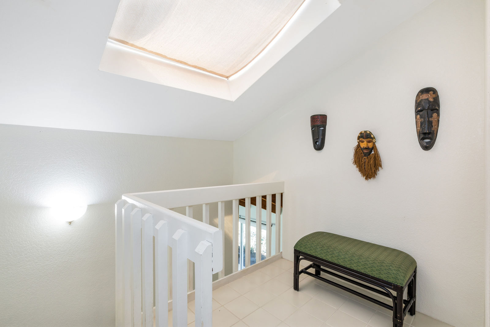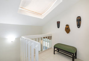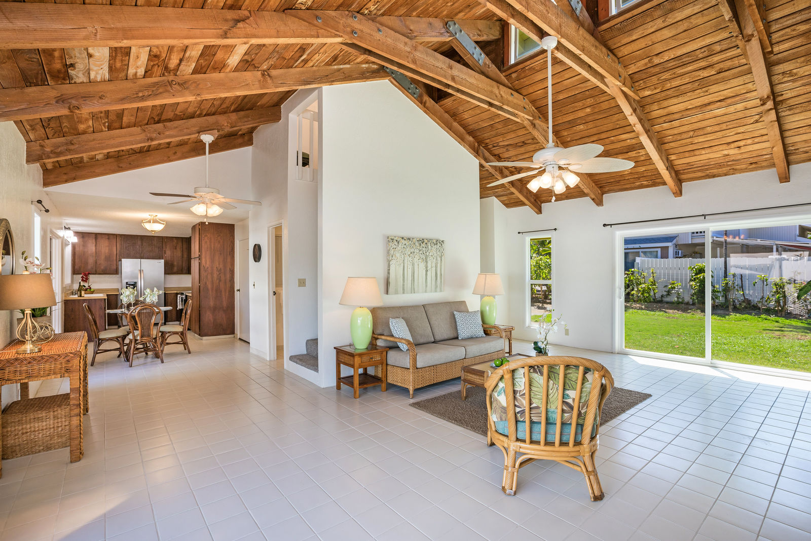 Towering, vented, open beam ceiling in living room, skylights upstairs.