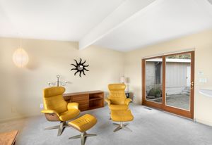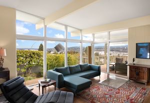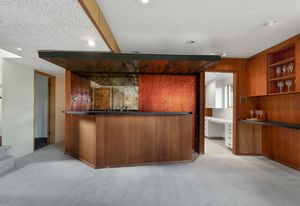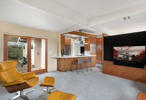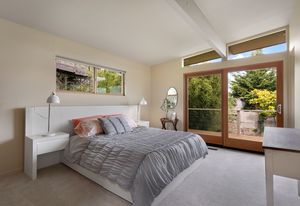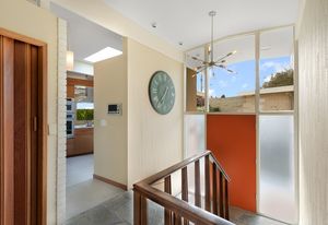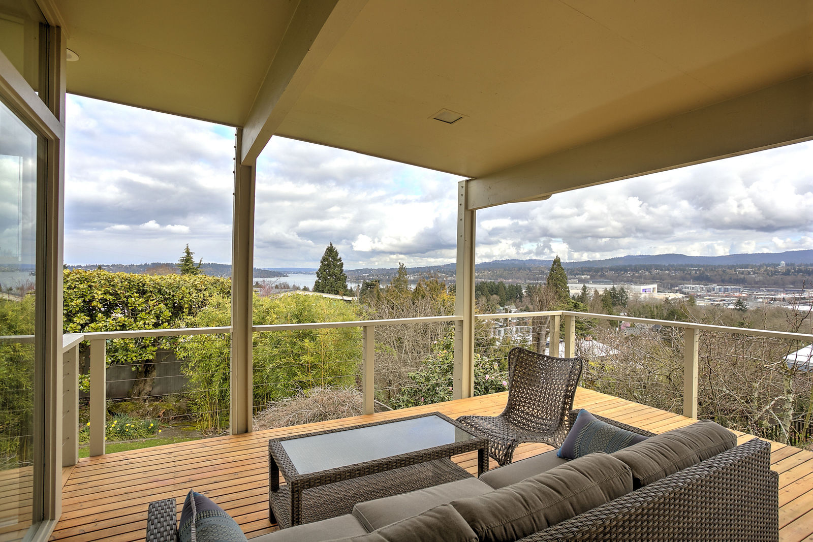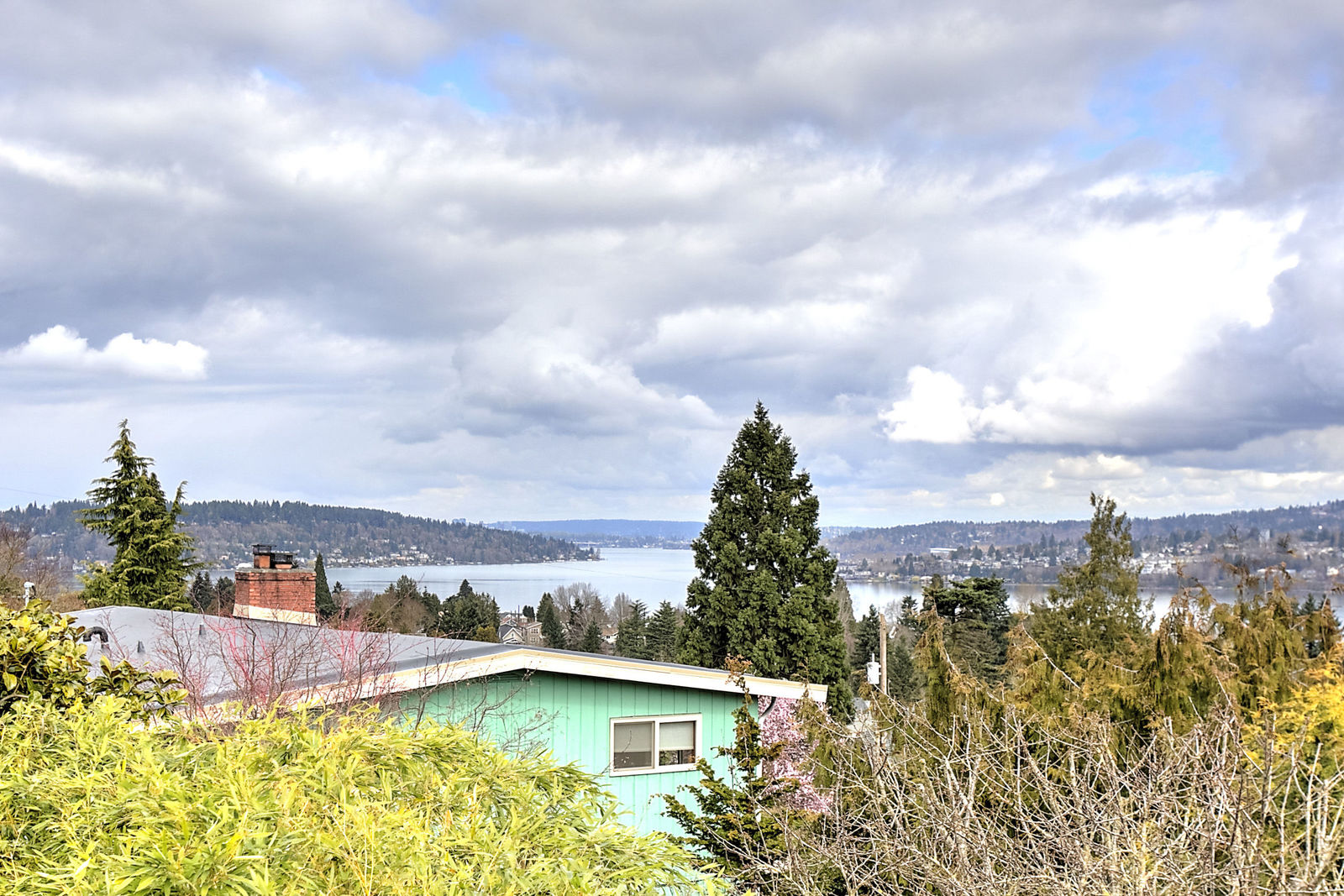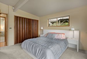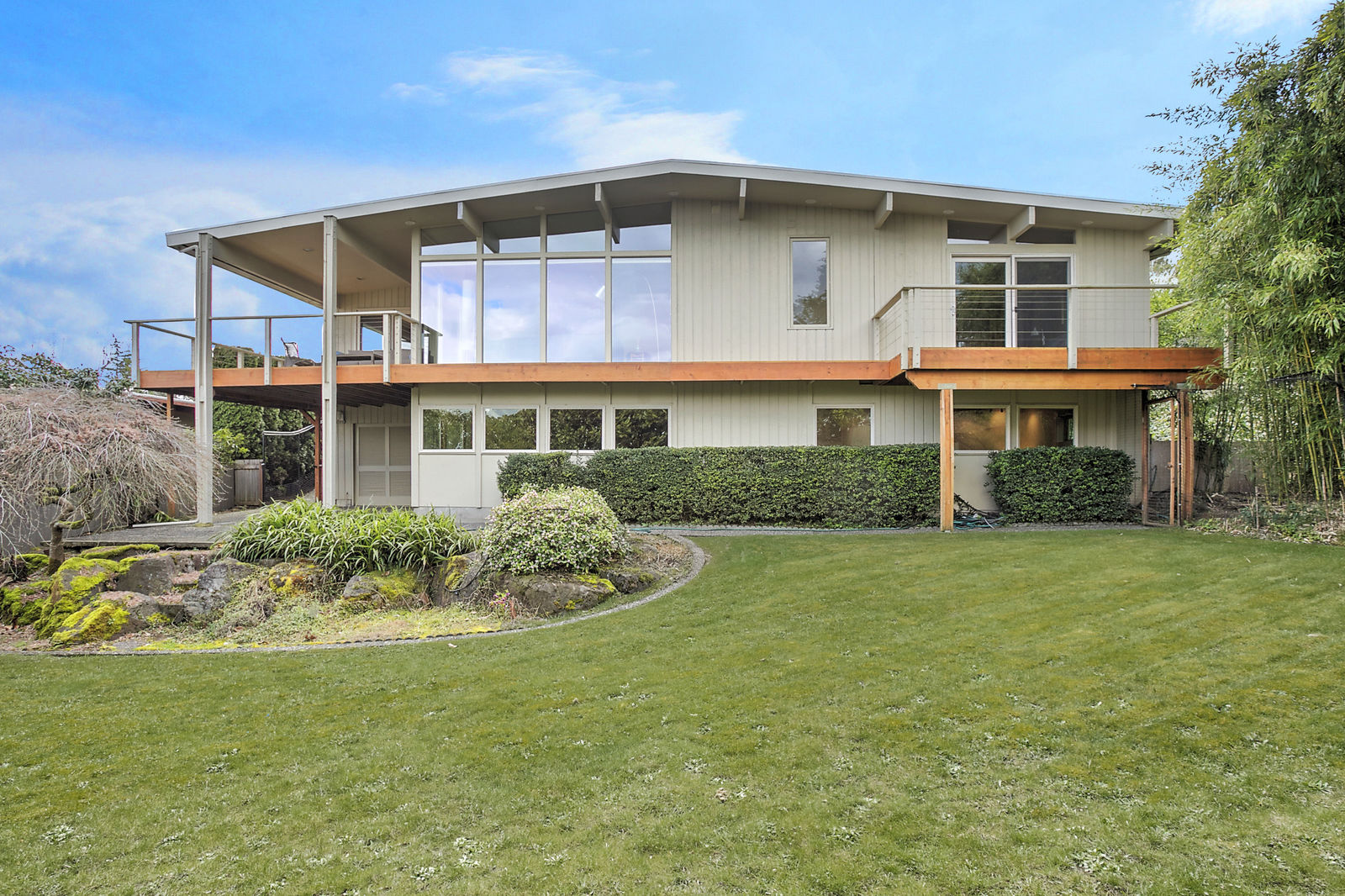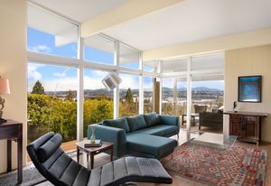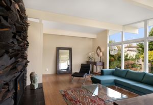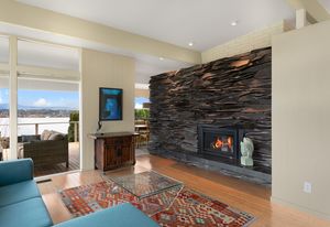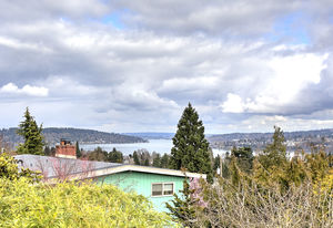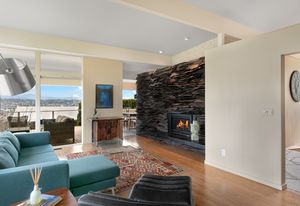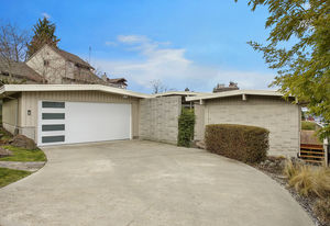 Panoramic Lake Washington and Mountain Views in Bryn Mawr! Private and Gated Custom Updated Mid-Century Home Located on a Quiet dead-end street with a warm and bright open floor plan.