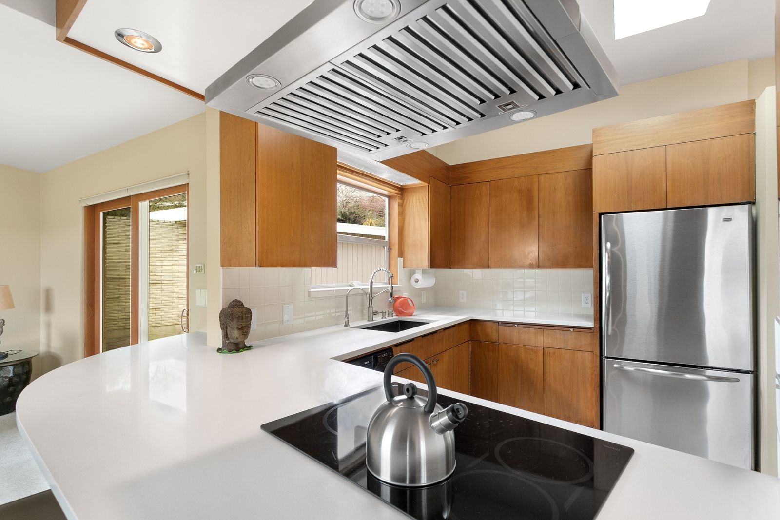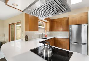 Inviting split entry with vaulted ceilings, wide floor to ceiling windows and skylights bring in tons of natural light. Kitchen features quartz countertops, stainless steel appliances, induction range and breakfast bar open to family room. Head to the viewing deck from the living or dining room. Basalt fireplace is beautifully designed with a gas insert.