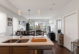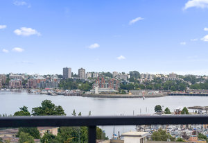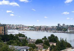 Prepare to be impressed with this delightful Ocean View condo! 130 square feet of patio space will provide you ample space to enjoy outdoor living while overlooking your water views. This 1 bedroom, 1 bathroom corner suite featuring oversized windows, an open plan with an efficient gourmet kitchen, quartz countertops & stainless appliances, plus maple engineered flooring. This building offers an amazing location, 2 roof top patios with stunning ocean views & mountain views, high speed elevator, secured underground parking, a storage unit & bike storage. Skyline Residences is conveniently located just minutes from downtown Victoria, a block away from the ocean, & many shops. It is also minutes from CFB Esquimalt, walking distance to many parks including Saxe Point & Macauley Park as well on a major bus route. This building is a well maintained & managed. A major PLUS is this building allows rentals & is pet-friendly. You will not find a more fantastic building to live in!!