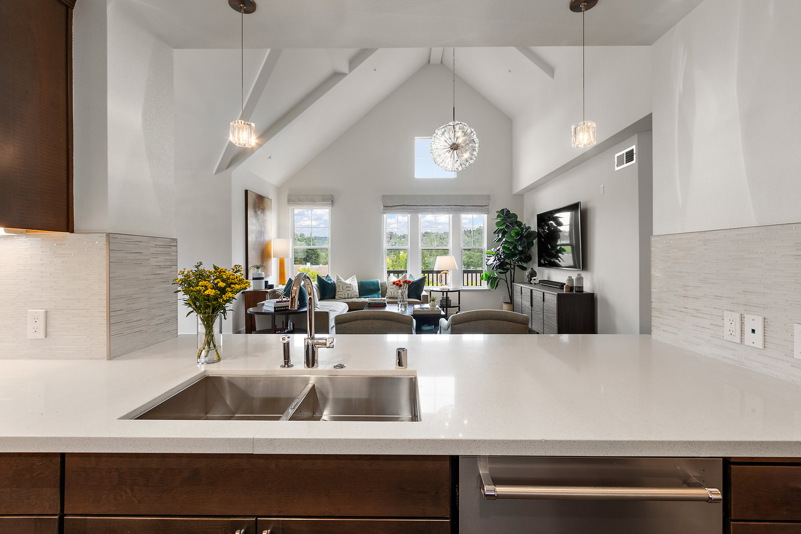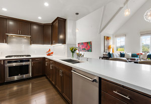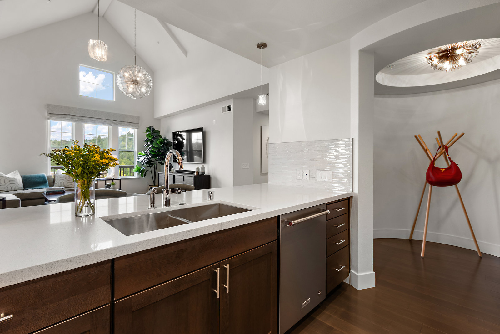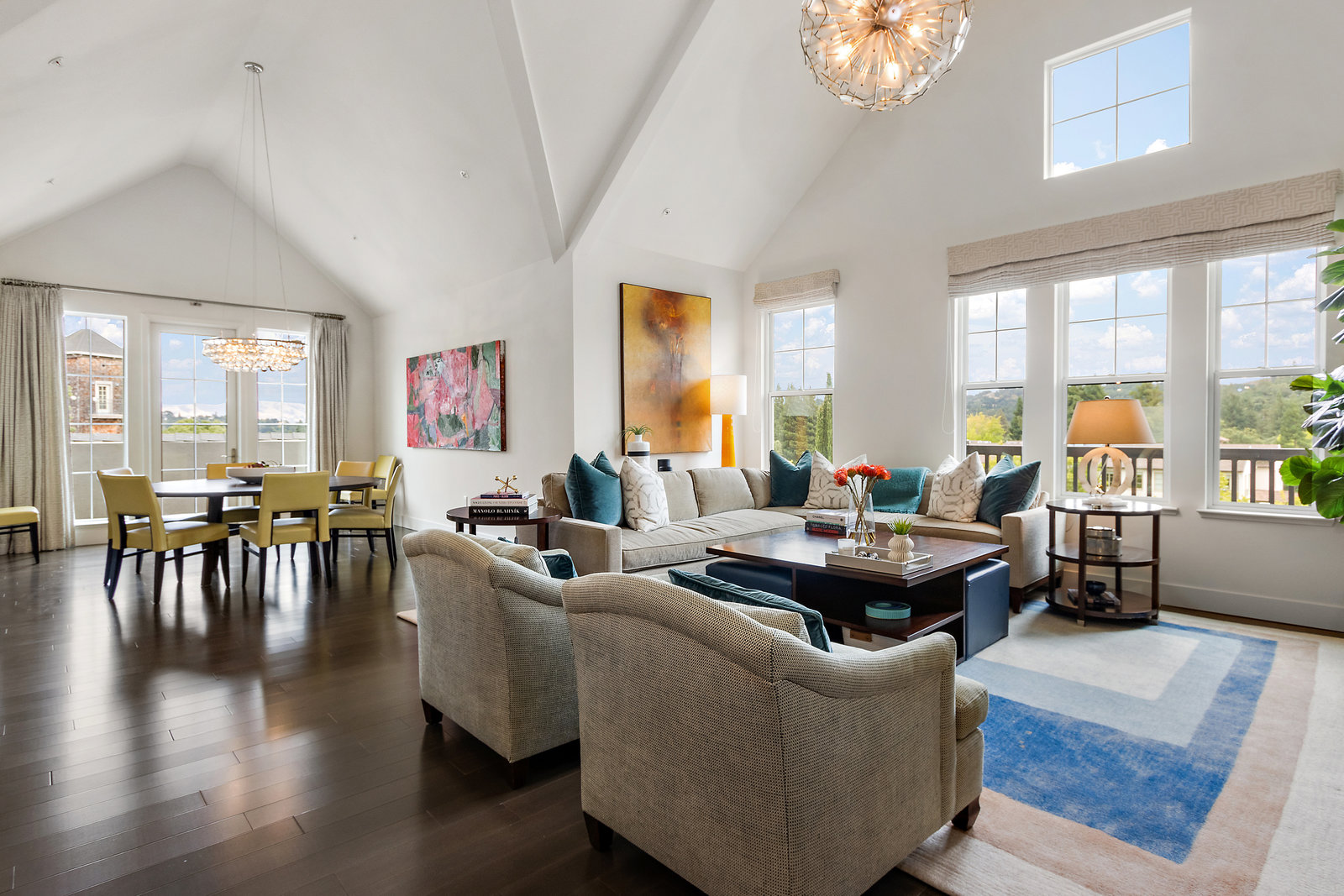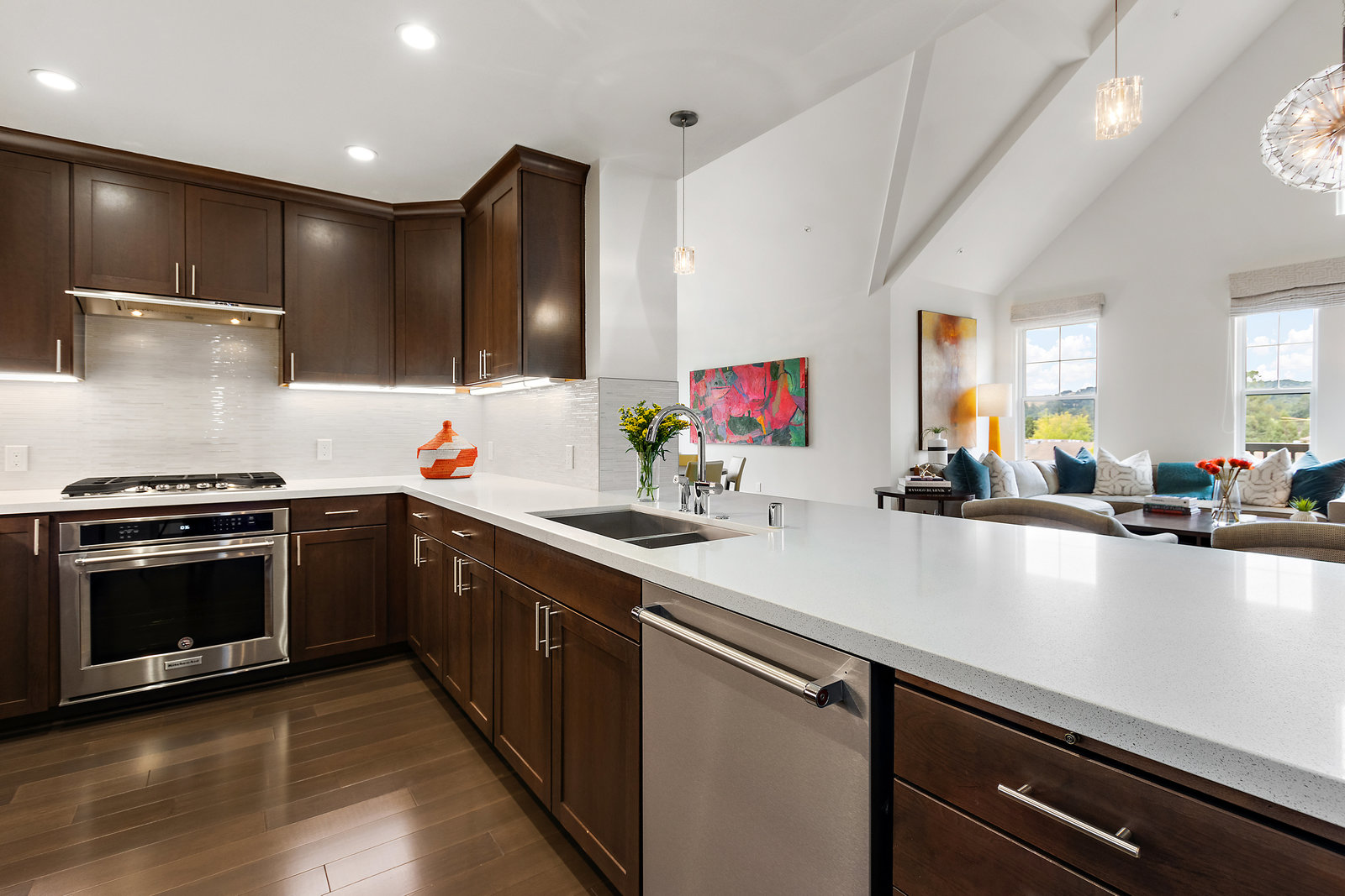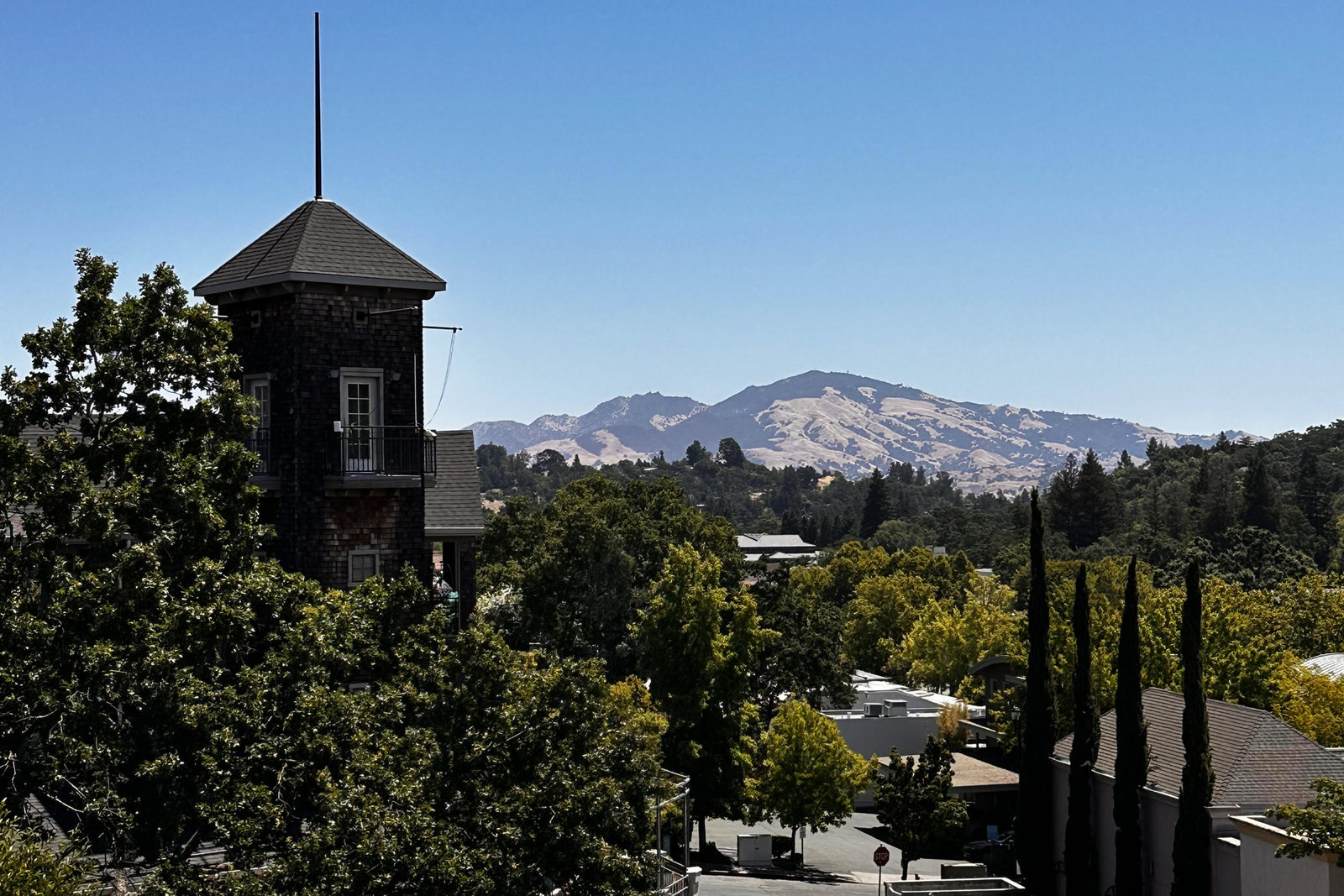 Welcome to Unit 416 – a rare and sophisticated top-floor sanctuary in the heart of downtown Lafayette. Ideally situated just steps from acclaimed restaurants, charming boutiques, cozy cafés, BART, and essential conveniences, this impeccably appointed residence offers an unparalleled blend of luxury, comfort, and location. Perched serenely on the fourth floor, the home is bathed in natural light and framed by soaring cathedral ceilings. Designer lighting—highlighted by an exquisite Ochre chandelier—adds a refined touch to the open-concept layout, thoughtfully designed for effortless modern living. Step onto your private balcony and take in sweeping vistas of Mt. Diablo and the rolling Lafayette hills—a tranquil retreat above it all. The chef’s kitchen, with stainless steel appliances, is both functional and beautiful, featuring Caesarstone quartz countertops, a striking glass tile backsplash, a 5-burner gas range, oversized built-in refrigerator, and ample counter seating—perfect for both entertaining and everyday living. The primary suite is a peaceful haven, offering dual vanities, a custom walk-in closet, and a spa-like ambiance that invites rest and relaxation. Additional highlights include: • Rich hardwood floors • In-unit laundry • Central heating and air conditioning • Two side-by-side assigned parking spaces • Bike storage • Secure building access Discover elevated living in one of Lafayette’s most coveted addresses. This exceptional top-floor residence is truly a rare offering.
