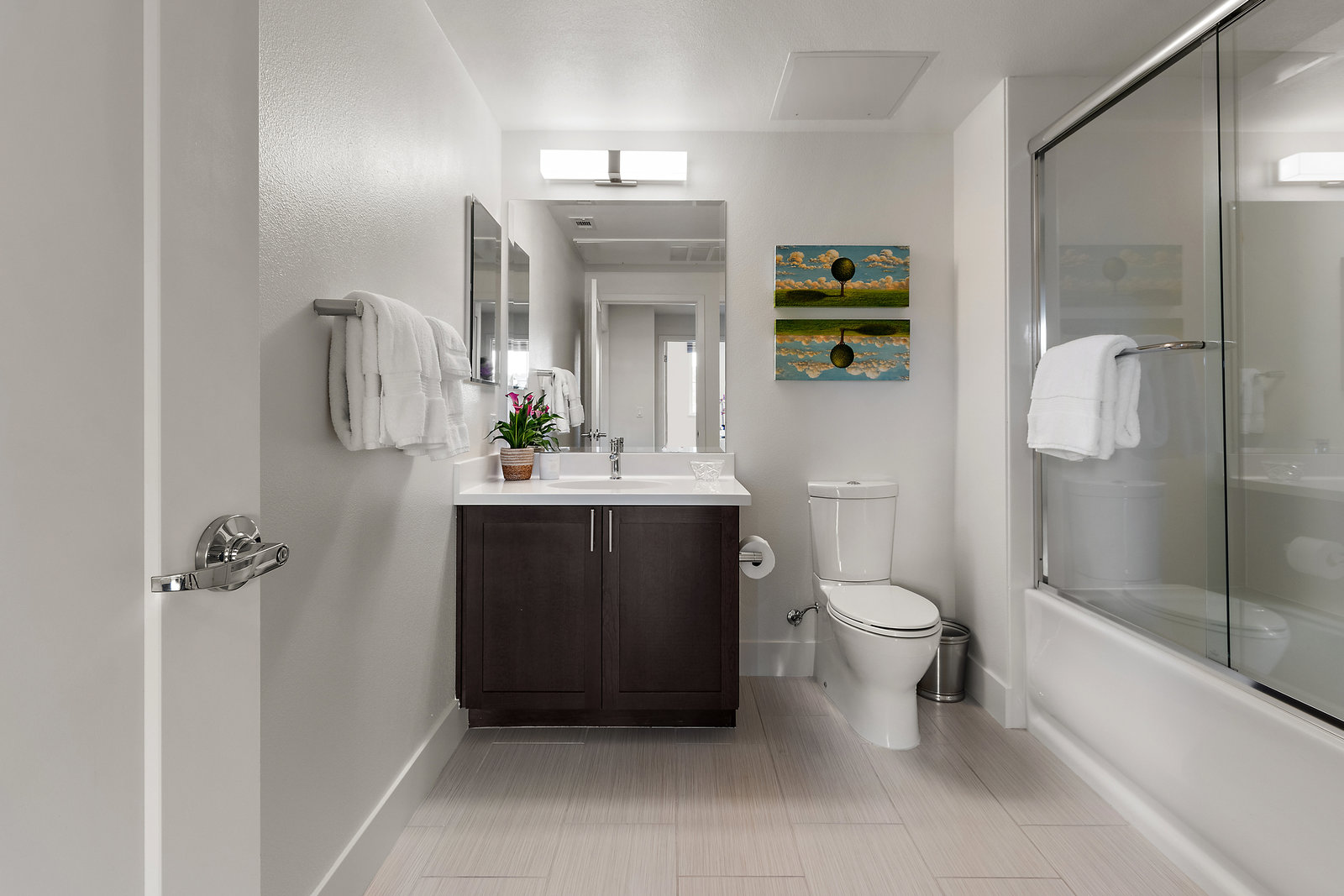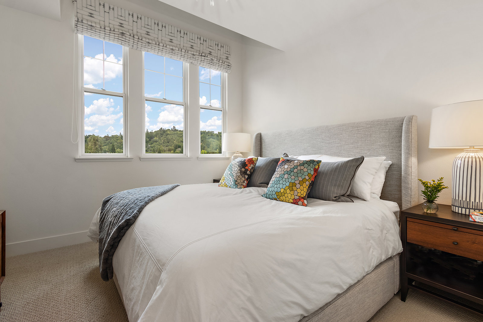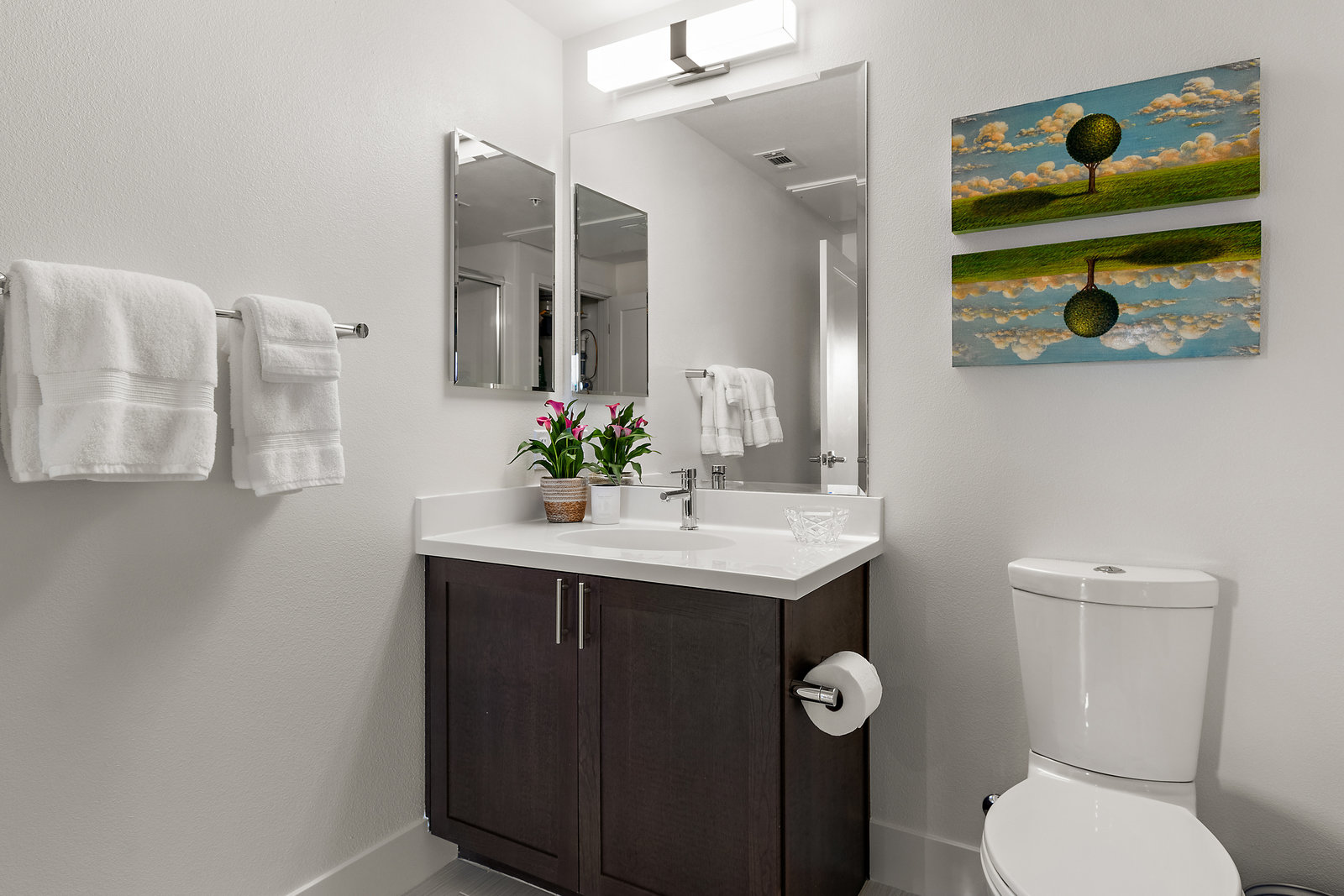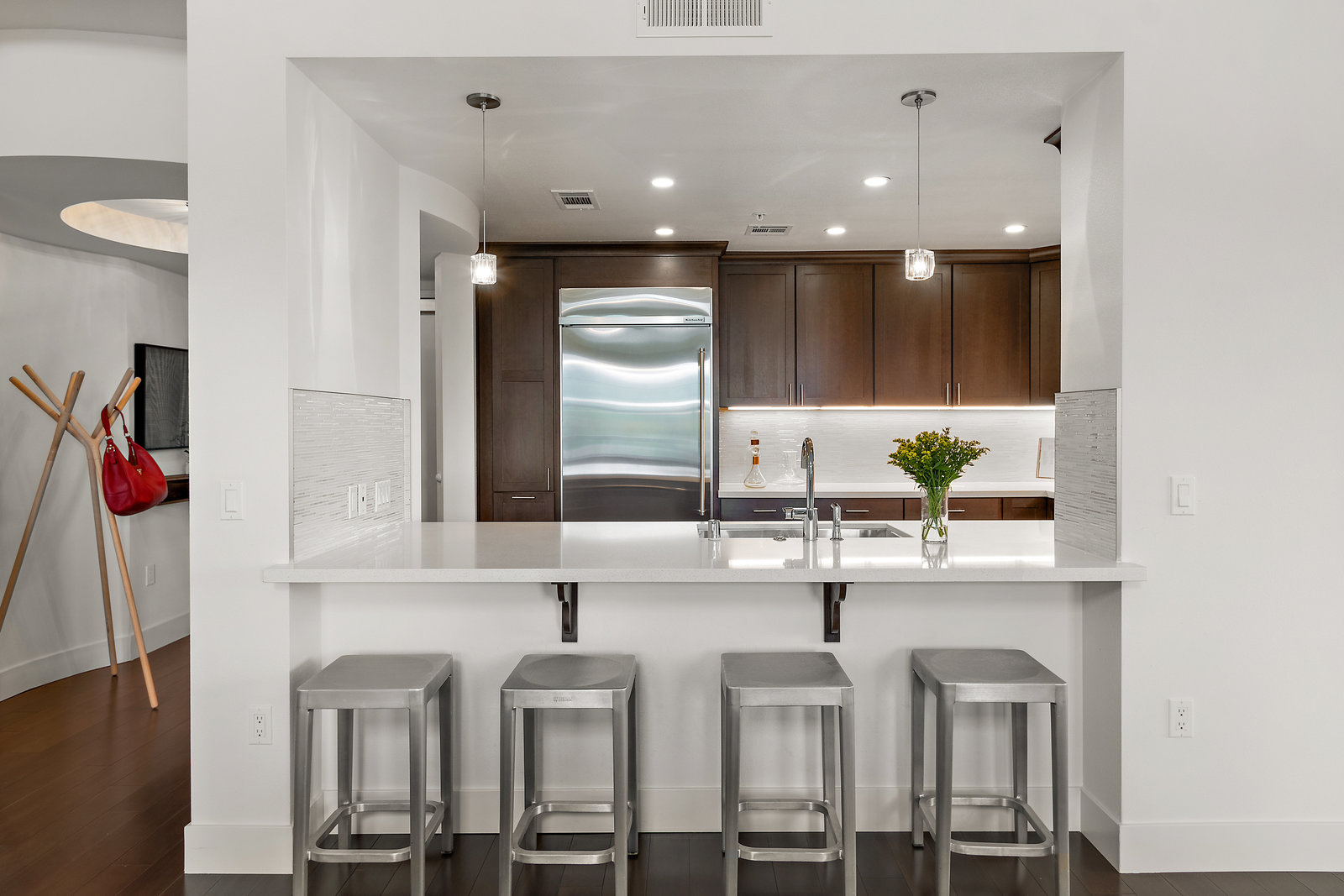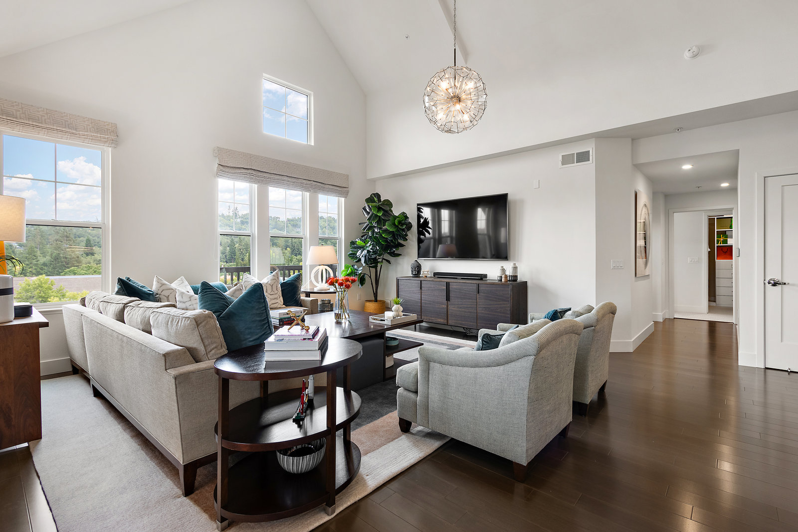 Welcome to Unit 416 – a rare and sophisticated top-floor sanctuary in the heart of downtown Lafayette. Ideally situated just steps from acclaimed restaurants, charming boutiques, cozy cafés, BART, and essential conveniences, this impeccably appointed residence offers an unparalleled blend of luxury, comfort, and location. Perched serenely on the fourth floor, the home is bathed in natural light and framed by soaring cathedral ceilings. Designer lighting—highlighted by an exquisite Ochre chandelier—adds a refined touch to the open-concept layout, thoughtfully designed for effortless modern living. Step onto your private balcony and take in sweeping vistas of Mt. Diablo and the rolling Lafayette hills—a tranquil retreat above it all. The chef’s kitchen, with stainless steel appliances, is both functional and beautiful, featuring Caesarstone quartz countertops, a striking glass tile backsplash, a 5-burner gas range, oversized built-in refrigerator, and ample counter seating—perfect for both entertaining and everyday living. The primary suite is a peaceful haven, offering dual vanities, a custom walk-in closet, and a spa-like ambiance that invites rest and relaxation. Additional highlights include: • Rich hardwood floors • In-unit laundry • Central heating and air conditioning • Two side-by-side assigned parking spaces • Bike storage • Secure building access Discover elevated living in one of Lafayette’s most coveted addresses. This exceptional top-floor residence is truly a rare offering.