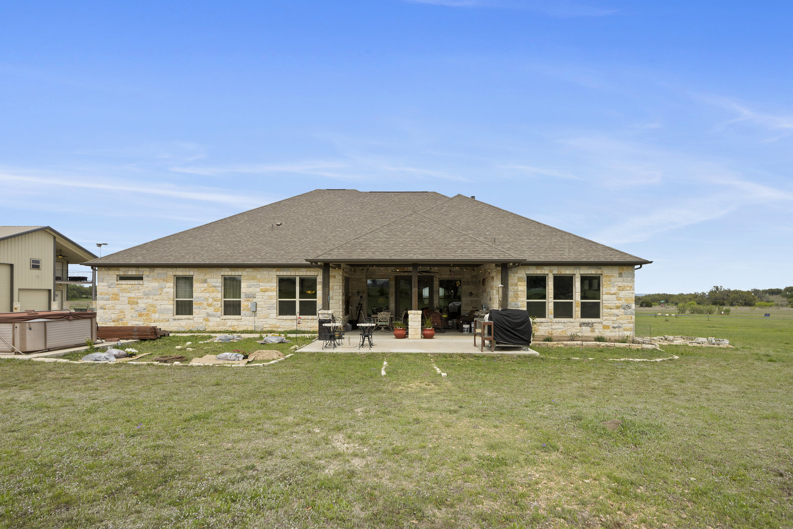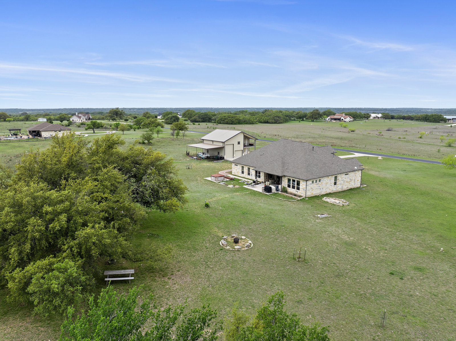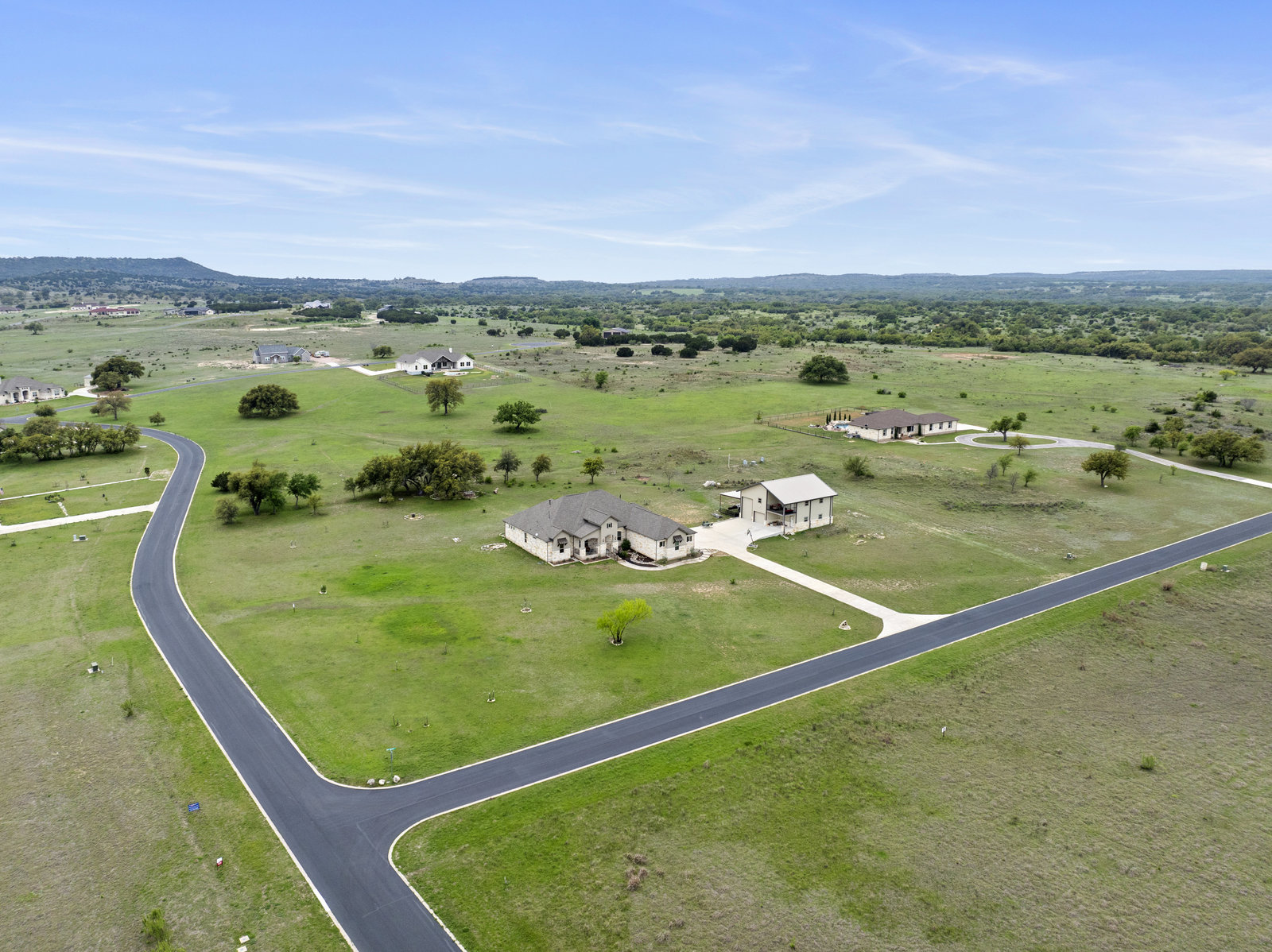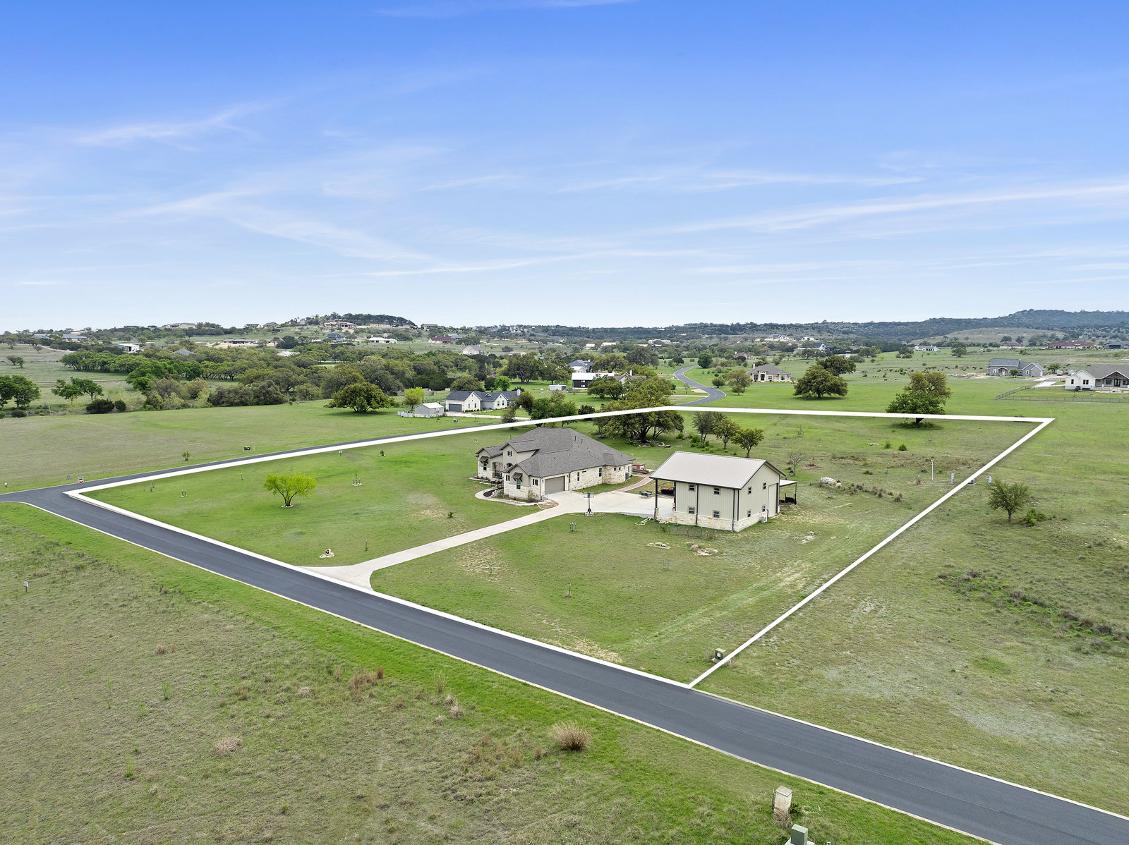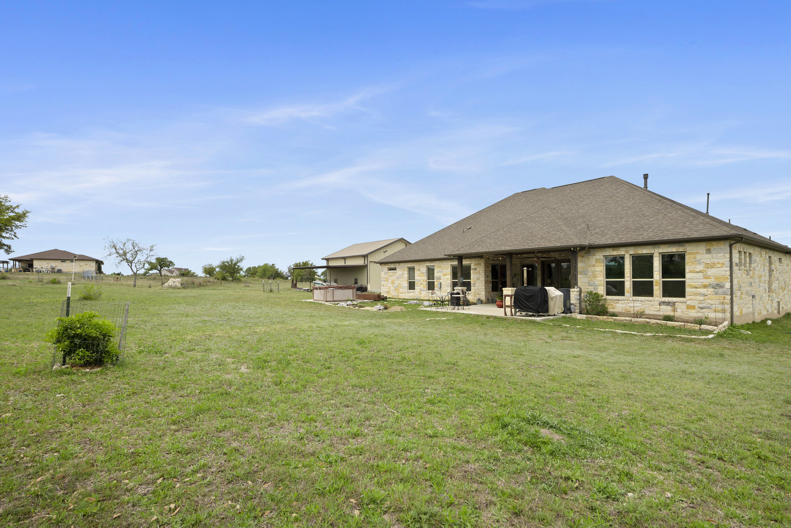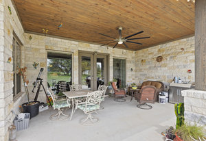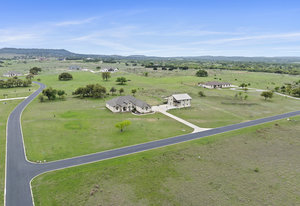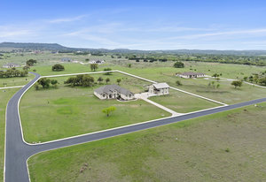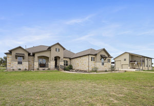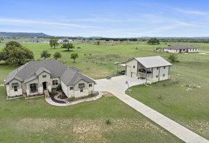 The 5 acre lot allows you both privacy and space to enjoy. As you approach, the striking stone and stucco exterior is a preview for the exceptional craftsmanship that awaits inside. The high end stainless appliances in the kitchen, complemented by a large island, granite counters and custom cabinetry create a gourmet lovers dream space. Walls of windows flood the home with natural light, framing the picturesque views of the surrounding Hill Country landscape. The spacious primary suite boasts an upgraded bath with a soaking tub and walk thru shower. A custom craft room with storage cabinets and sink provides a comfortable & productive environment for remote work or personal projects. A game room located off the main living area offers a place to relax and enjoy with family and friends.