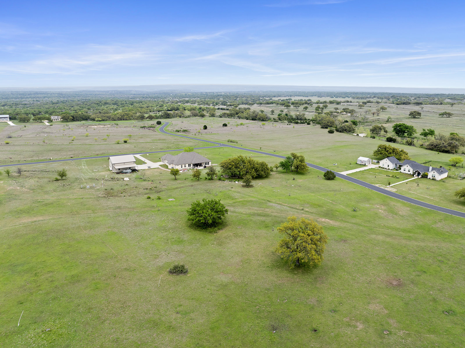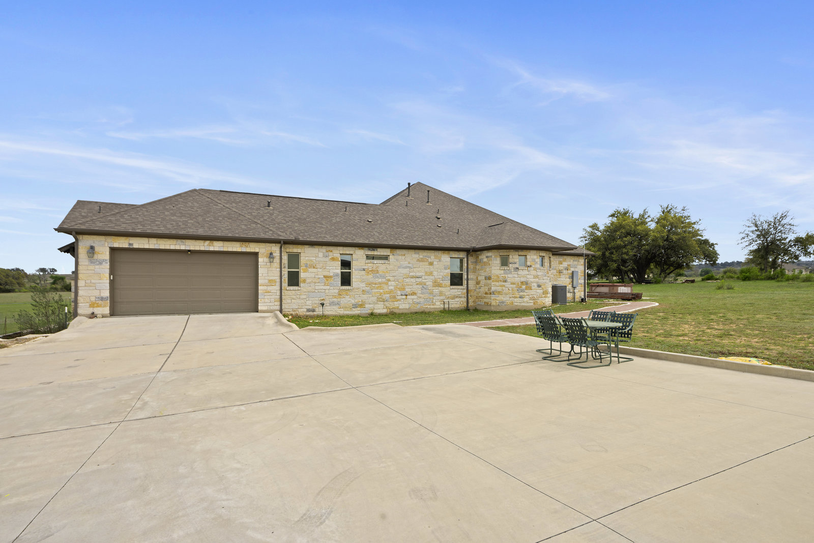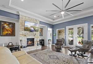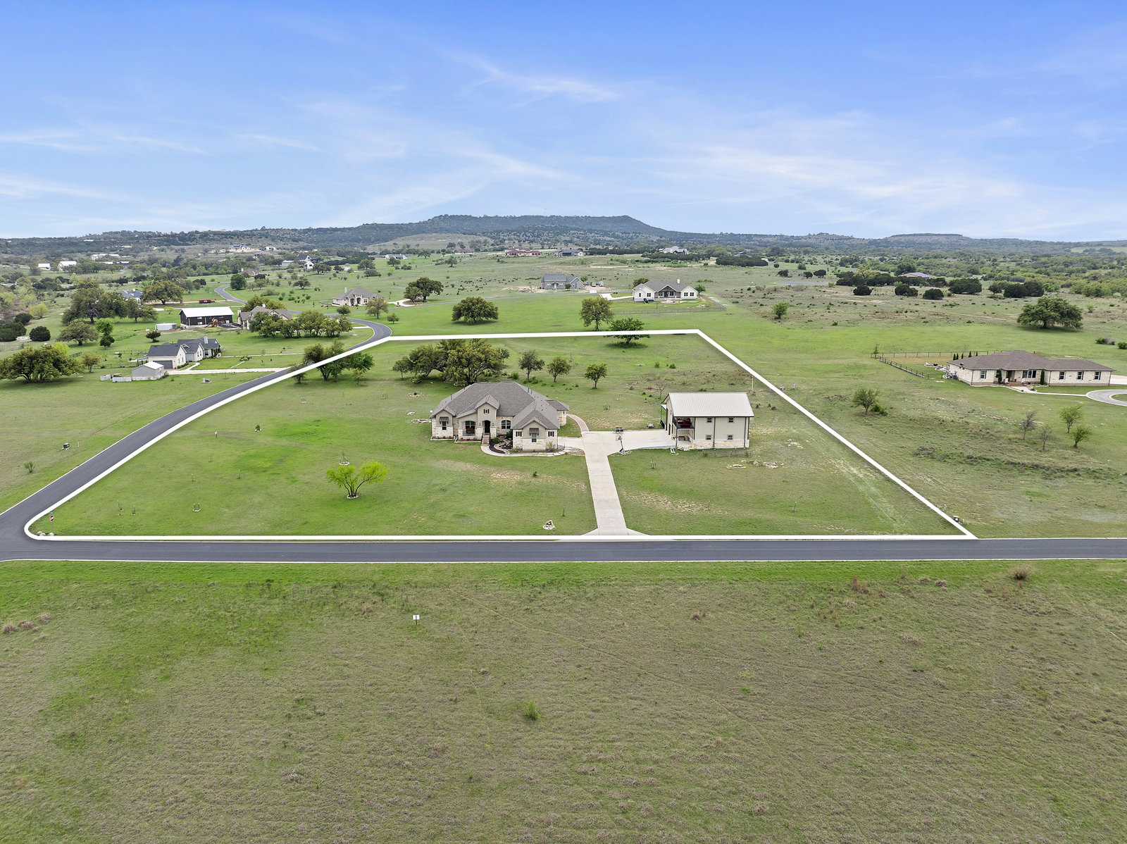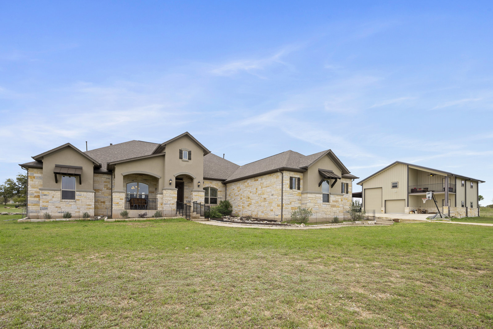 The 5 acre lot allows you both privacy and space to enjoy. As you approach, the striking stone and stucco exterior is a preview for the exceptional craftsmanship that awaits inside. The high end stainless appliances in the kitchen, complemented by a large island, granite counters and custom cabinetry create a gourmet lovers dream space. Walls of windows flood the home with natural light, framing the picturesque views of the surrounding Hill Country landscape. The spacious primary suite boasts an upgraded bath with a soaking tub and walk thru shower. A custom craft room with storage cabinets and sink provides a comfortable & productive environment for remote work or personal projects. A game room located off the main living area offers a place to relax and enjoy with family and friends.