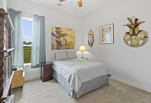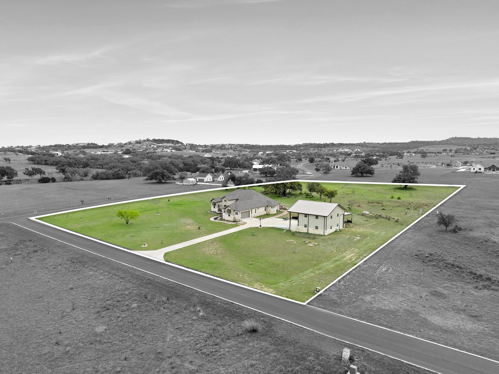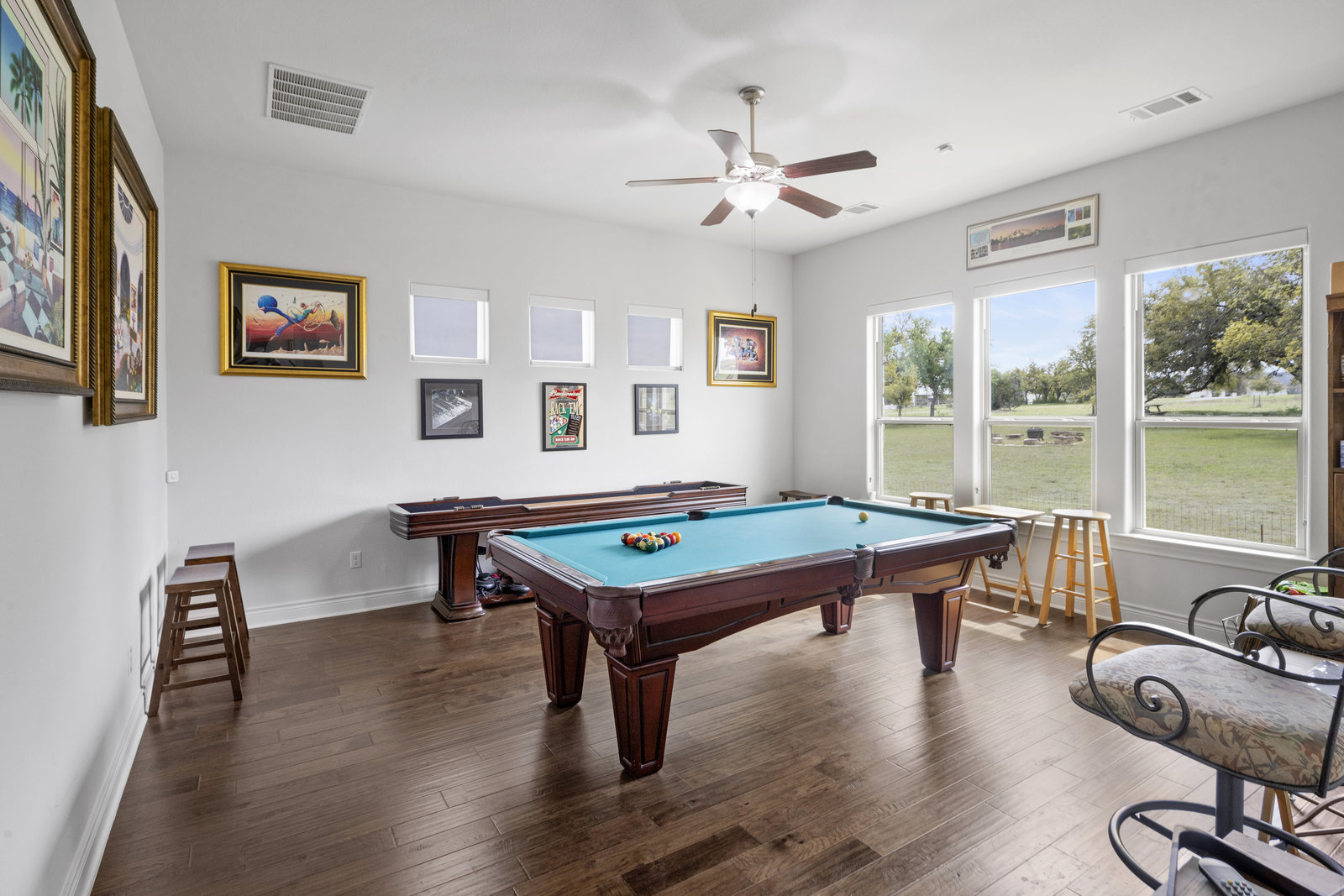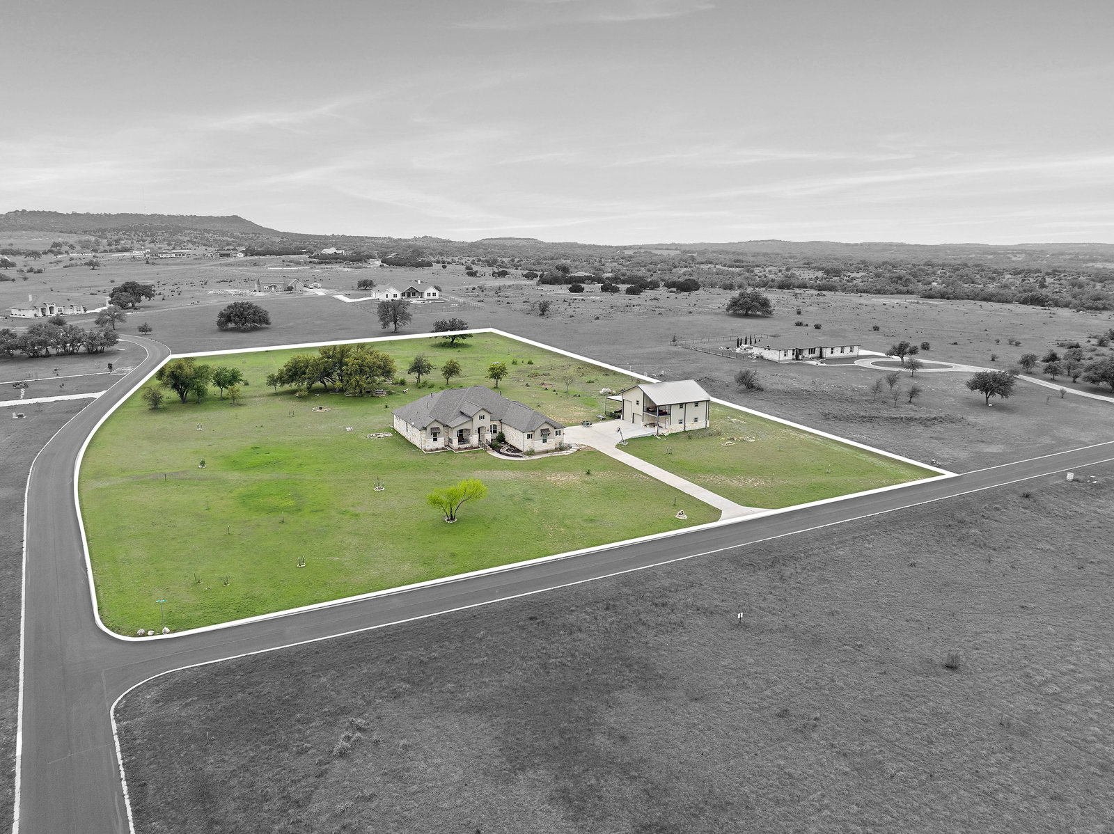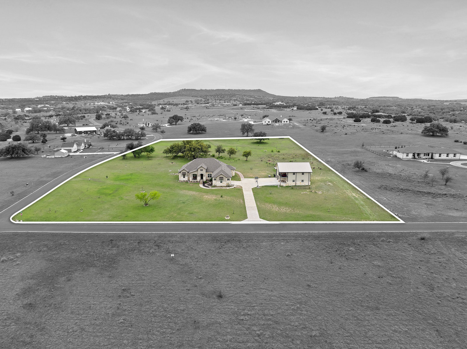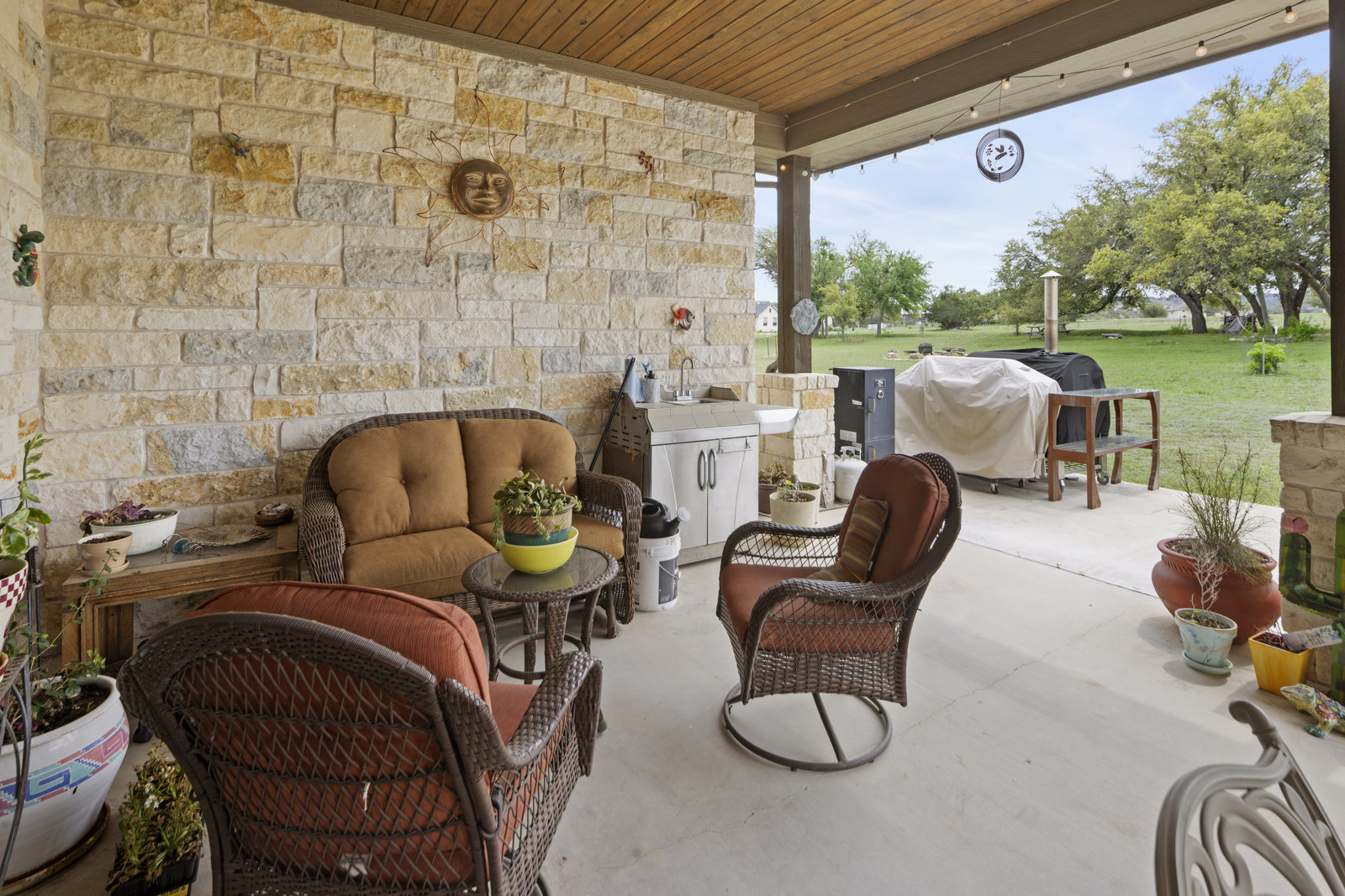 The 5 acre lot allows you both privacy and space to enjoy. As you approach, the striking stone and stucco exterior is a preview for the exceptional craftsmanship that awaits inside. The high end stainless appliances in the kitchen, complemented by a large island, granite counters and custom cabinetry create a gourmet lovers dream space. Walls of windows flood the home with natural light, framing the picturesque views of the surrounding Hill Country landscape. The spacious primary suite boasts an upgraded bath with a soaking tub and walk thru shower. A custom craft room with storage cabinets and sink provides a comfortable & productive environment for remote work or personal projects. A game room located off the main living area offers a place to relax and enjoy with family and friends.
