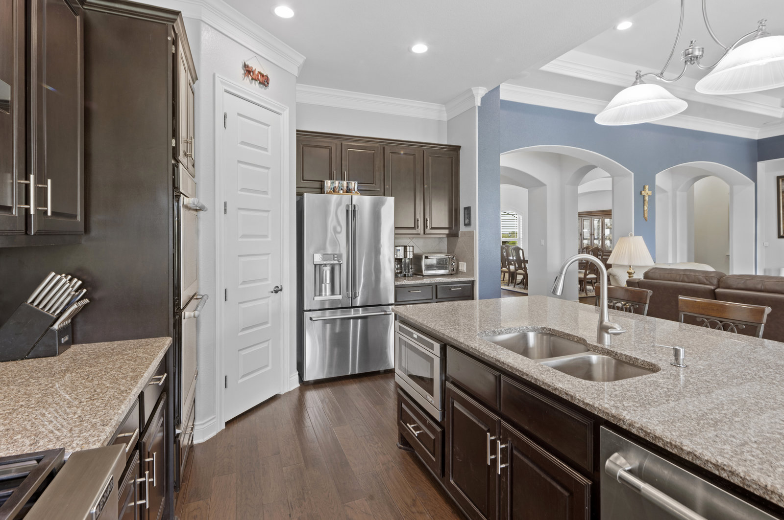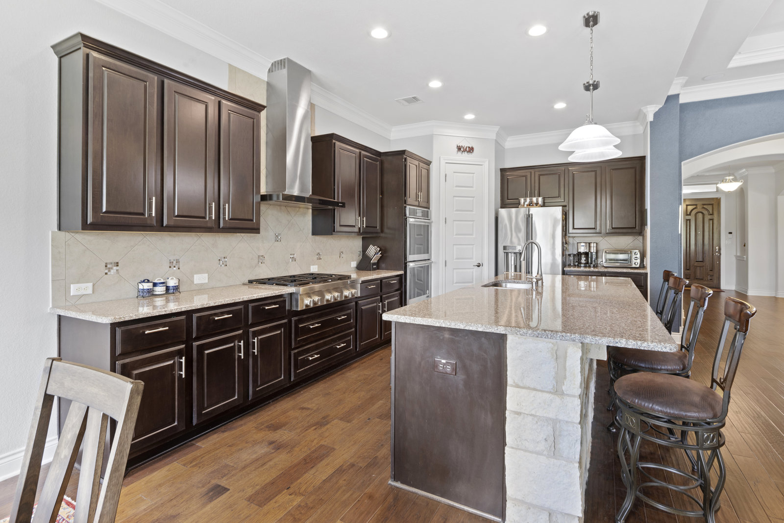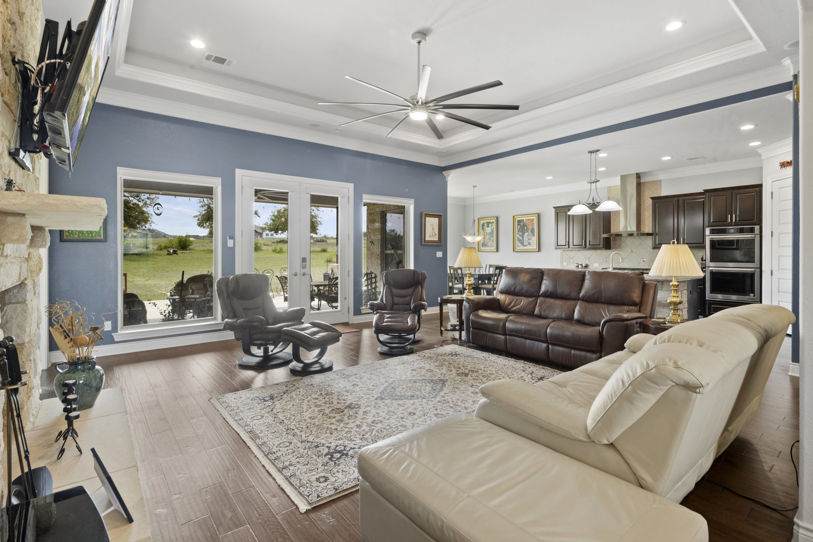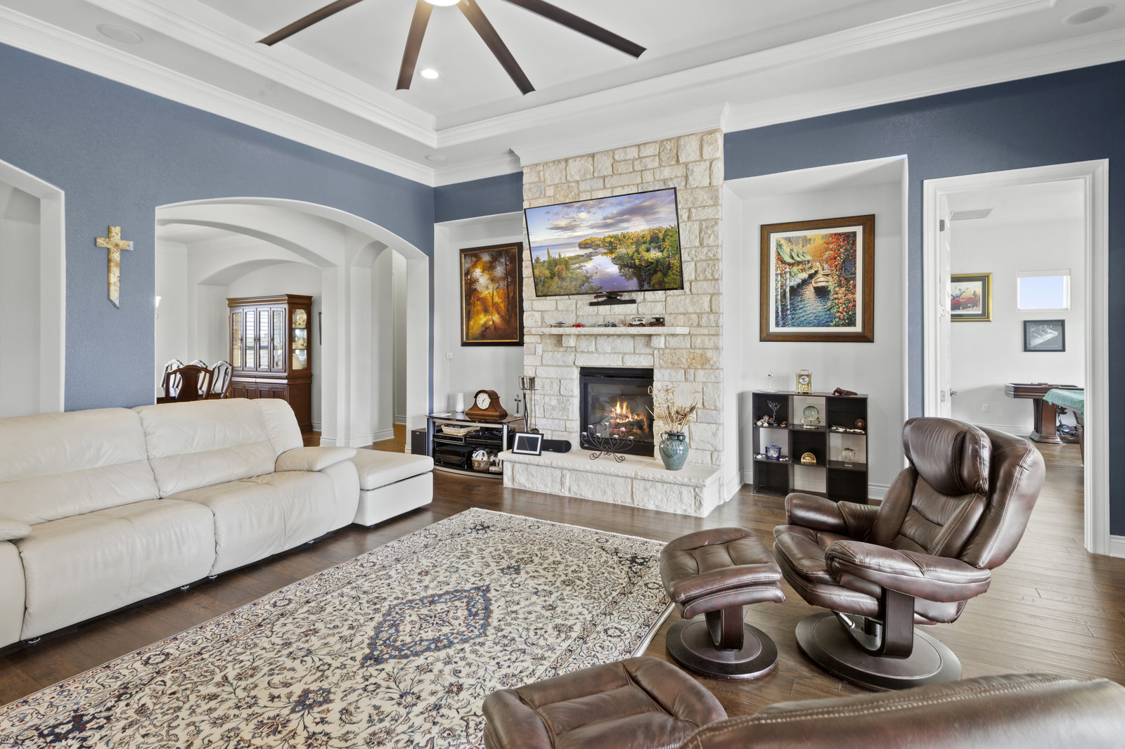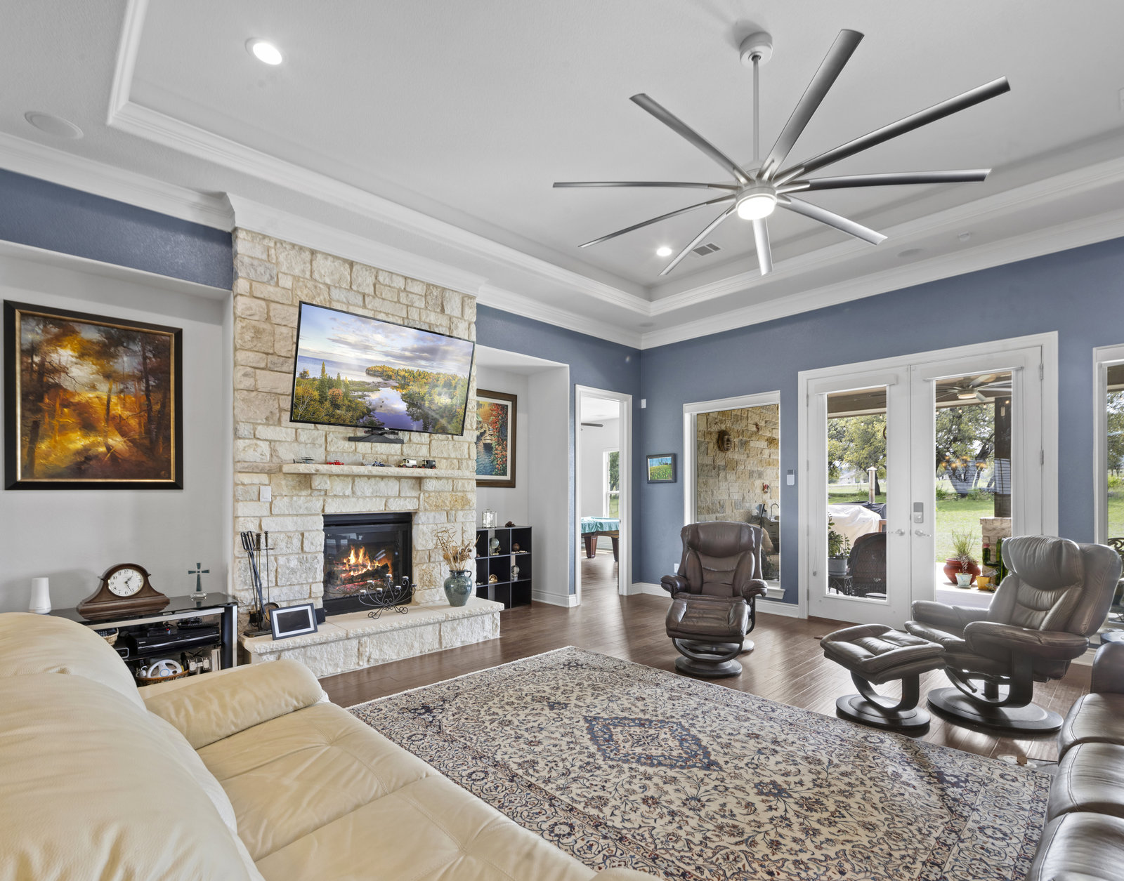 The 5 acre lot allows you both privacy and space to enjoy. As you approach, the striking stone and stucco exterior is a preview for the exceptional craftsmanship that awaits inside. The high end stainless appliances in the kitchen, complemented by a large island, granite counters and custom cabinetry create a gourmet lovers dream space. Walls of windows flood the home with natural light, framing the picturesque views of the surrounding Hill Country landscape. The spacious primary suite boasts an upgraded bath with a soaking tub and walk thru shower. A custom craft room with storage cabinets and sink provides a comfortable & productive environment for remote work or personal projects. A game room located off the main living area offers a place to relax and enjoy with family and friends.