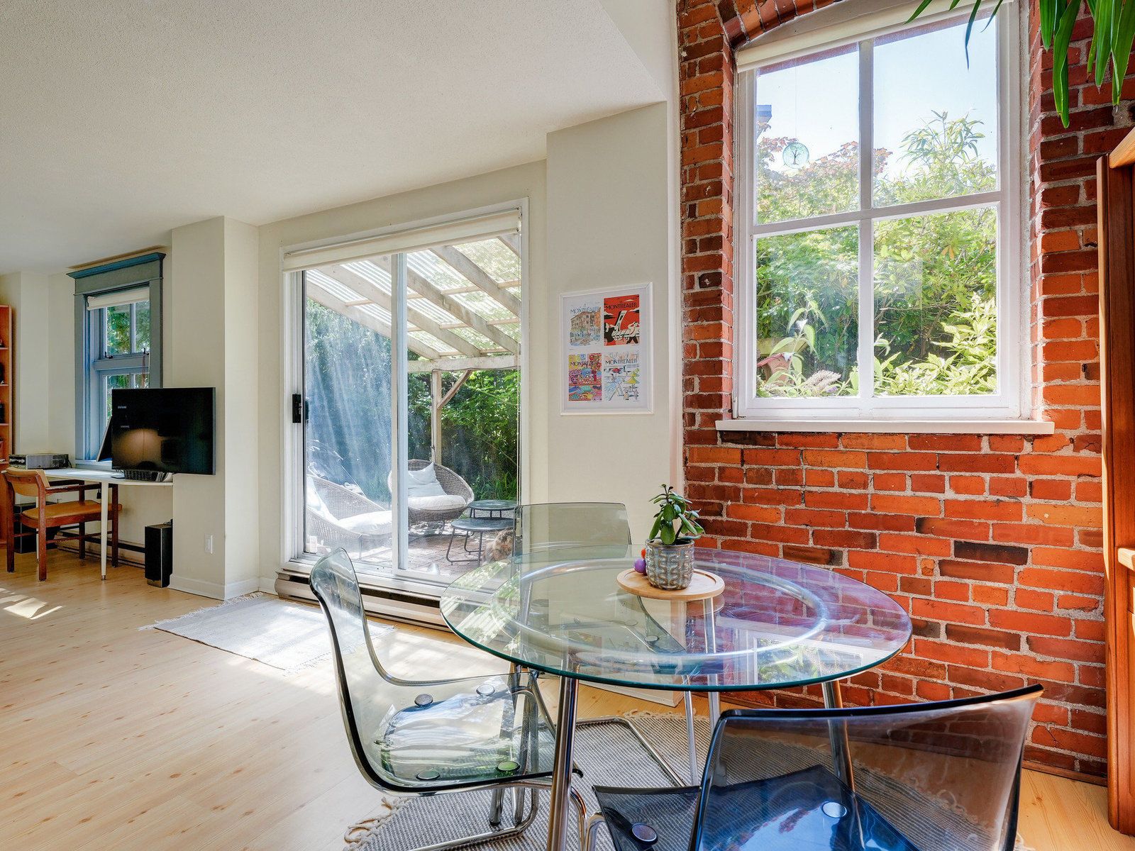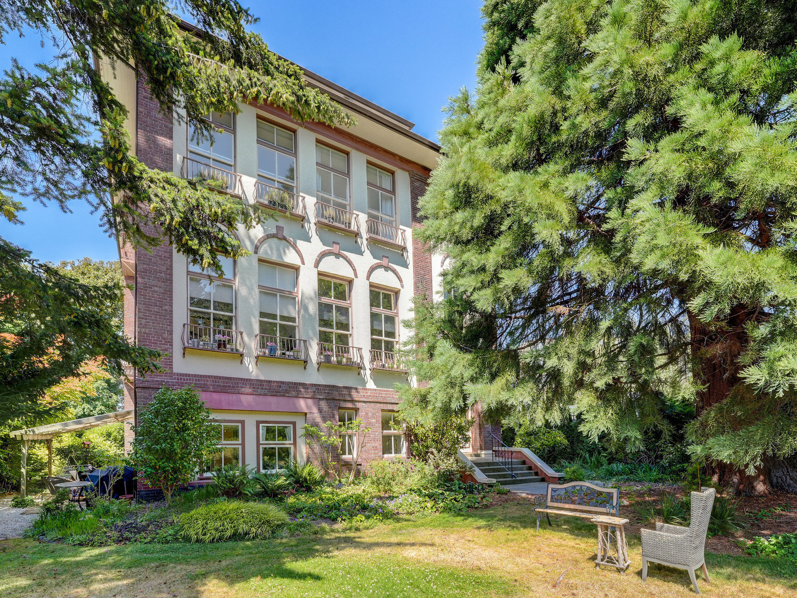 One of Victoria's most unique homes, The "Beacon Hill Schoolhouse" provides a combination of architectural and historical significance paired with an unbeatable location. Nestled in the heart of James Bay, just steps from Beacon Hill Park and the Salish Sea off Dallas Road. This bright and spacious 1-bedroom plus den unit is full of character, featuring high ceilings, exposed brick walls, and large windows that create a bright and tranquil space. The living room includes a cozy reading nook and sliding doors that open onto a picturesque, south-facing patio. The adjacent covered patio and secluded front garden provide ample space for hosting family and friends, while also offering easy...