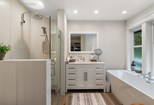 Hunter Douglas blinds, on-demand hot water system, generous walk-in closets with quality organizers, large laundry room with freezer, a huge garden shed, and a completely private outdoor shower. Heated Floors in laundry and upstairs bathrooms, and a 6 zone Wi-Fi controlled underground sprinkler system. All conveniently located within walking distance of Broadmead Center and all amenities, including schools, parks, and transit.